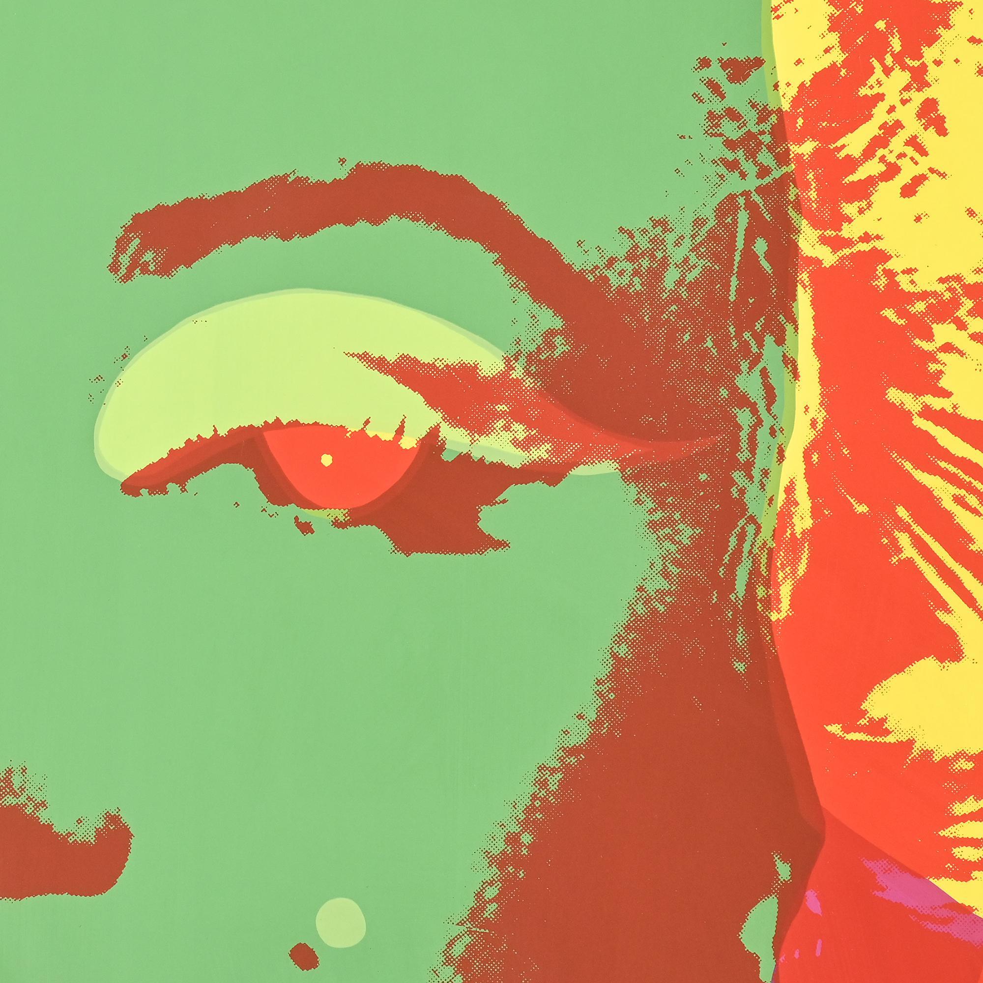 The composition is built through the superimposition of bold color fields, acid green, bright yellow, red and pink, combined with clearly visible mechanical halftone patterns. Facial features appear intentionally fragmented, with areas of saturation, misregistration and uneven texture, all characteristic of Warhol's screenprinting process. Variations in ink density and surface effects, particularly in the hair and facial contours, confirm a multi-layer silkscreen technique.