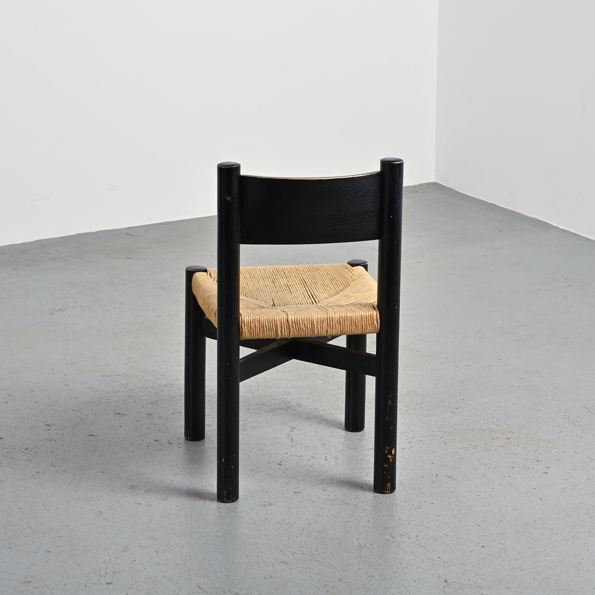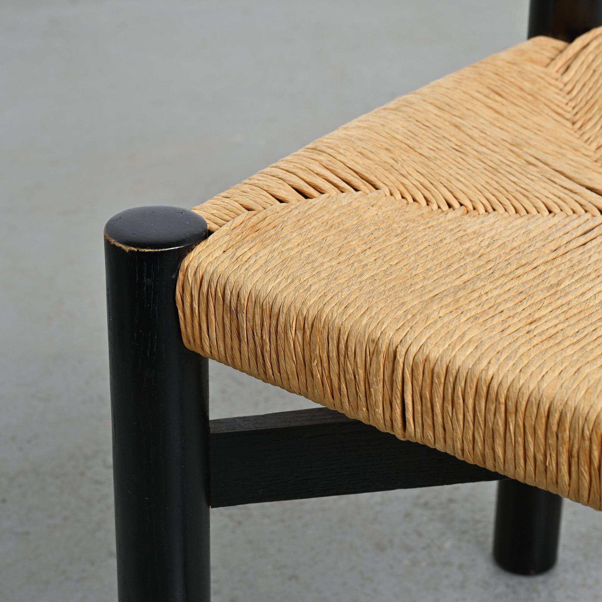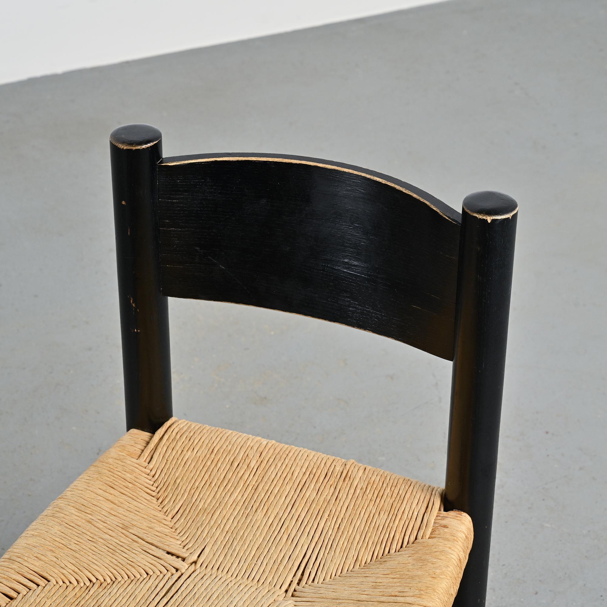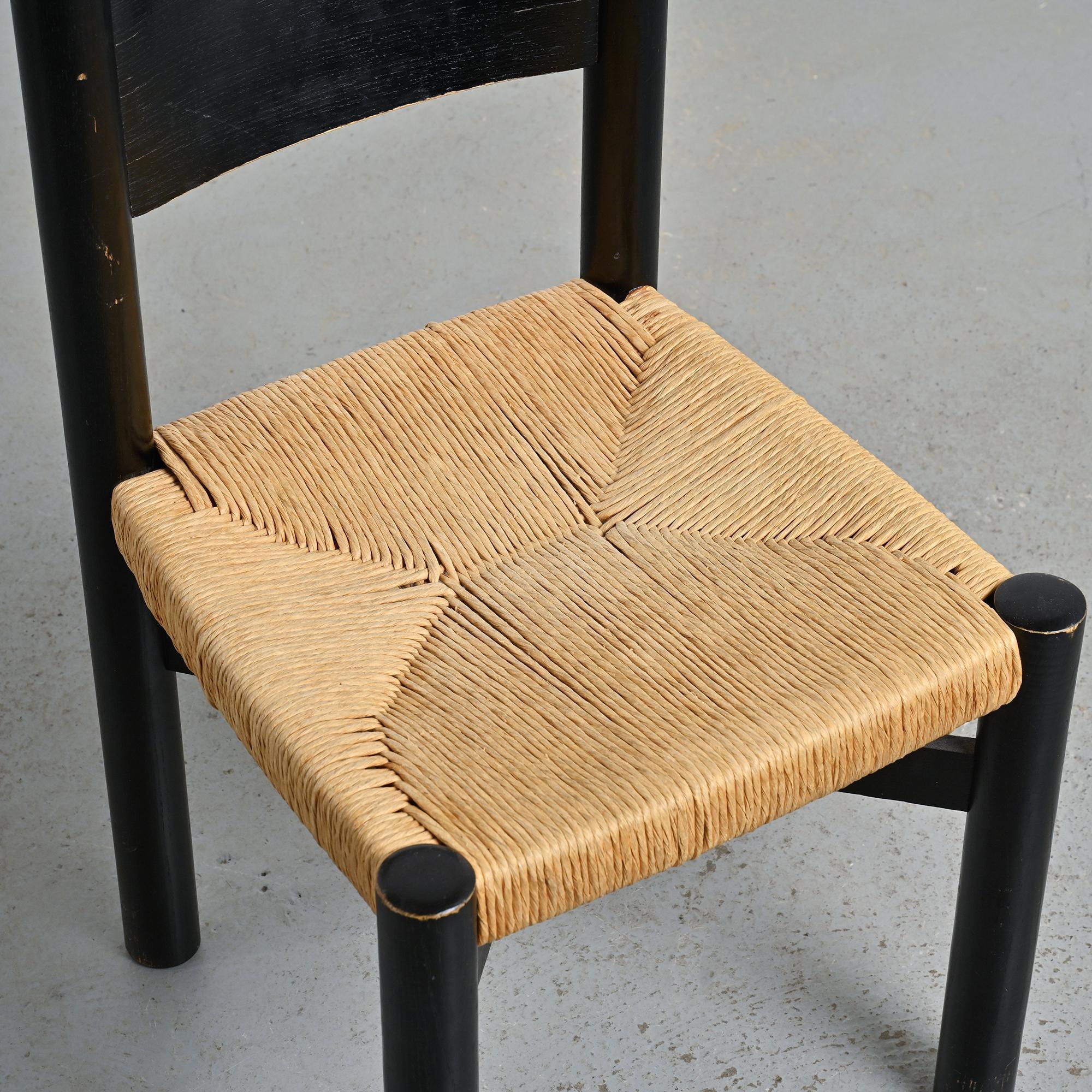 Made of black stained ash with a woven straw seat, it features rounded legs connected by crossbars. A sturdy and essential model typical of Perriand's mountain furniture. Here is a slightly smaller model