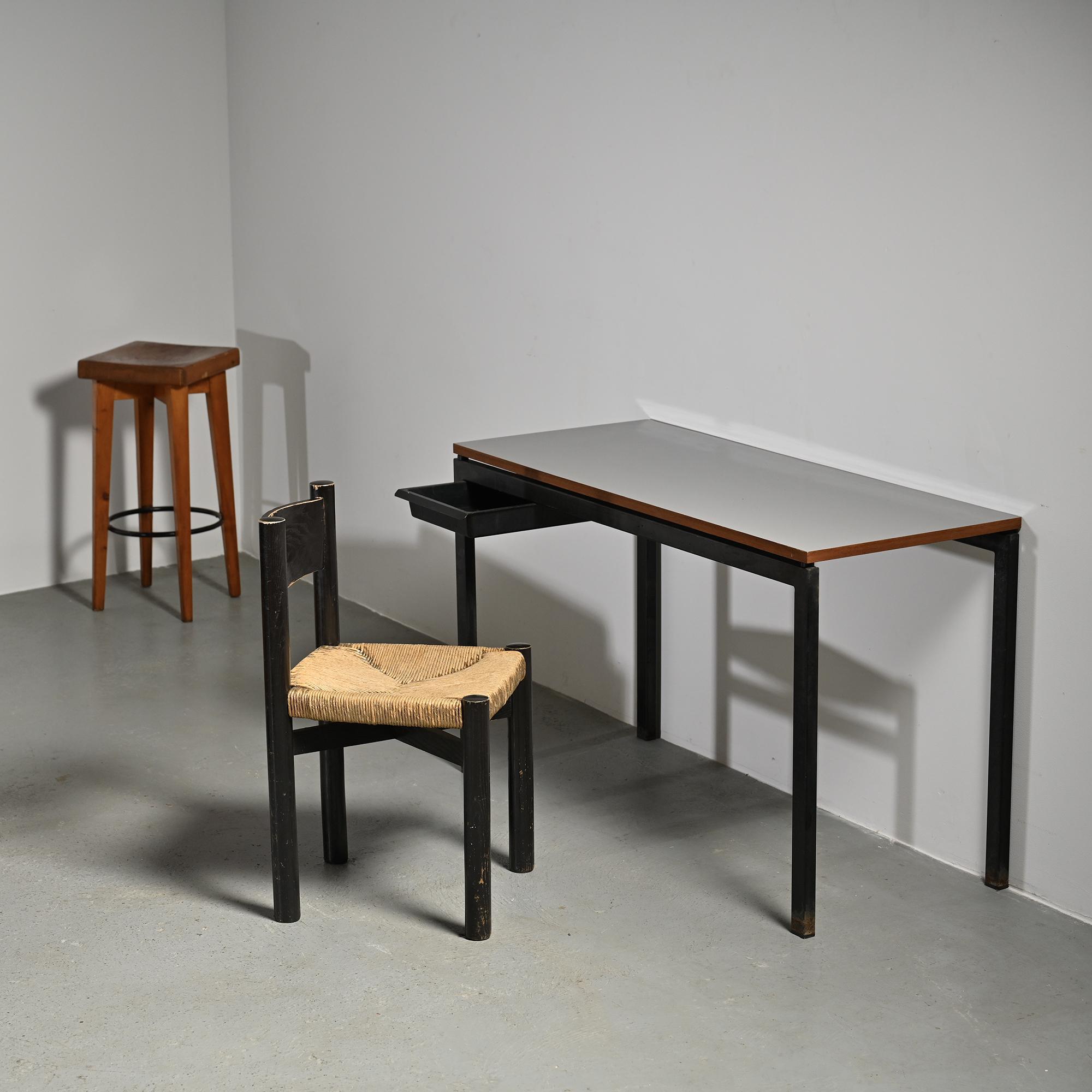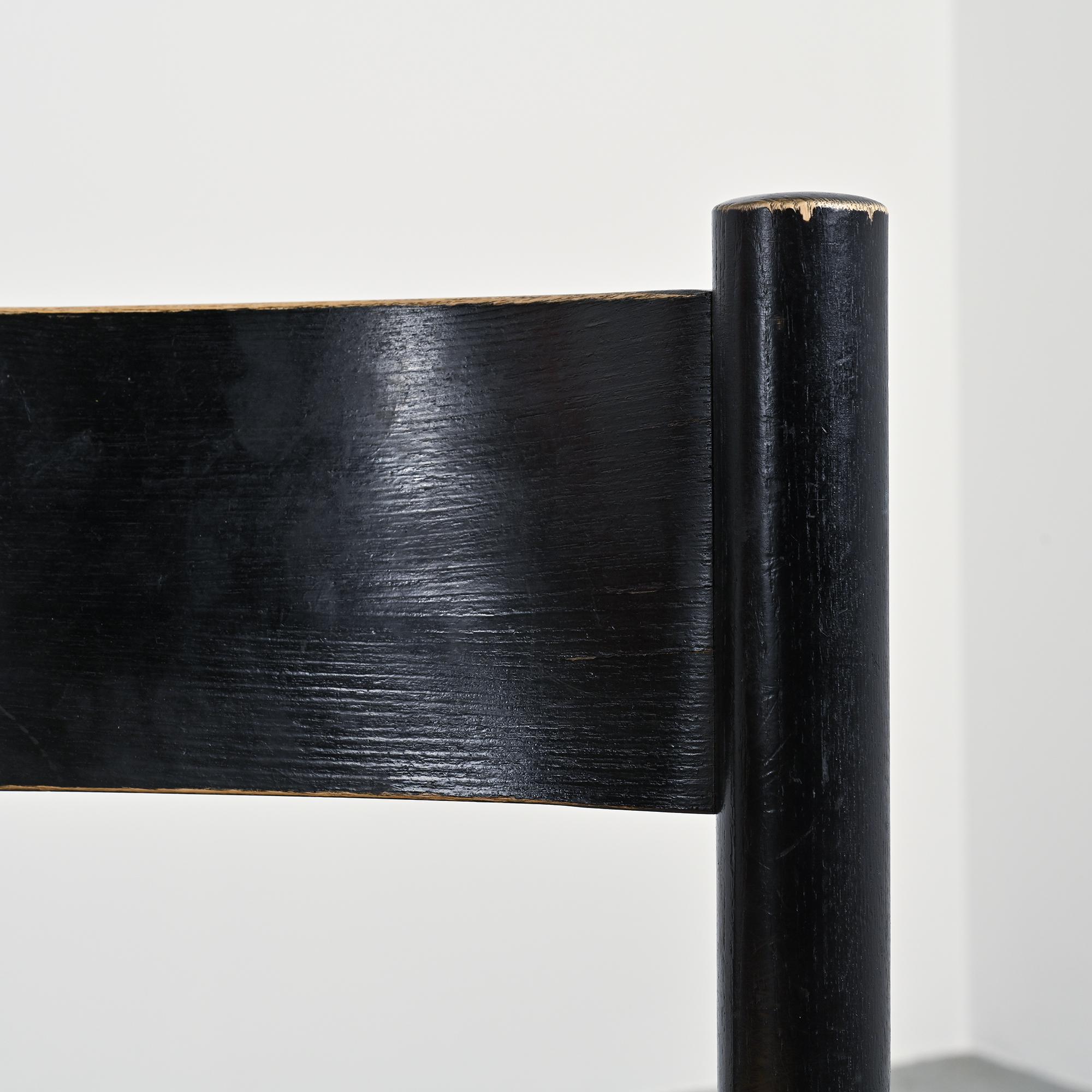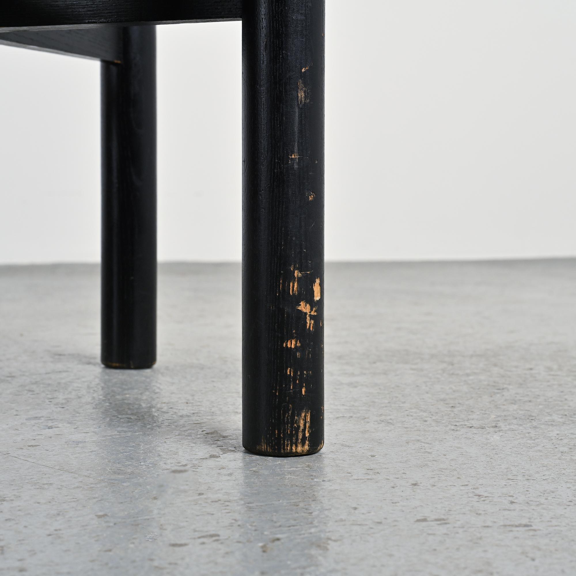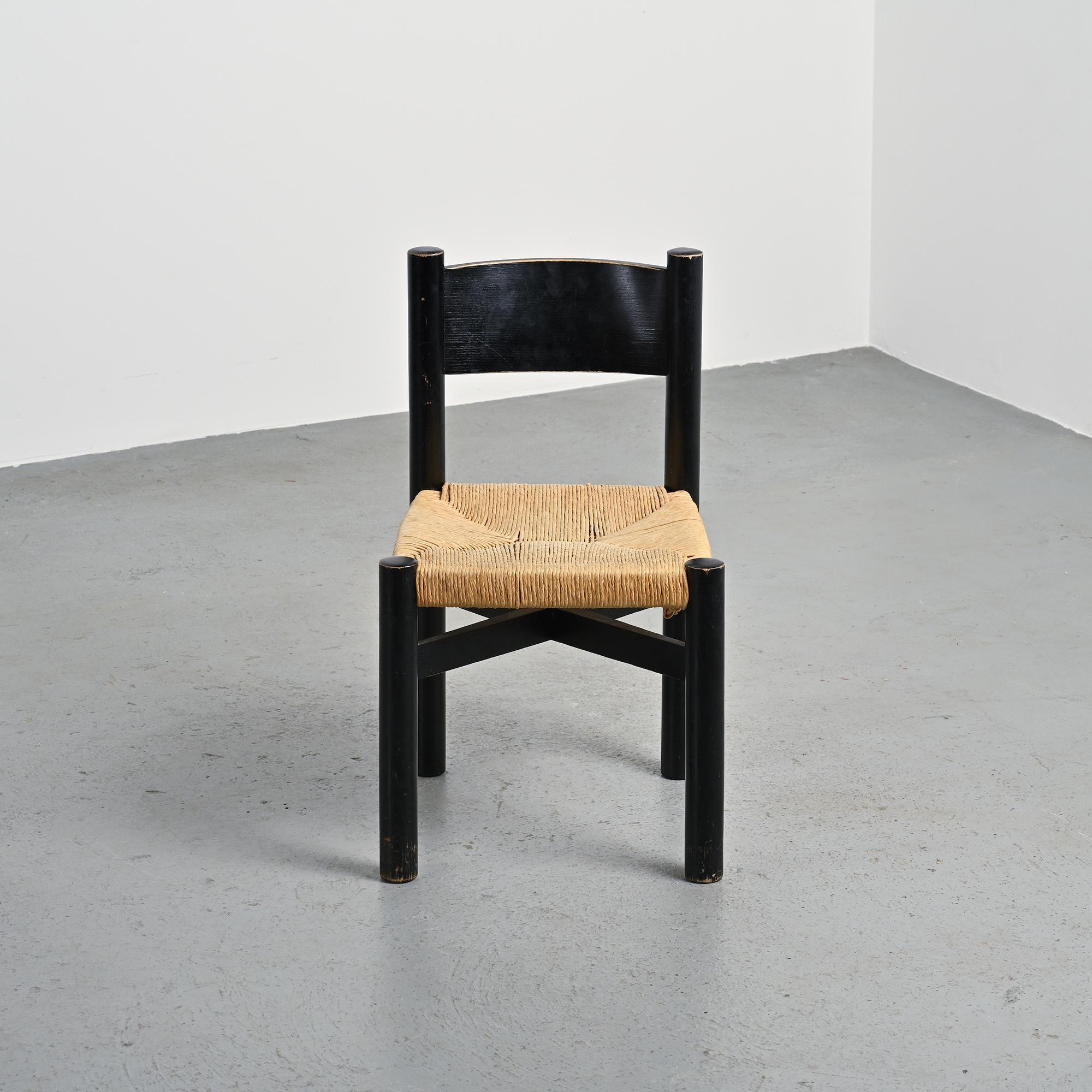 Made of black stained ash with a woven straw seat, it features rounded legs connected by crossbars. A sturdy and essential model typical of Perriand's mountain furniture. Here is a slightly smaller model