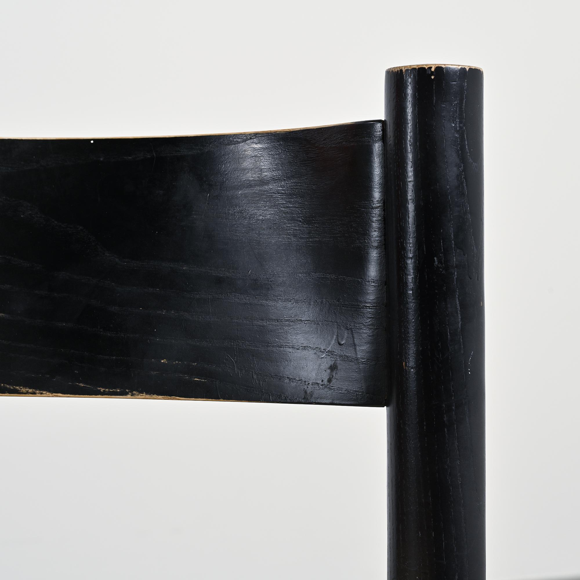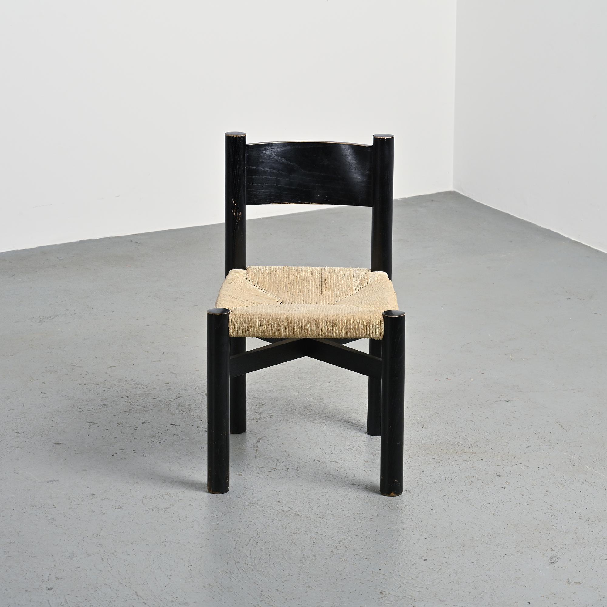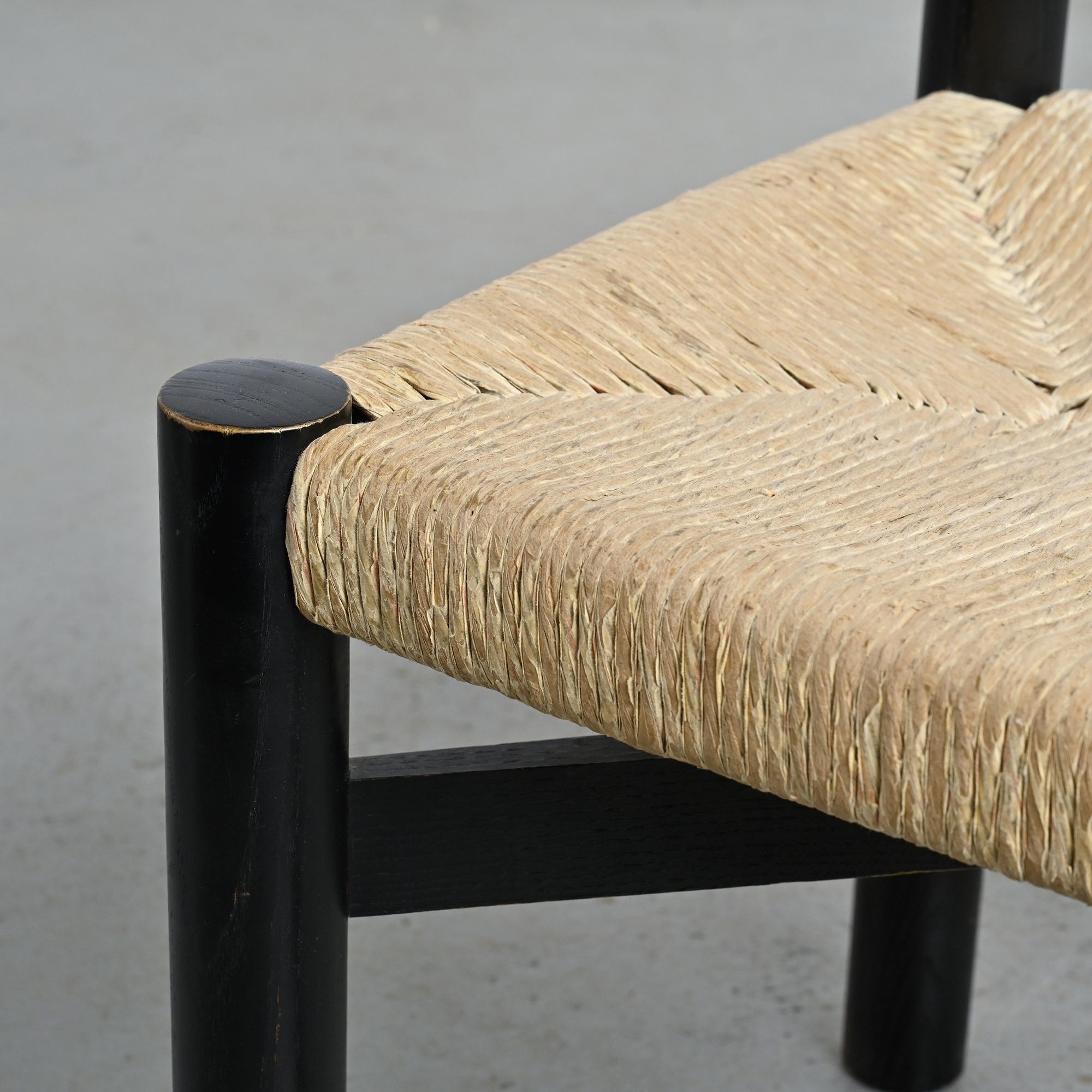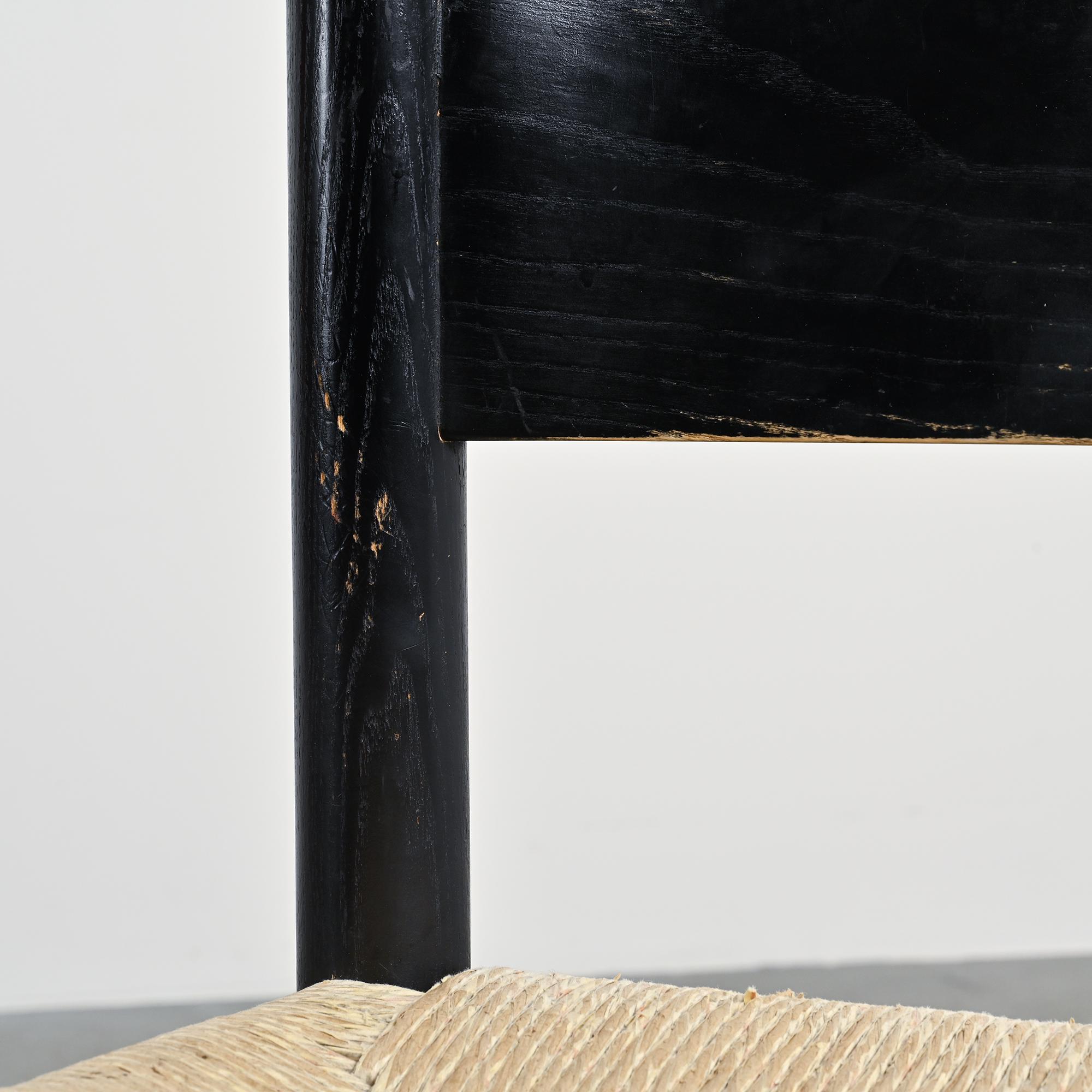 Made of black stained ash with a woven straw seat, it features rounded legs and a robust construction characteristic of Perriand's alpine furniture.