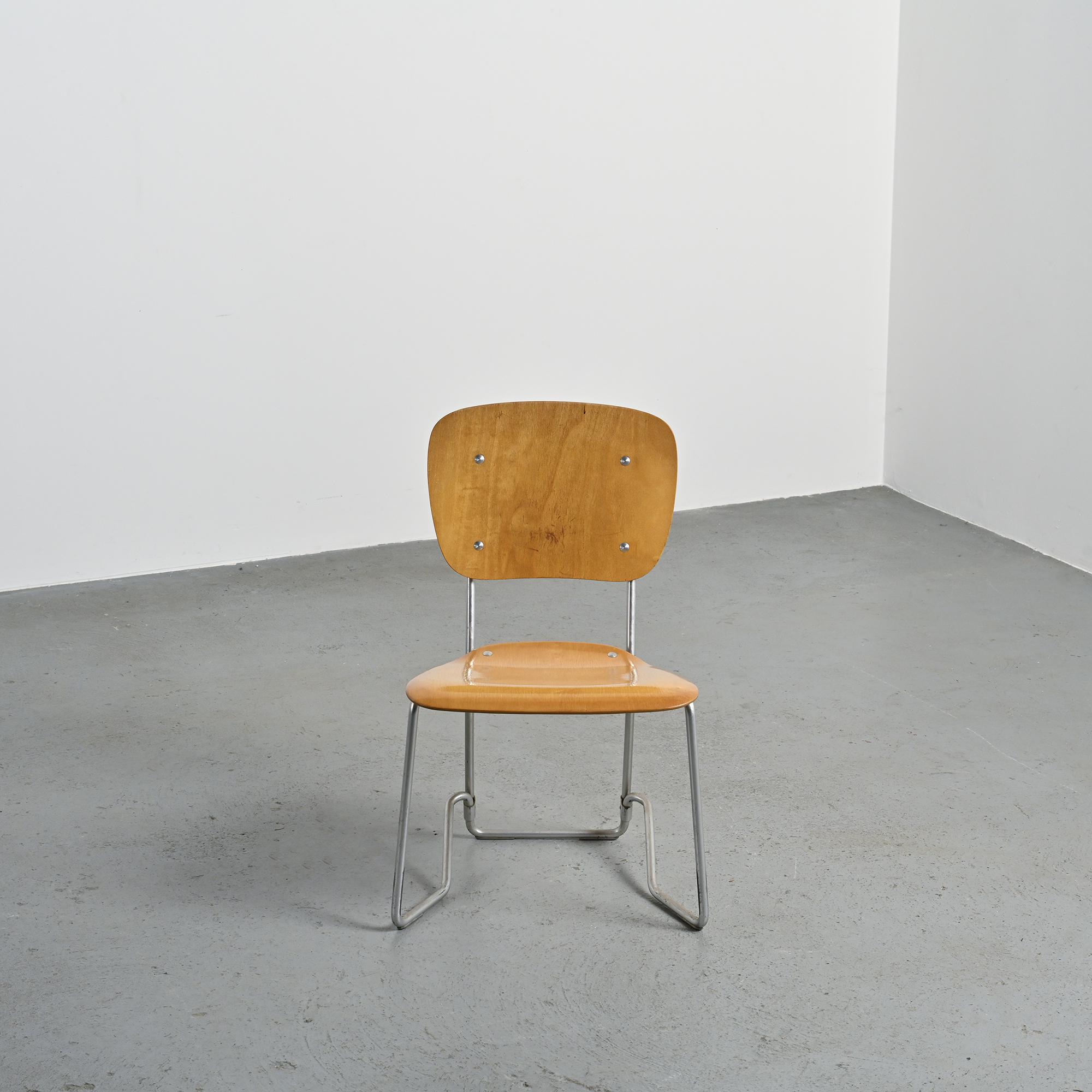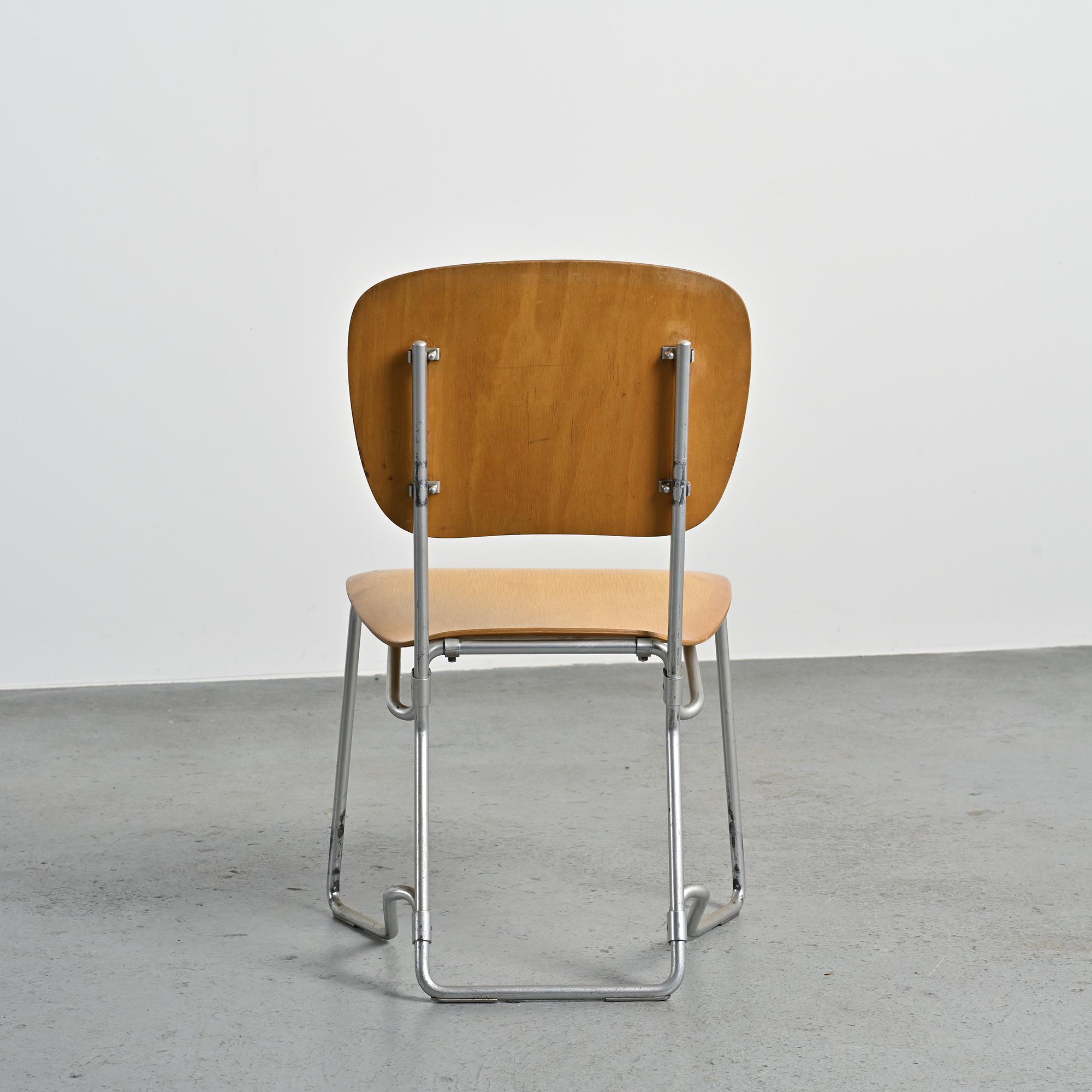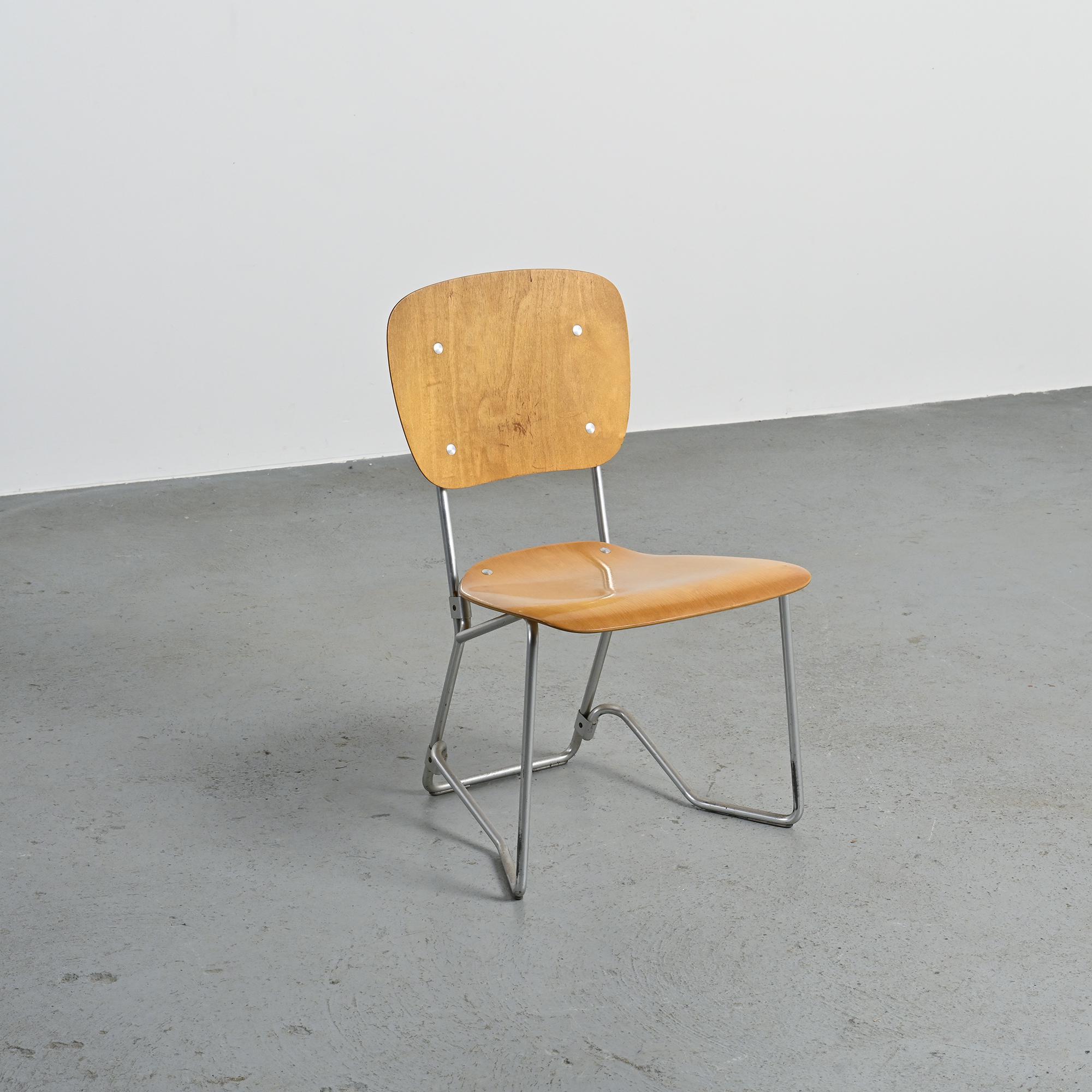 Originally designed for a school, they are stackable: their base is in cast aluminium, the seat and backrest in molded plywood.