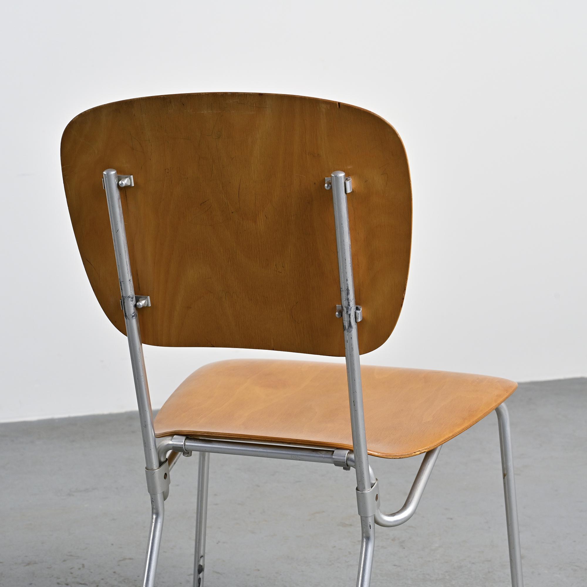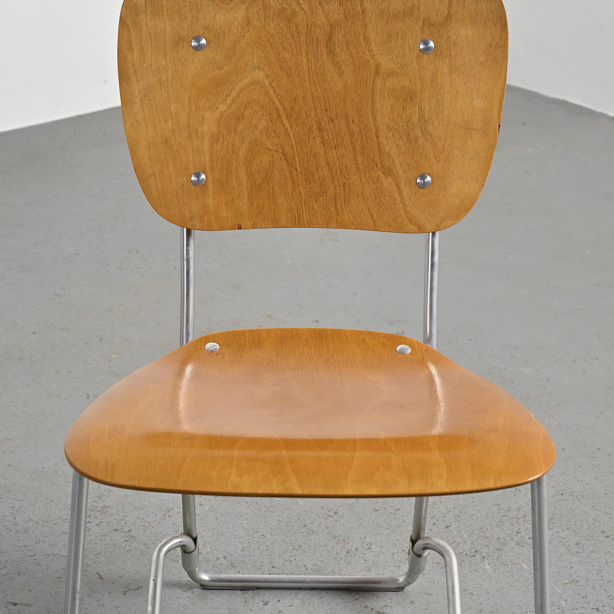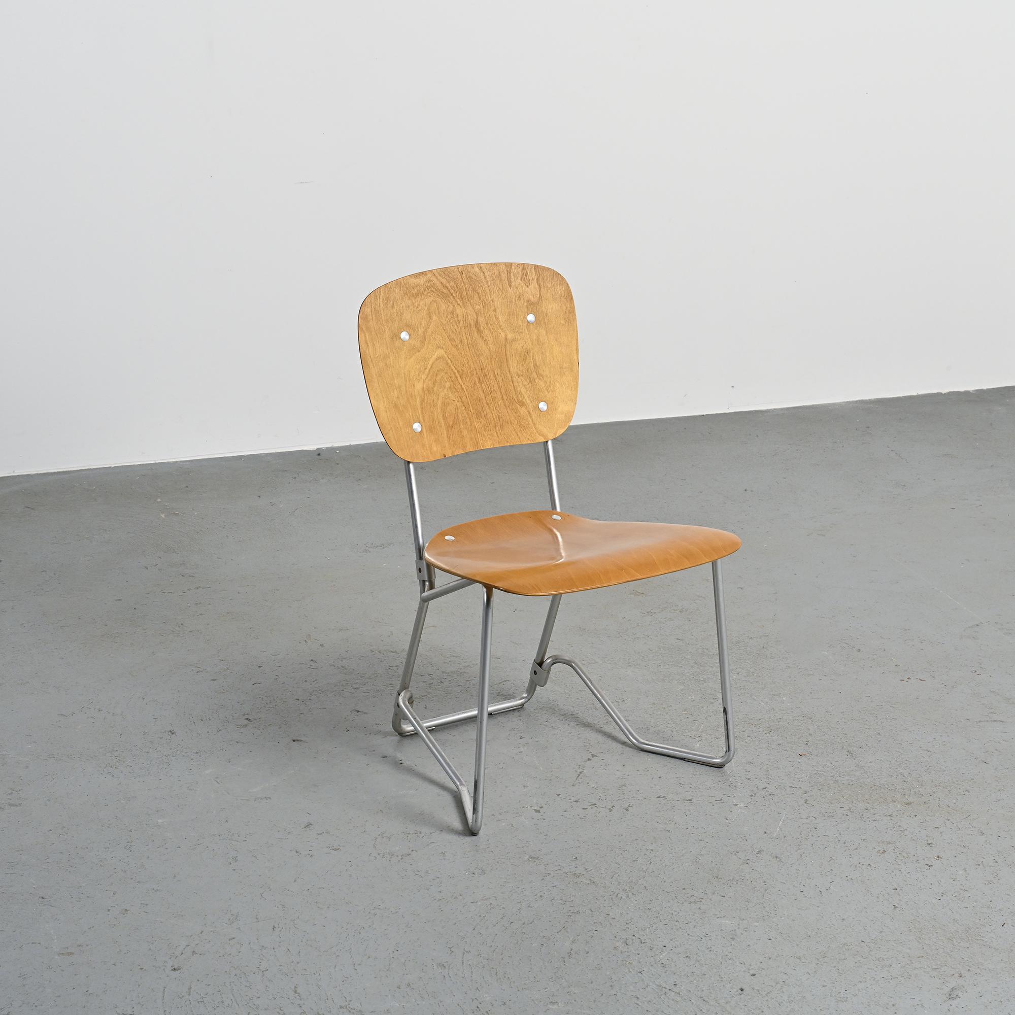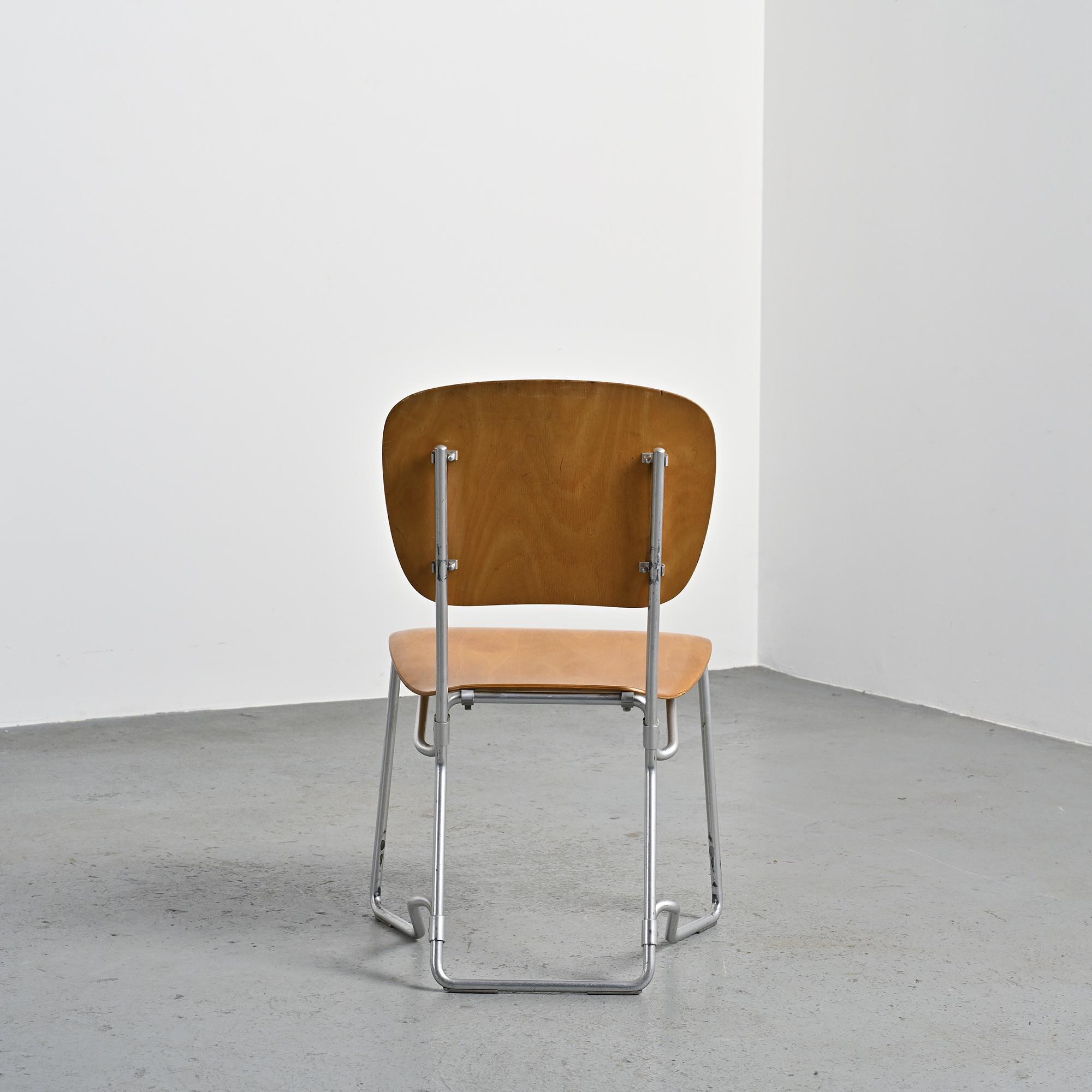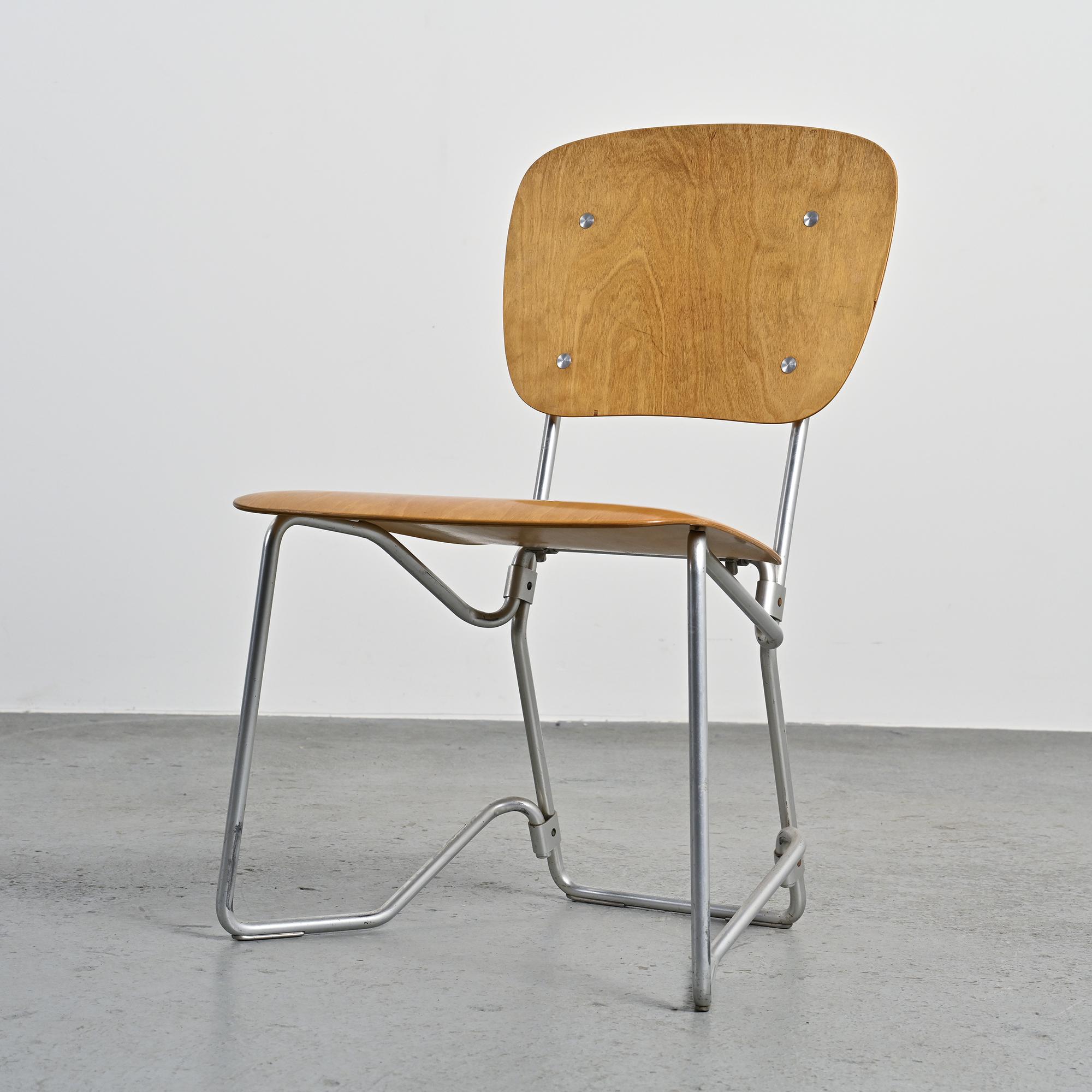 Originally developed for educational use, these stackable chairs combine a cast aluminium base with a molded plywood seat and backrest. The design is characterized by visual lightness and understated simplicity.