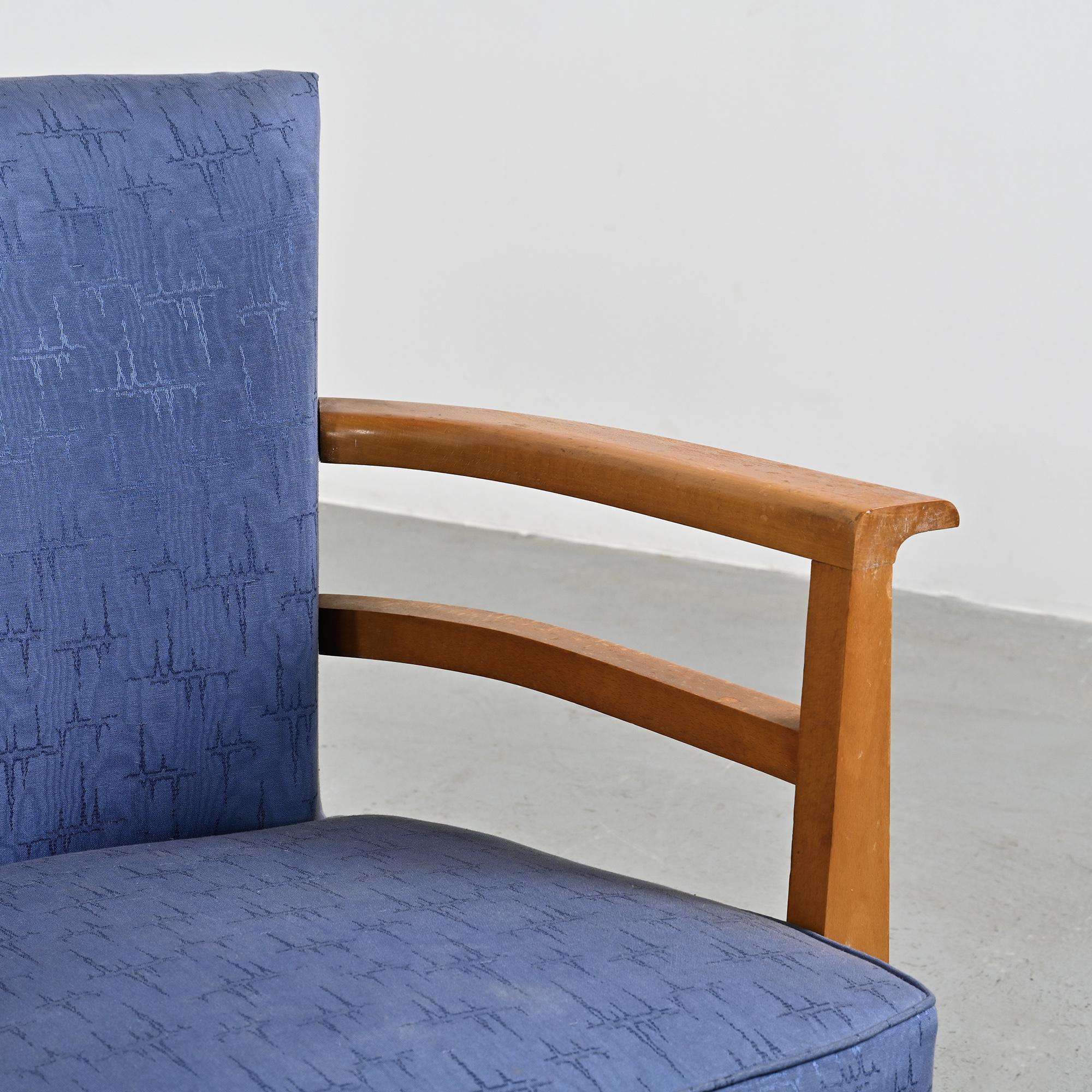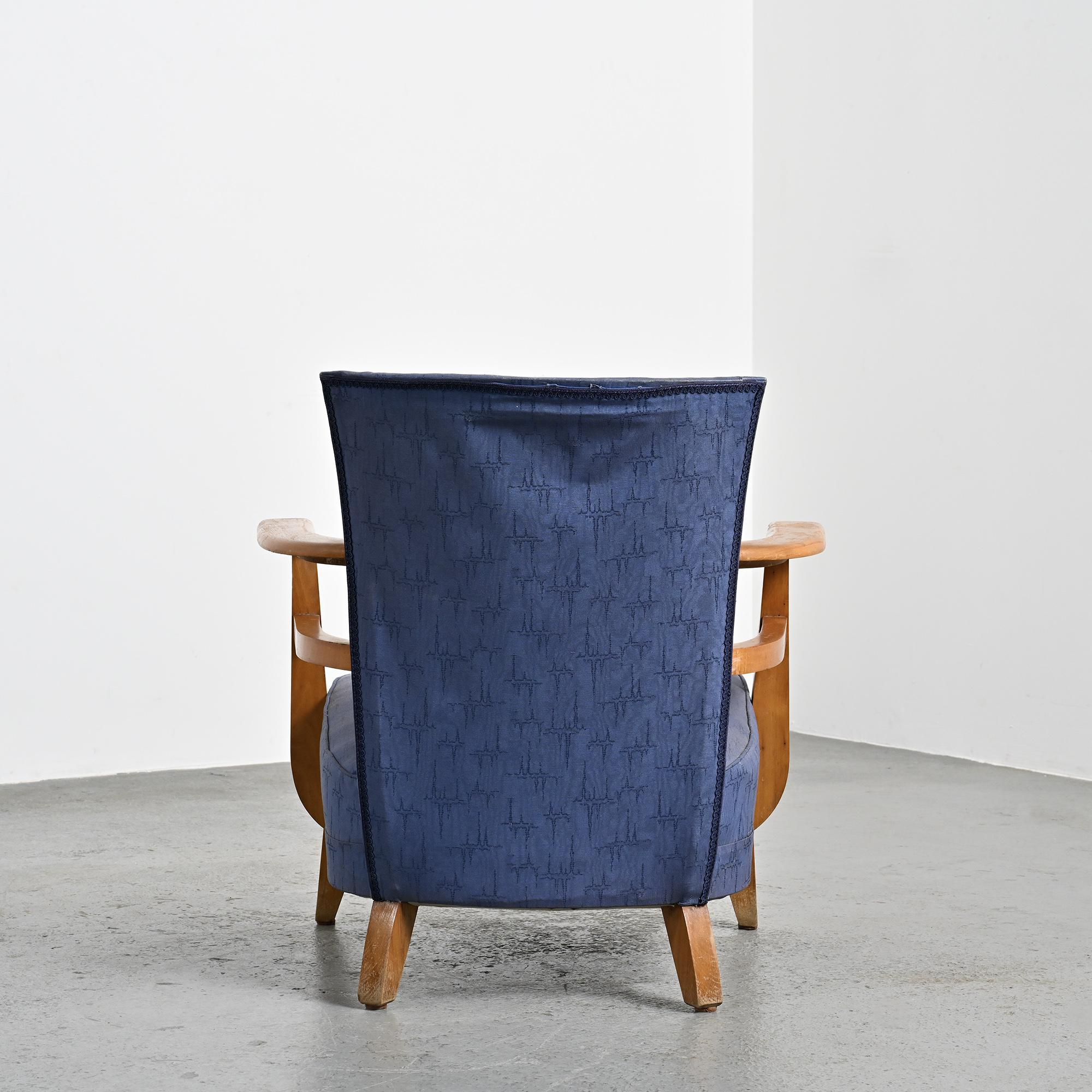 The silhouette is balanced and restrained, without unnecessary ornament. The construction remains clearly legible, where the curve of the armrests interacts with the firm geometry of the base. A representative example of French Reconstruction period seating.