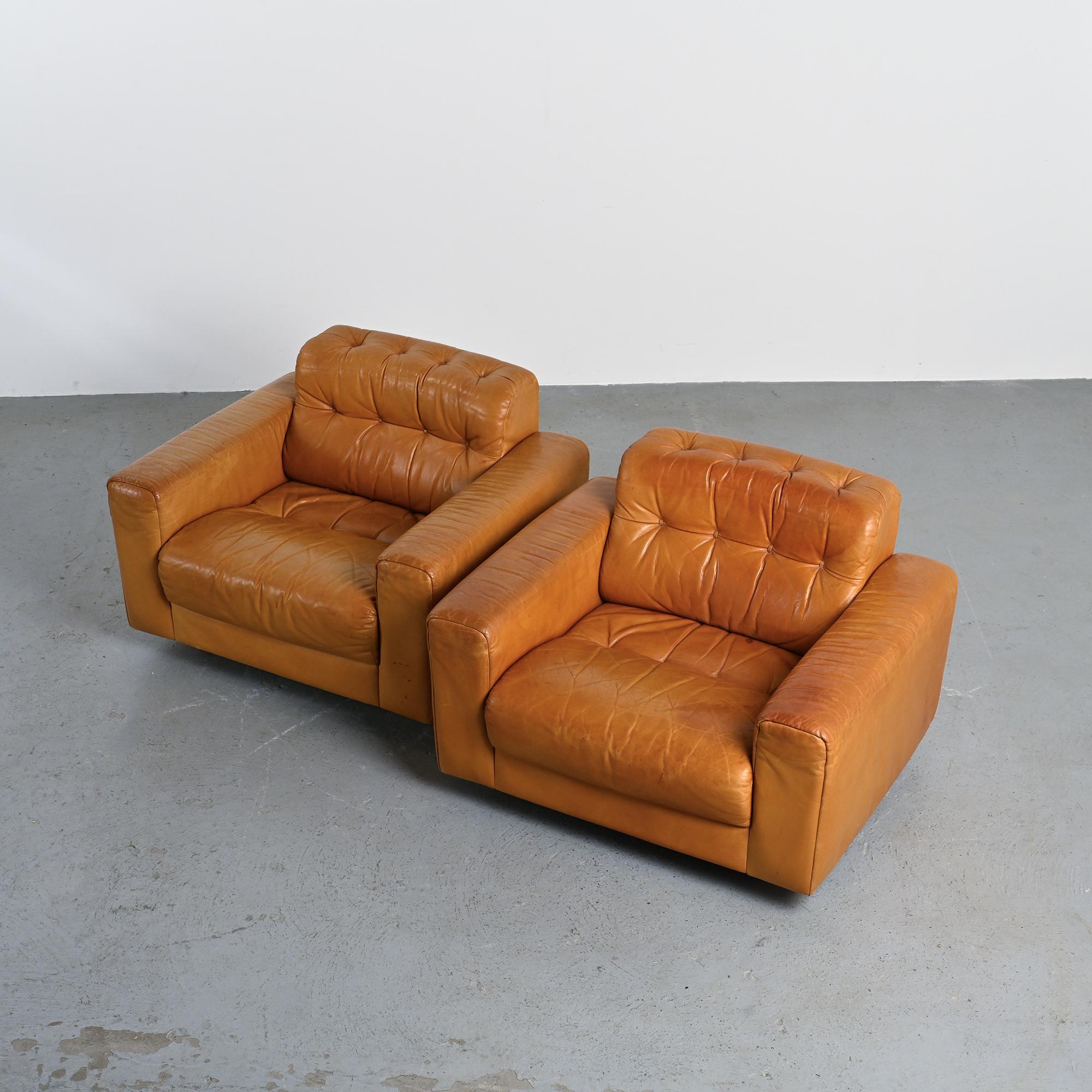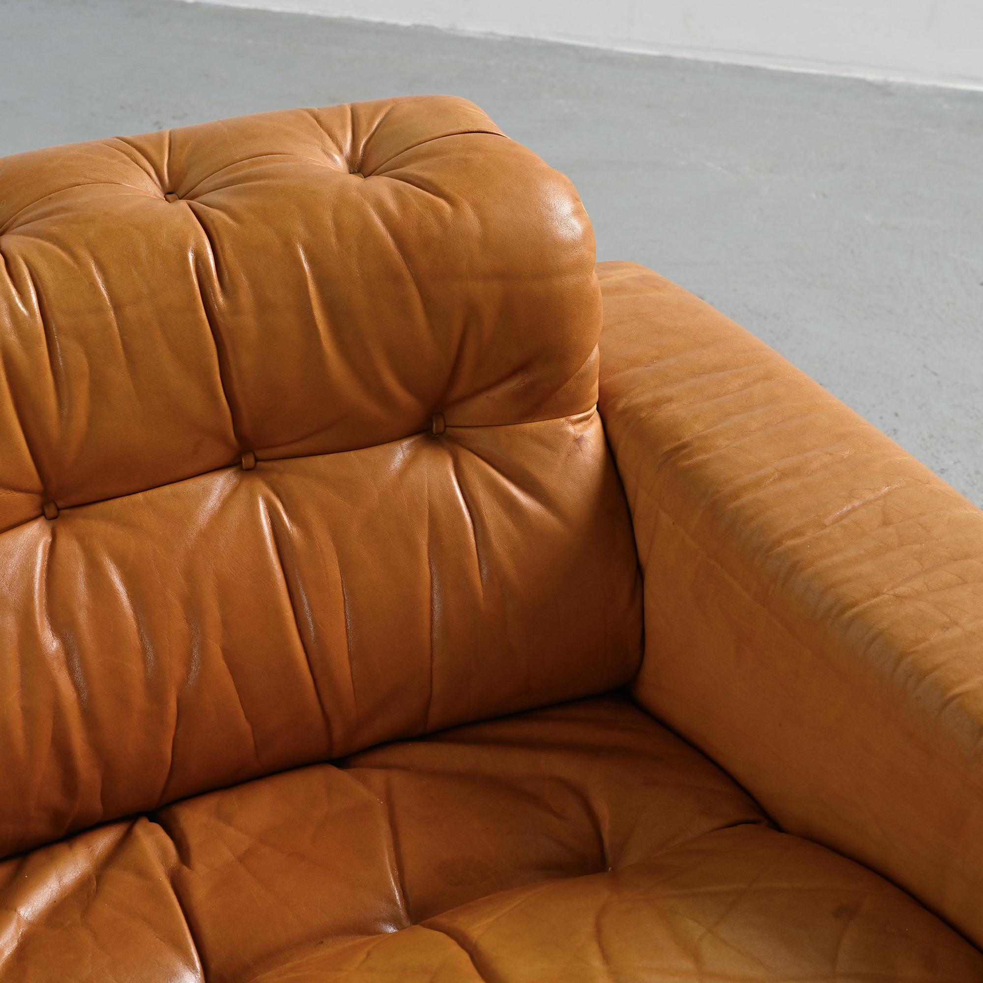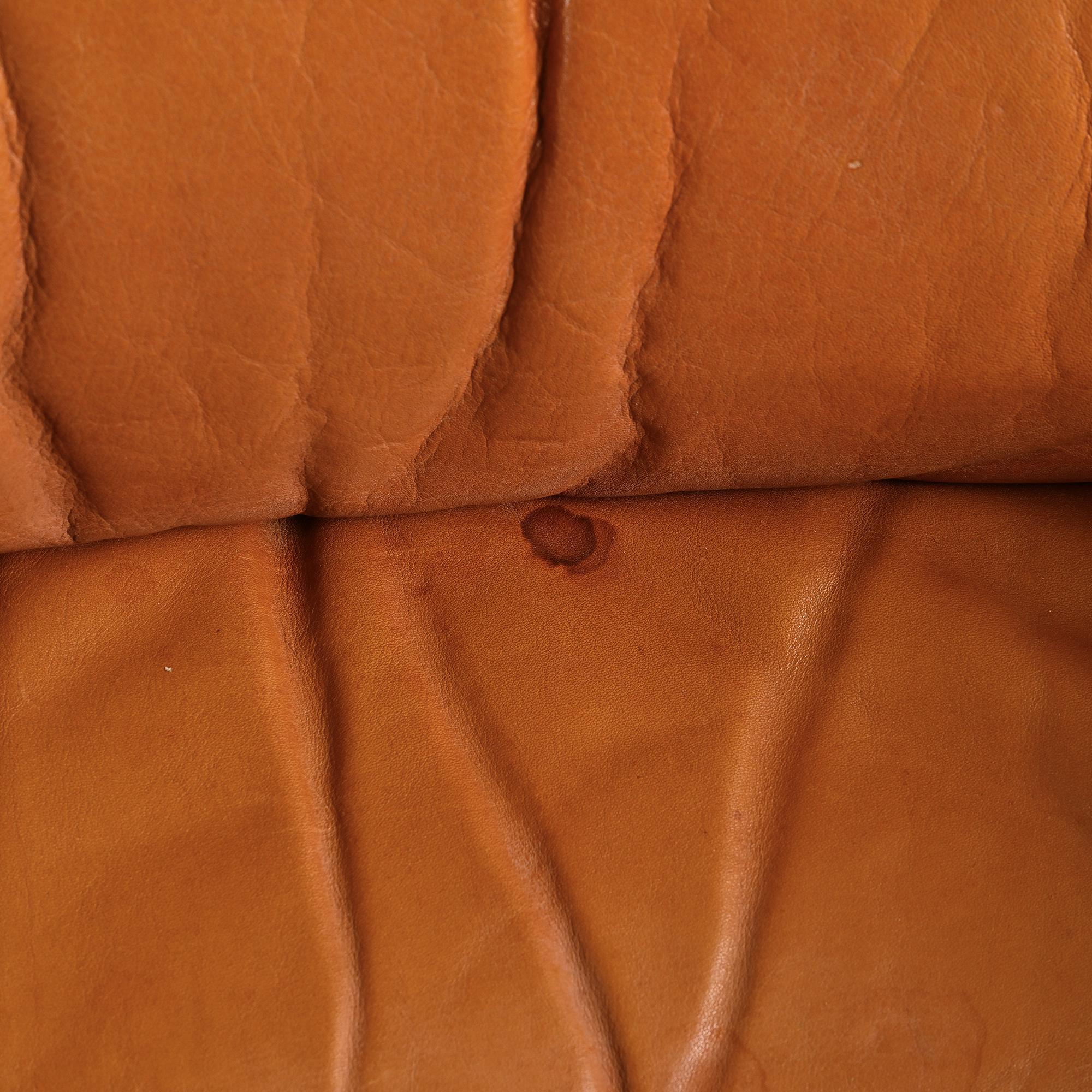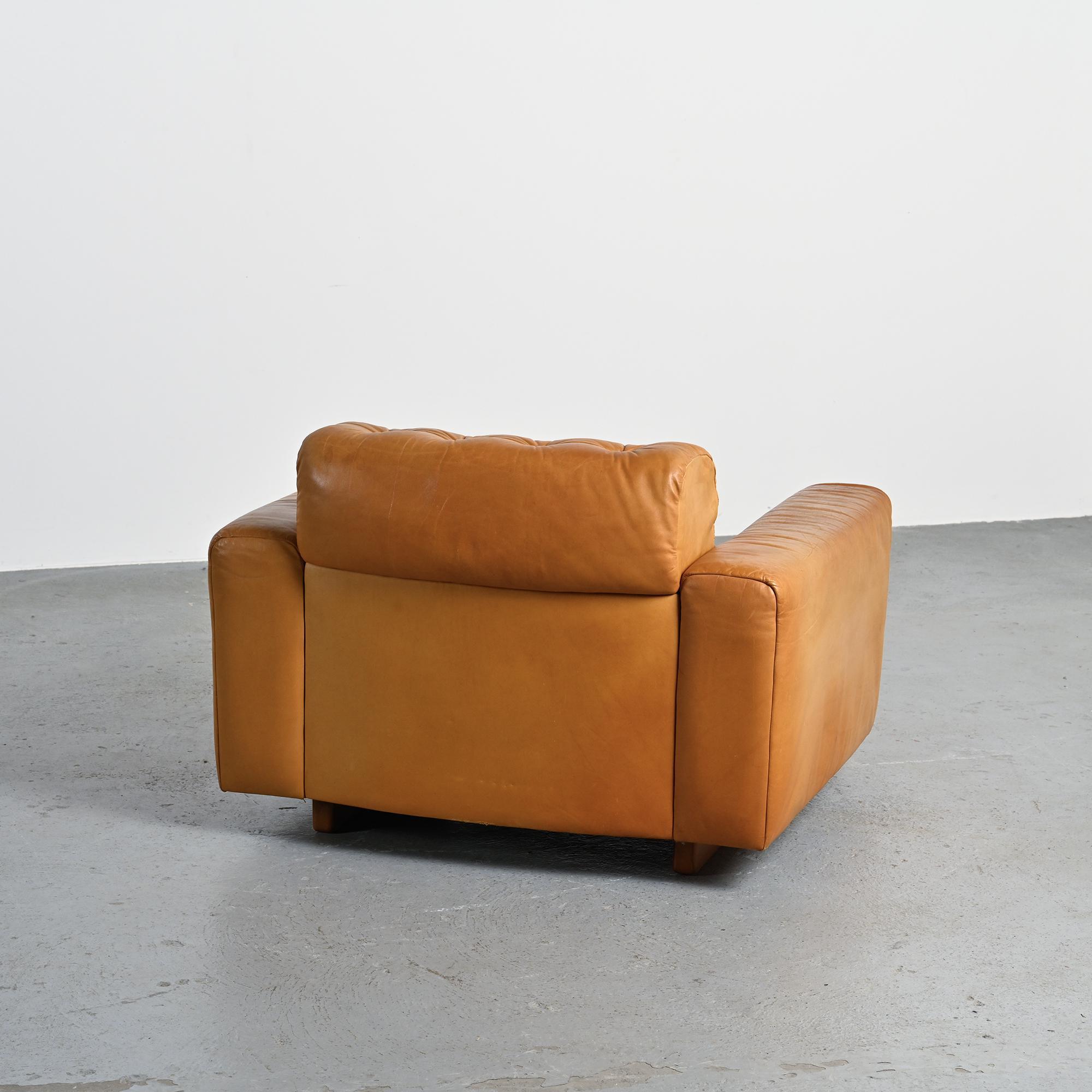 The DS-40 model features generous volumes and deep seating, defined by a regular tufted structure with integrated cushions. Wide solid armrests and a low backrest give the set a strong architectural presence, characteristic of Swiss design from the 1970s. The ensemble is fully upholstered in thick, supple camel full-grain leather, reflecting de Sede's leather craftsmanship.