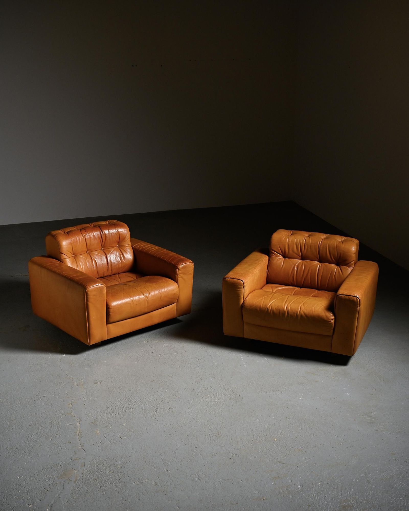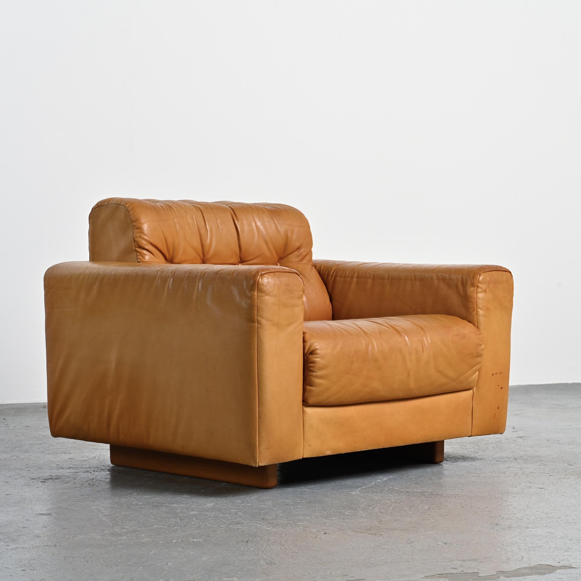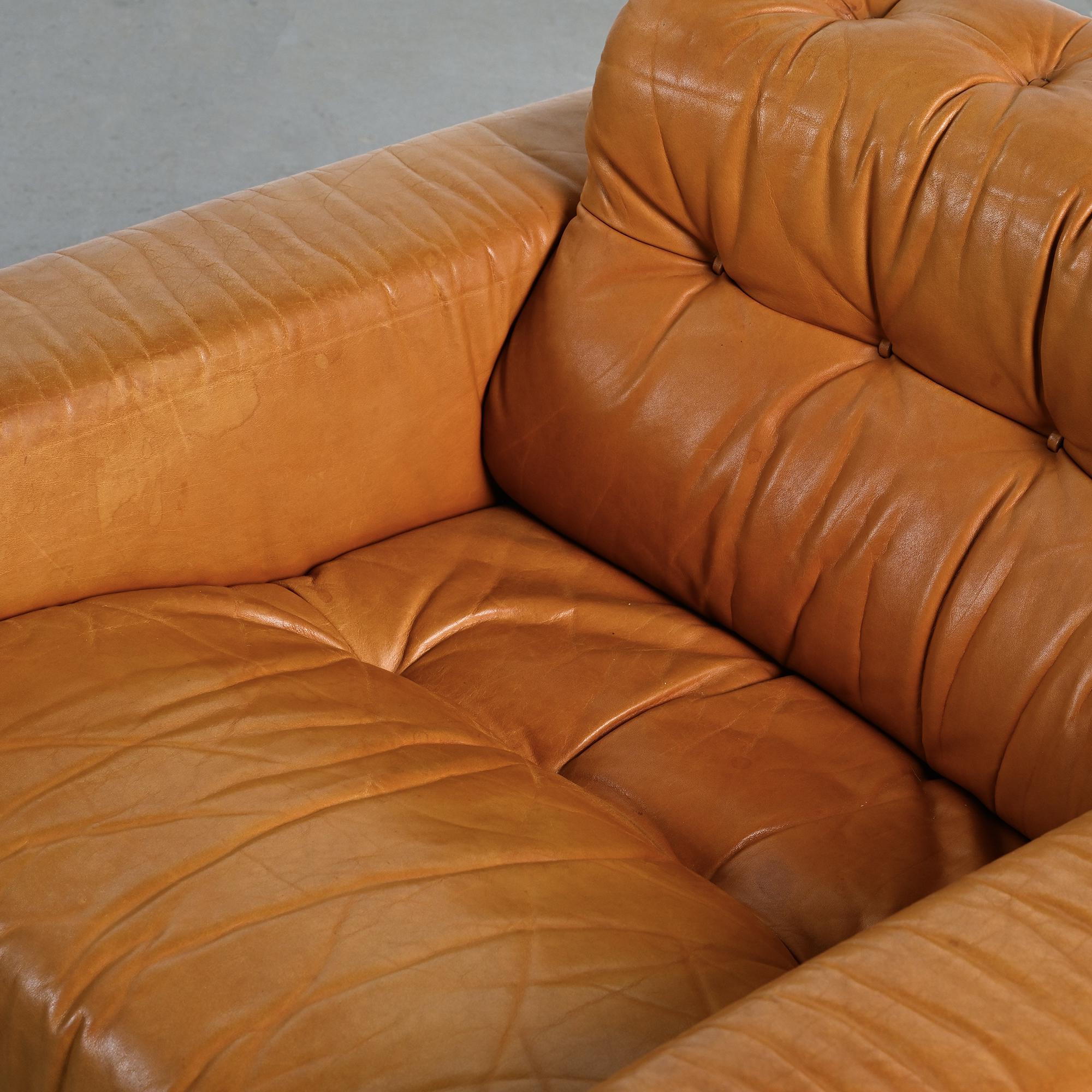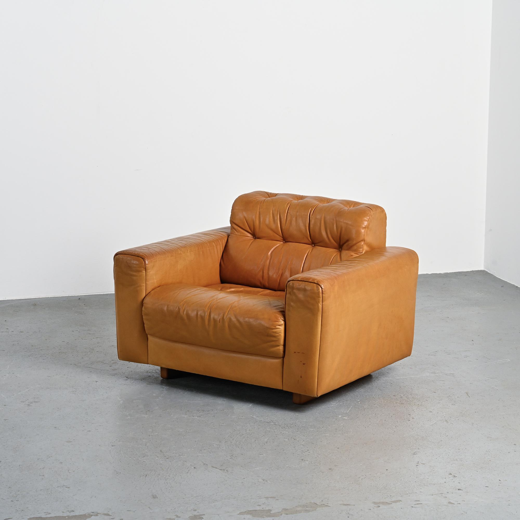 The DS-40 model features generous volumes and deep seating, defined by a regular tufted structure with integrated cushions. Wide solid armrests and a low backrest give the set a strong architectural presence, characteristic of Swiss design from the 1970s. The ensemble is fully upholstered in thick, supple camel full-grain leather, reflecting de Sede's leather craftsmanship.