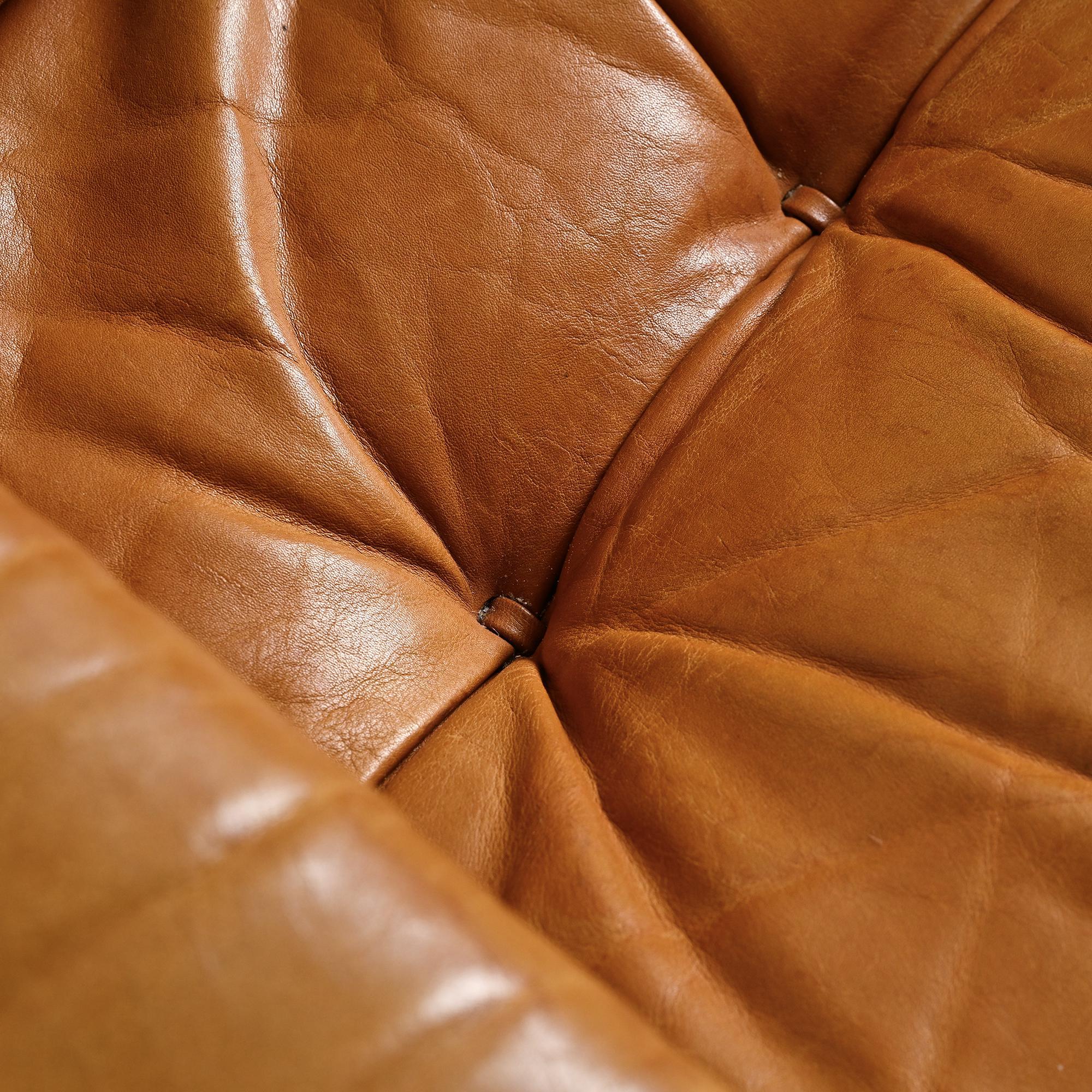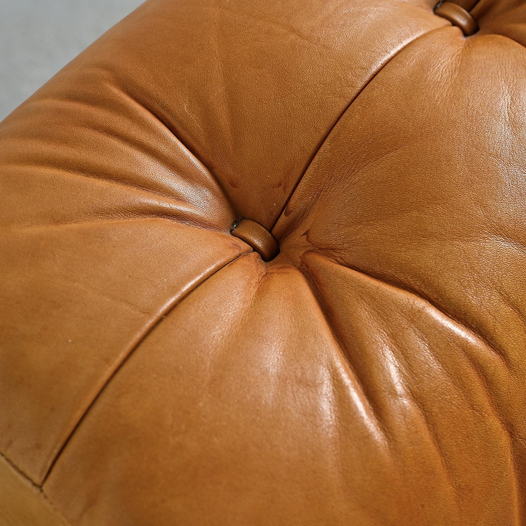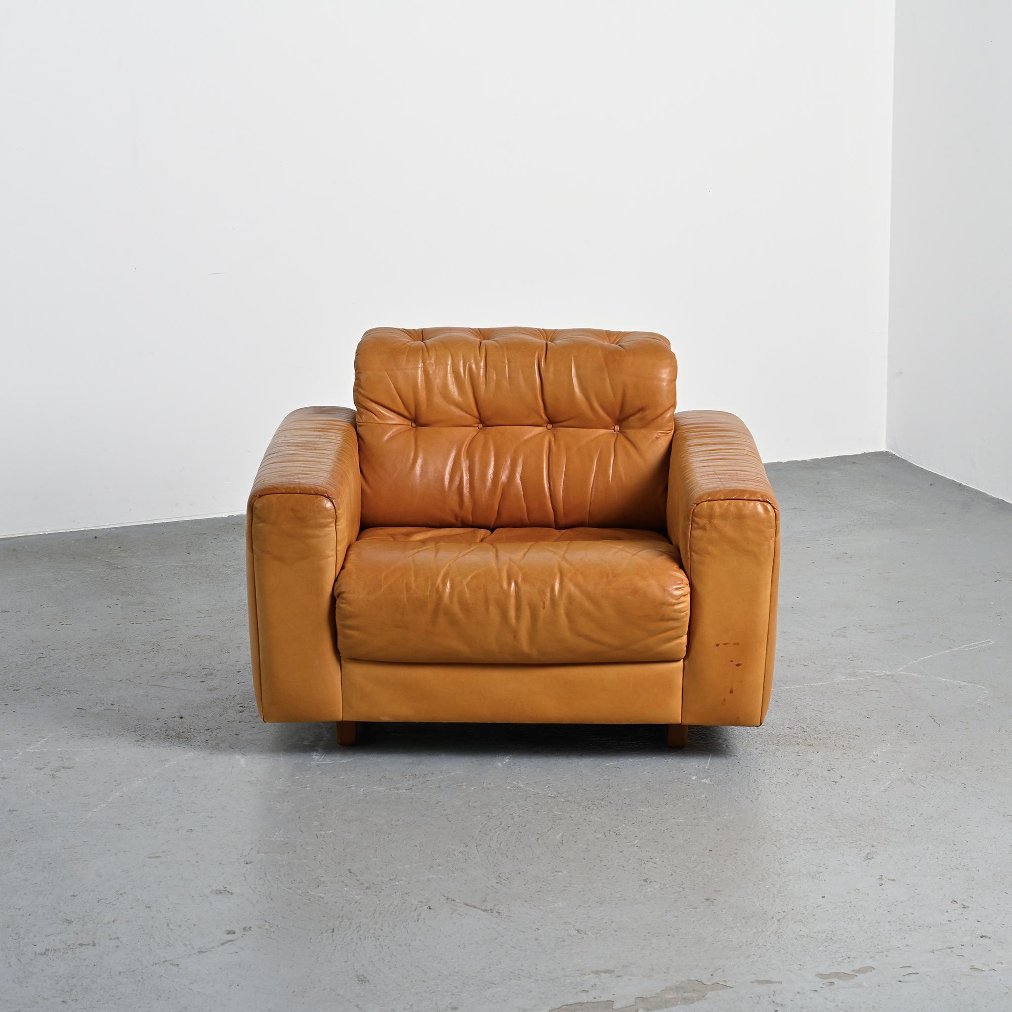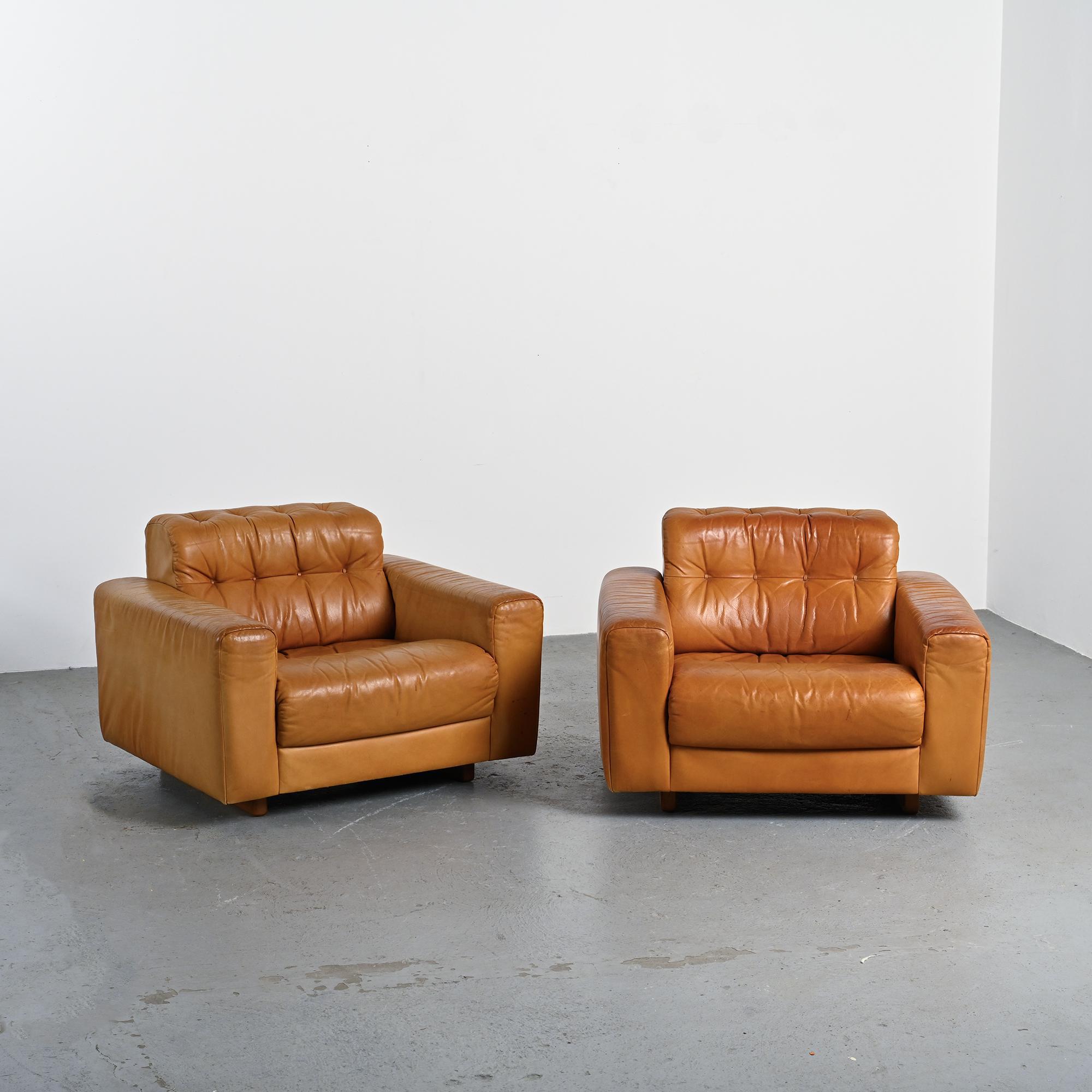 The DS-40 model features generous volumes and deep seating, defined by a regular tufted structure with integrated cushions. Wide solid armrests and a low backrest give the set a strong architectural presence, characteristic of Swiss design from the 1970s. The ensemble is fully upholstered in thick, supple camel full-grain leather, reflecting de Sede's leather craftsmanship.