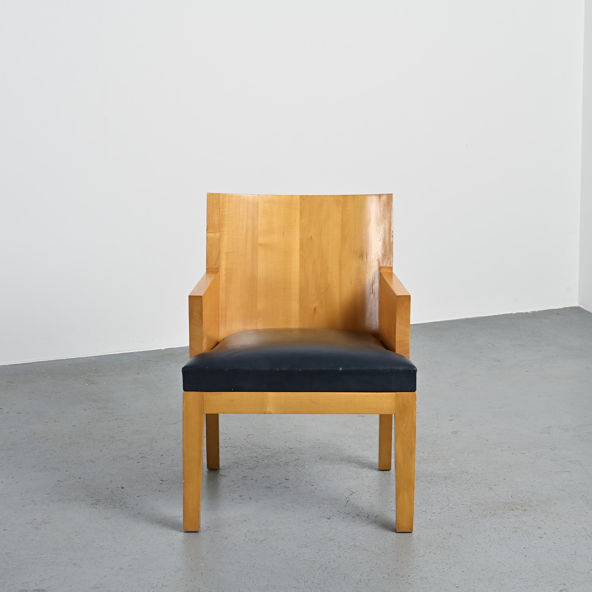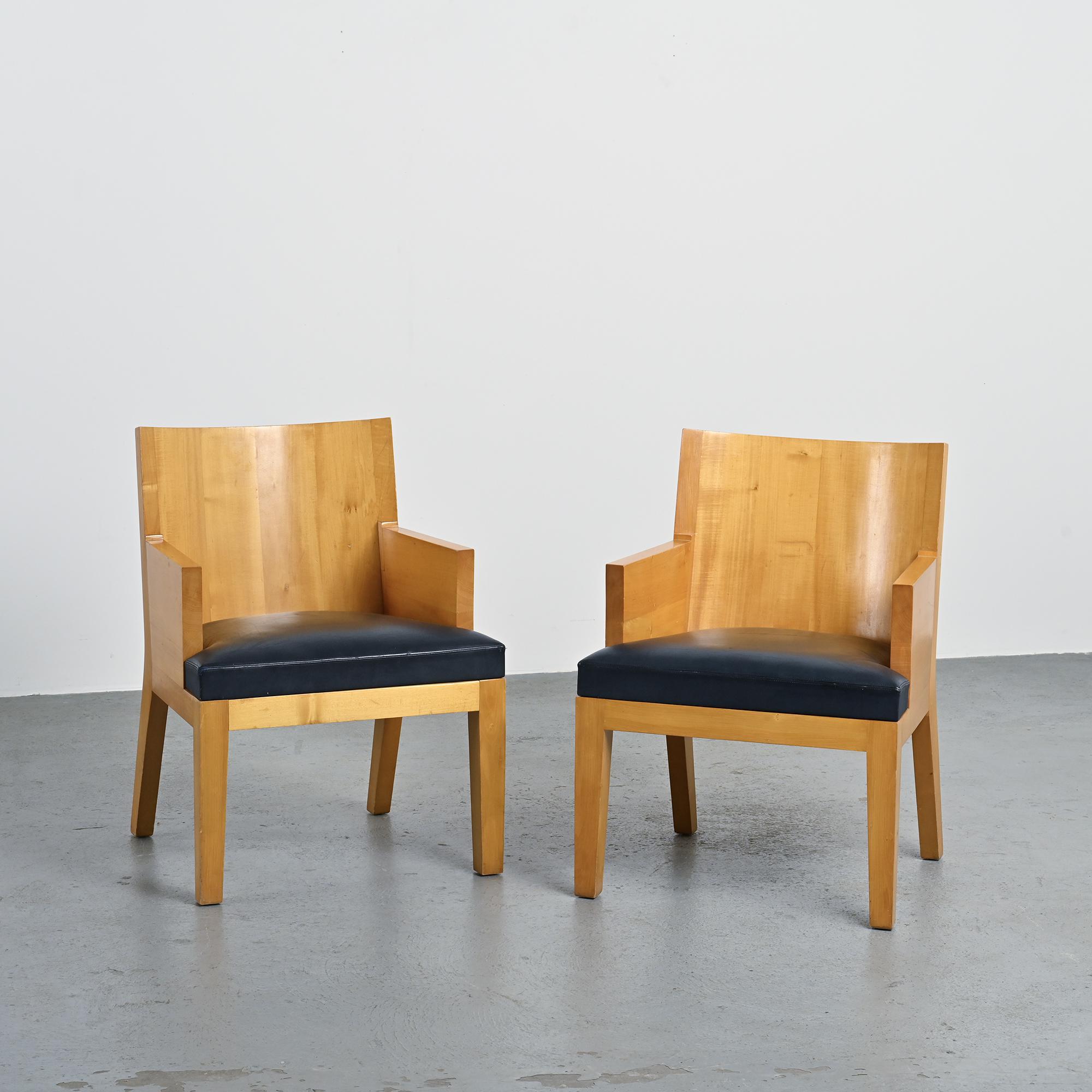 Pair of Stall armchairs by Christian Liaigre, crafted in varnished solid sycamore with navy blue leather upholstery.