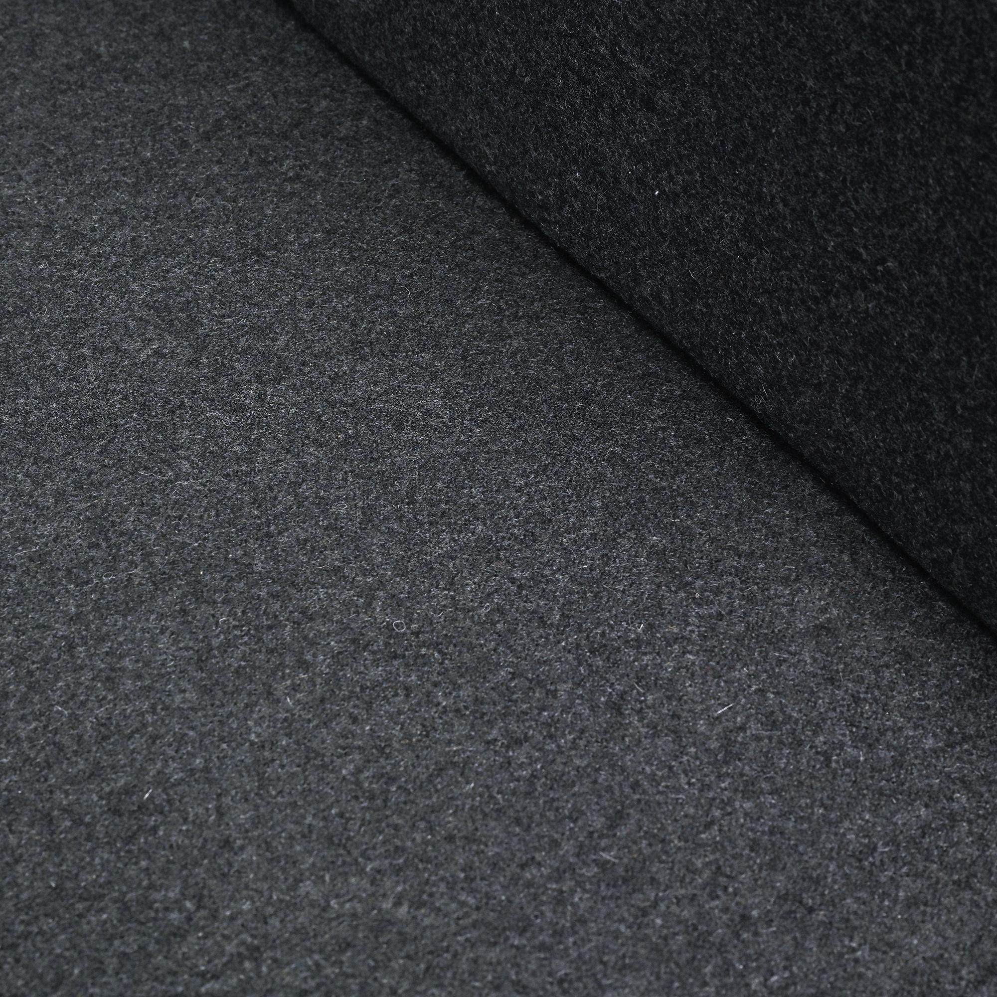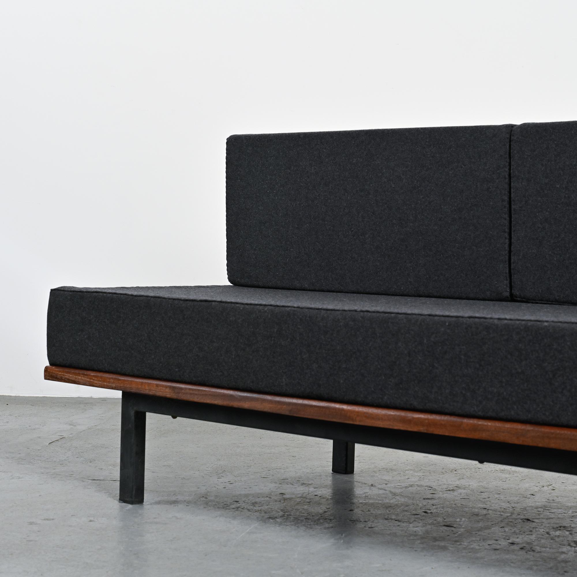 The structure features a black lacquered steel base combined with thirteen solid mahogany slats. The seat is completed with cushions upholstered in anthracite grey Nobilis wool cloth. Other finishes available on request.