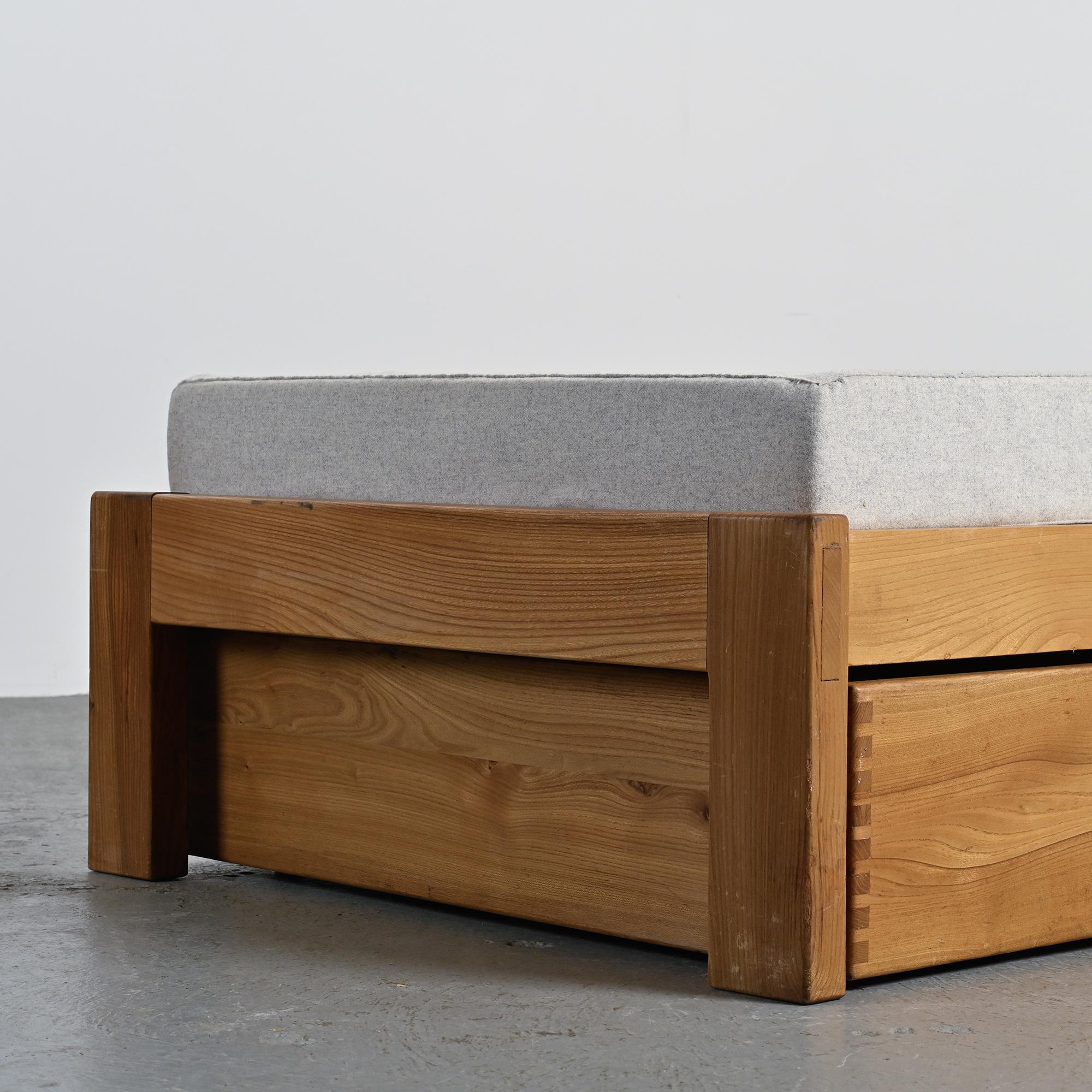 Made from solid elm, the bed features a robust structure with clearly defined sections which incorporates a large integrated storage drawers, discreetly opened through cut-out handles on the front. The design emphasizes structural clarity and the natural qualities of wood, avoiding any unnecessary ornamentation.
