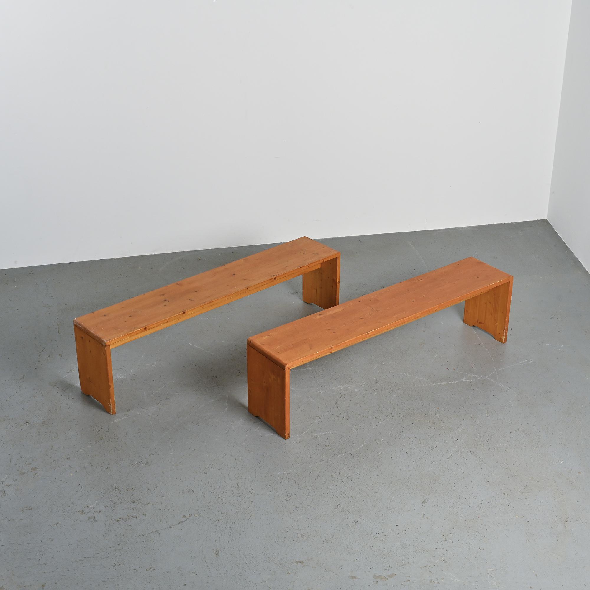 Pair of solid pine benches produced in the 1970s for the Les Arcs 1800 ski resort.
