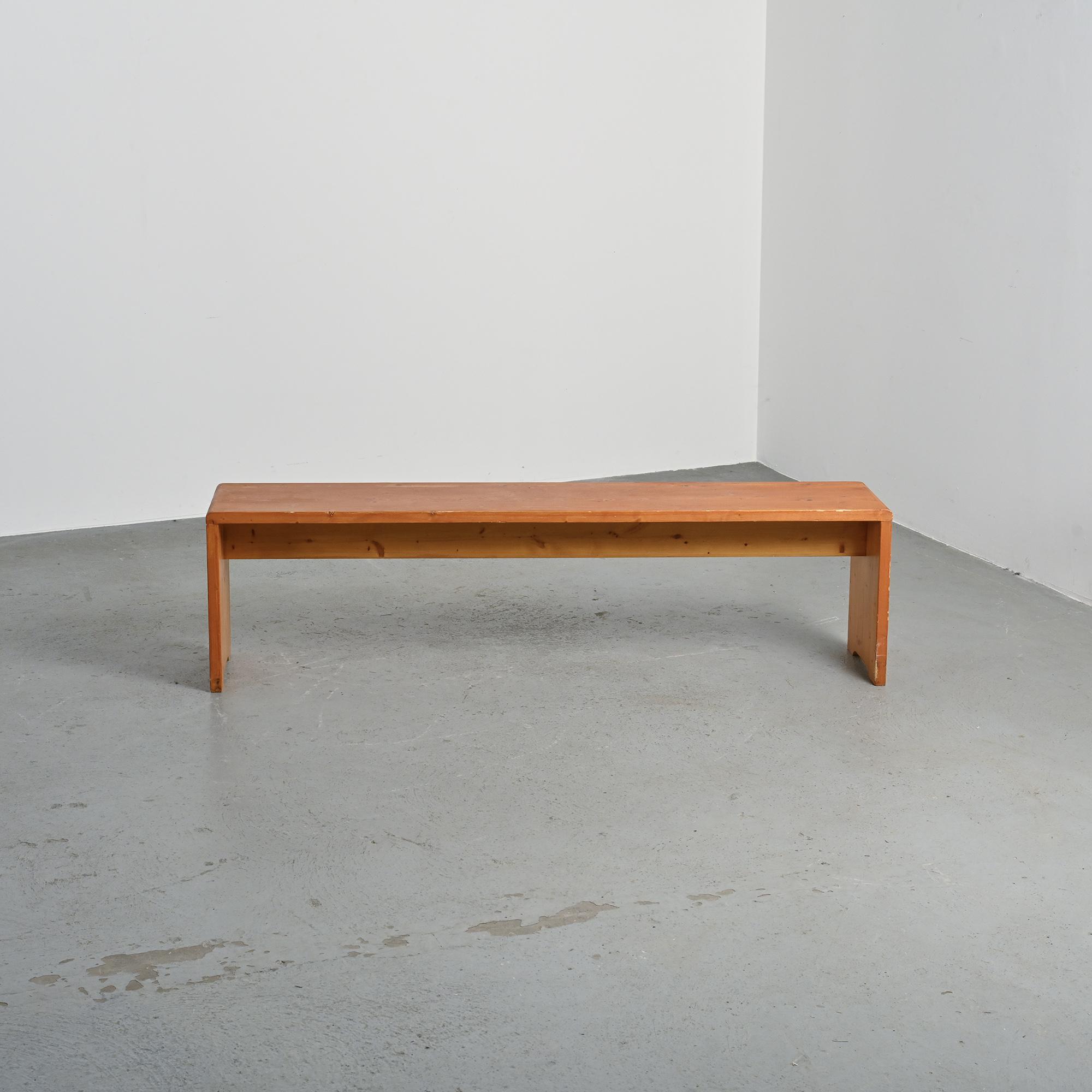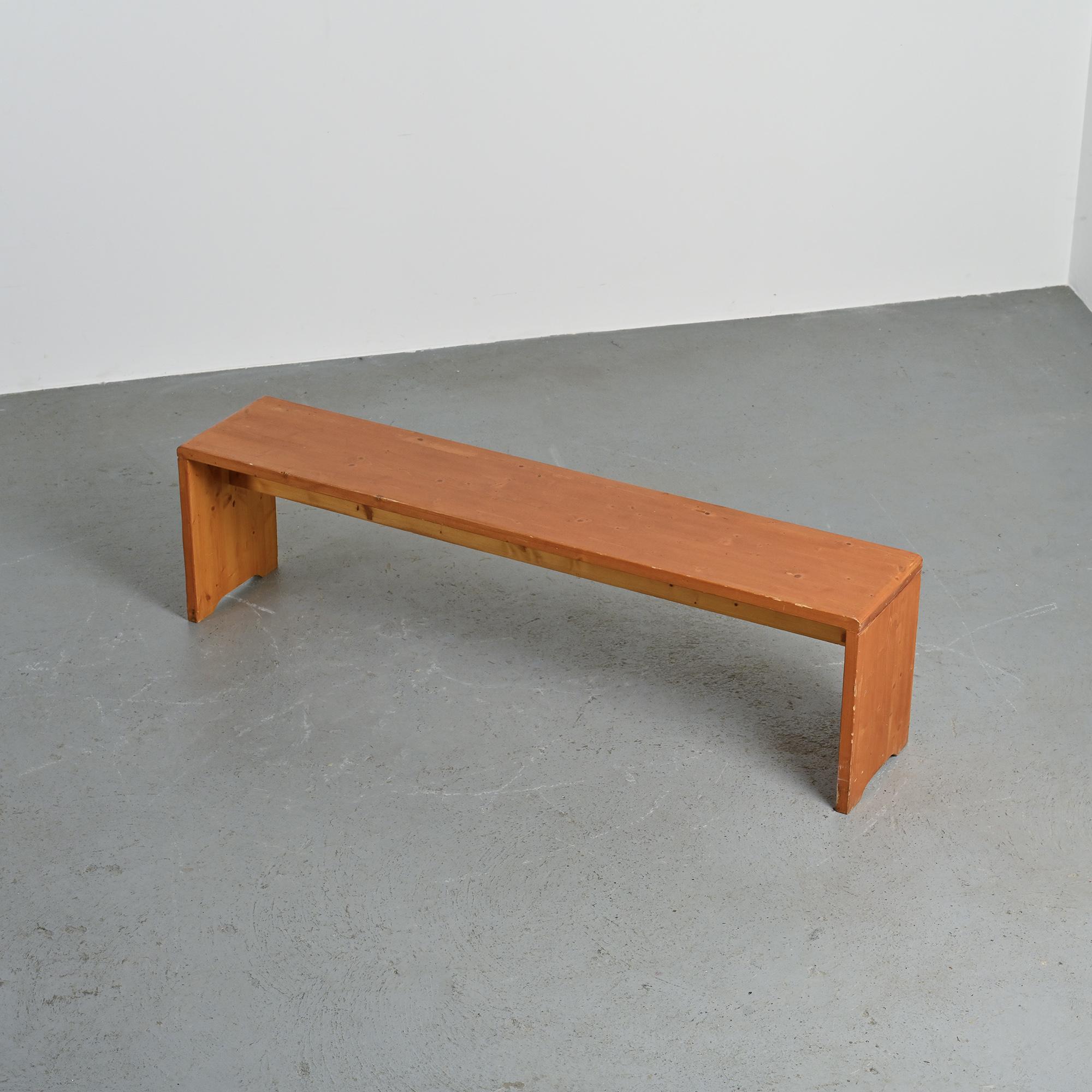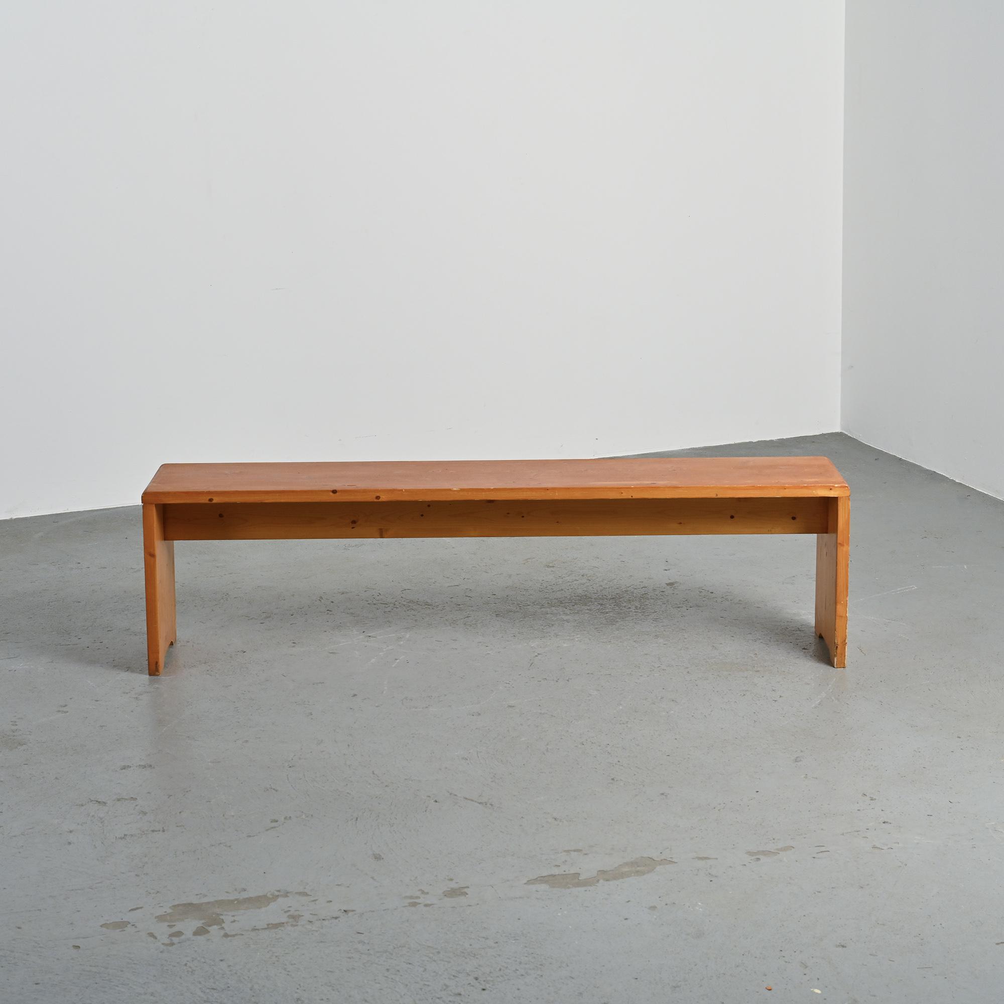 Their straightforward and sturdy construction reflects furniture designed for collective use and alpine interiors. The restrained design emphasizes function, stability and material presence. This type of bench belongs to the furnishing selections made at Les Arcs under the coordination of Charlotte Perriand.