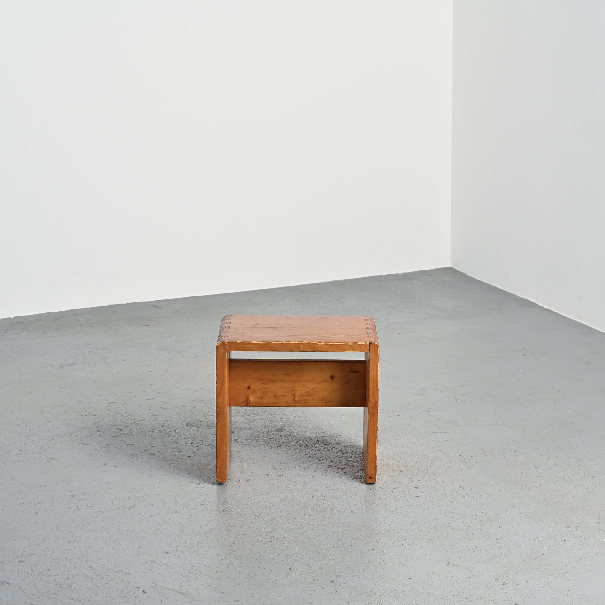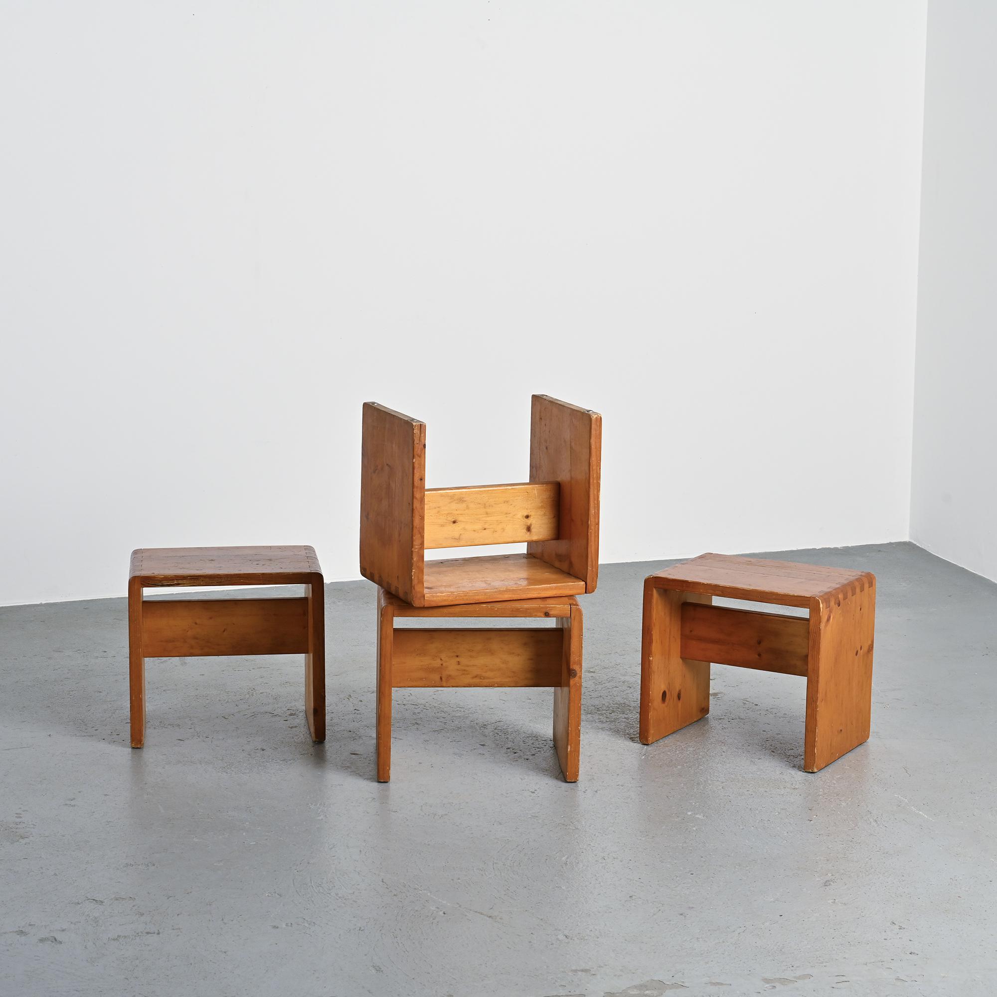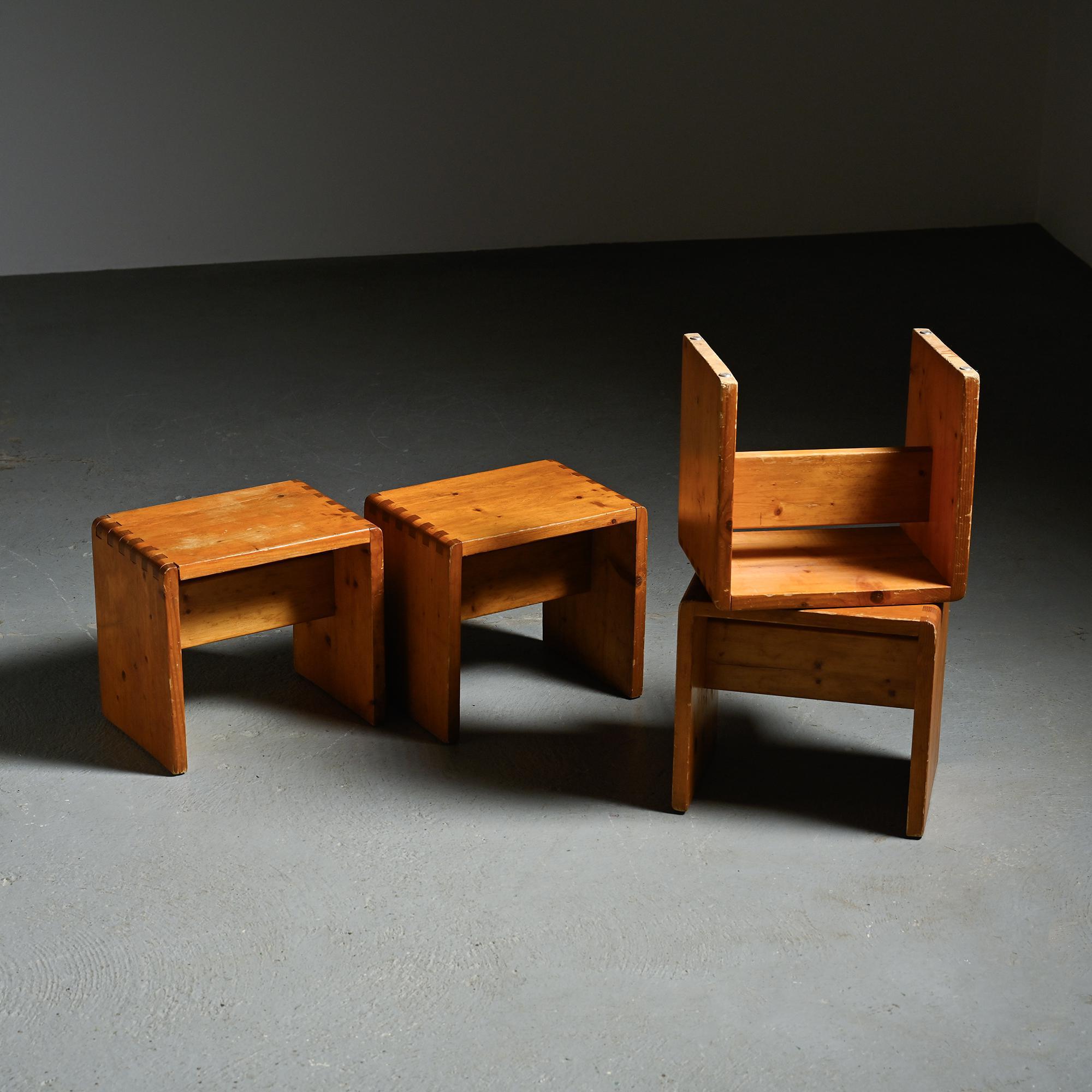 Set of four solid pine stools designed by French Alpine architect and designer Bernard Taillefer.