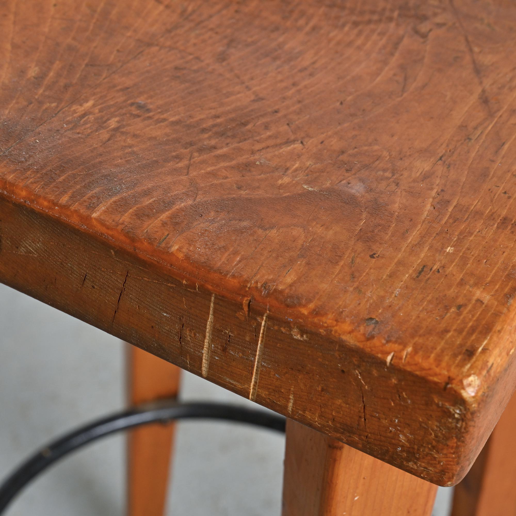It features a thick square seat in solid pine, resting on four slightly tapered legs linked by a circular black lacquered metal footrest. A robust and functional design typical of mid-century Alpine furniture.