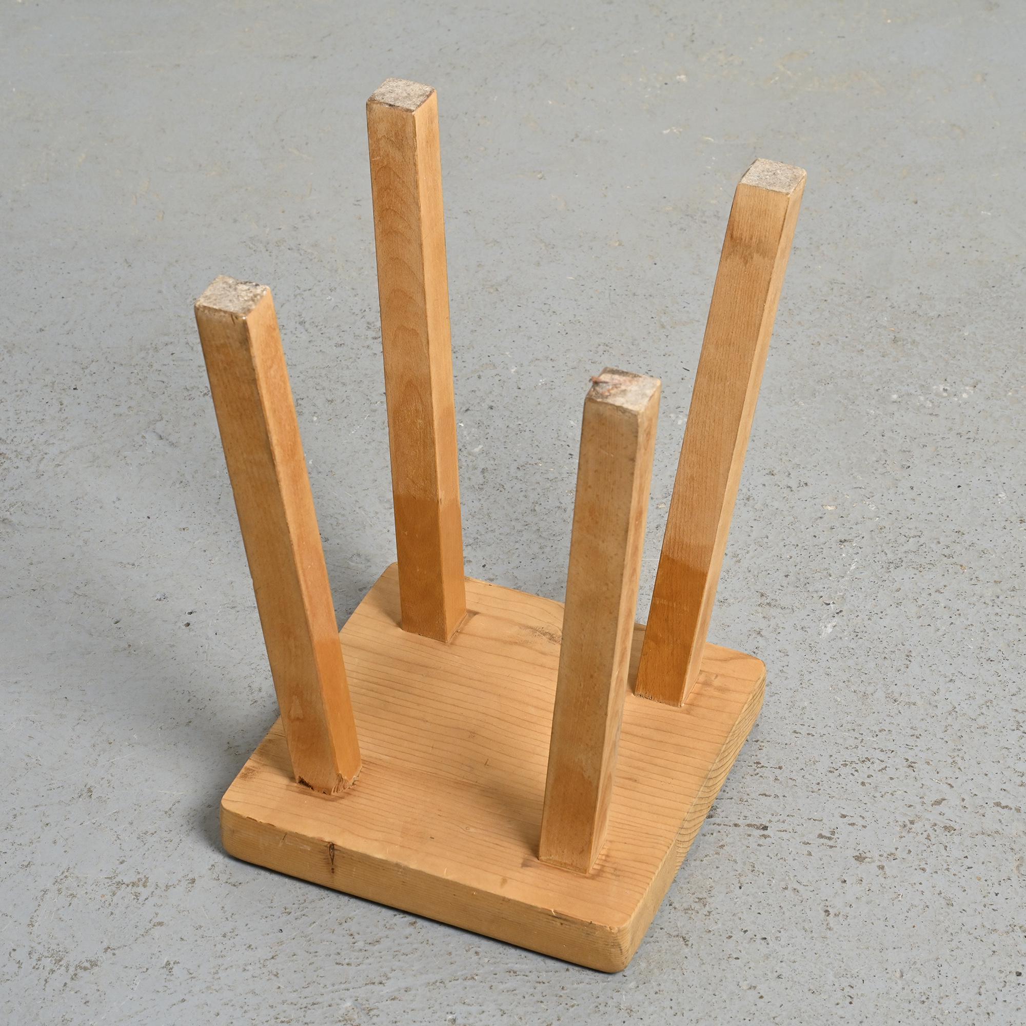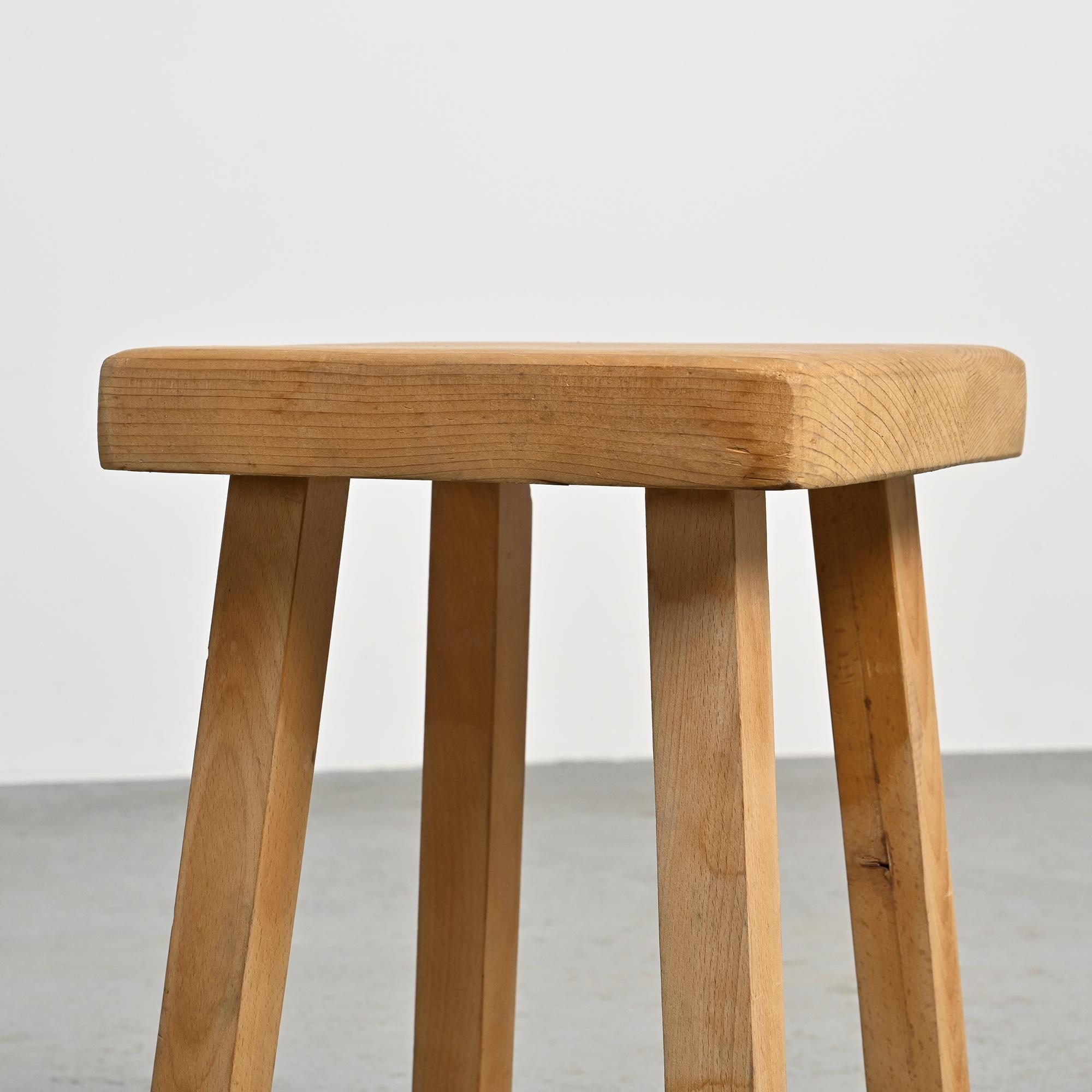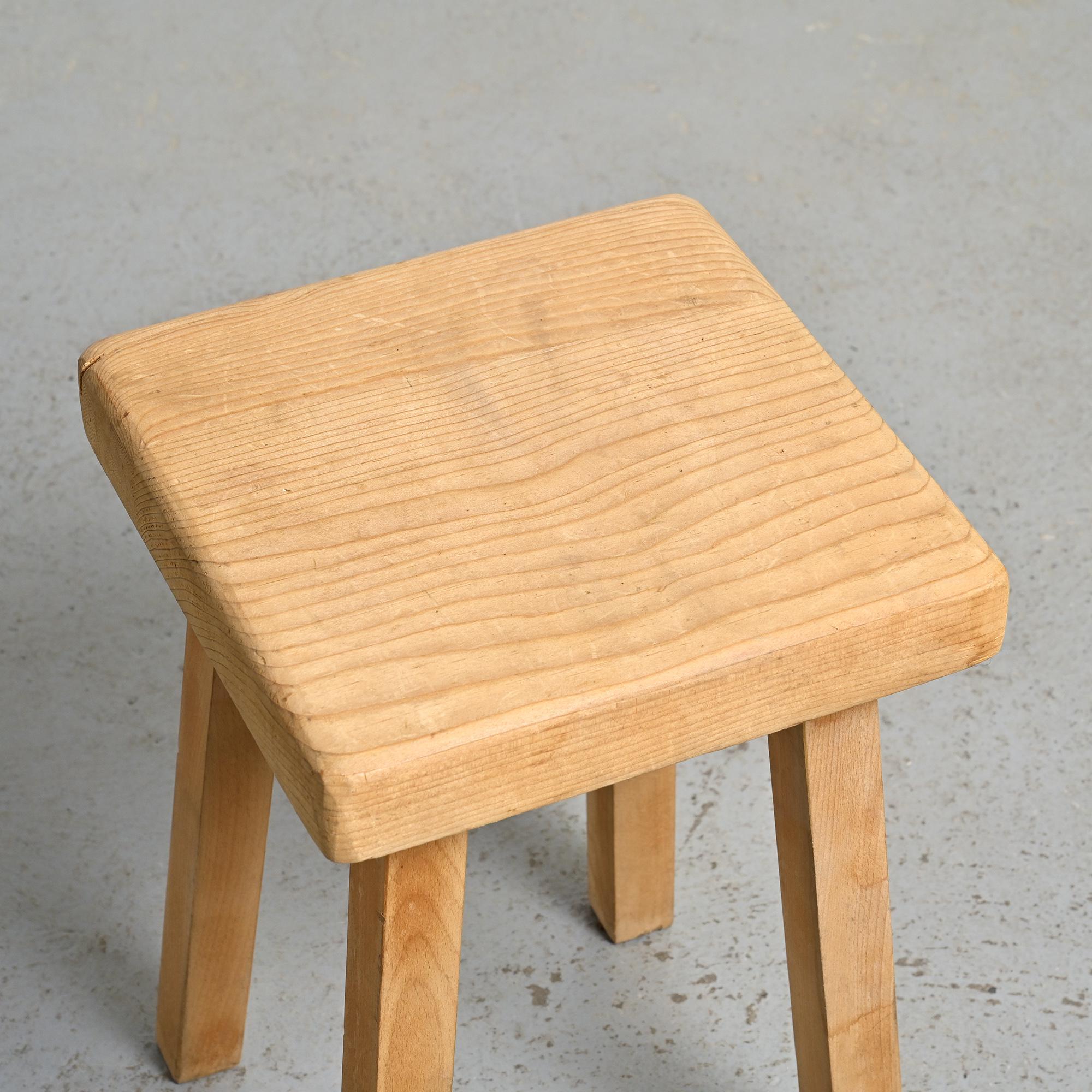 Tabouret en pin massif à assise carrée et piétement quadripode. Il a été dessiné pour la station de ski des Arcs, à laquelle Charlotte Perriand, passionnée de montagne, a contribué pendant près de 20 ans.
