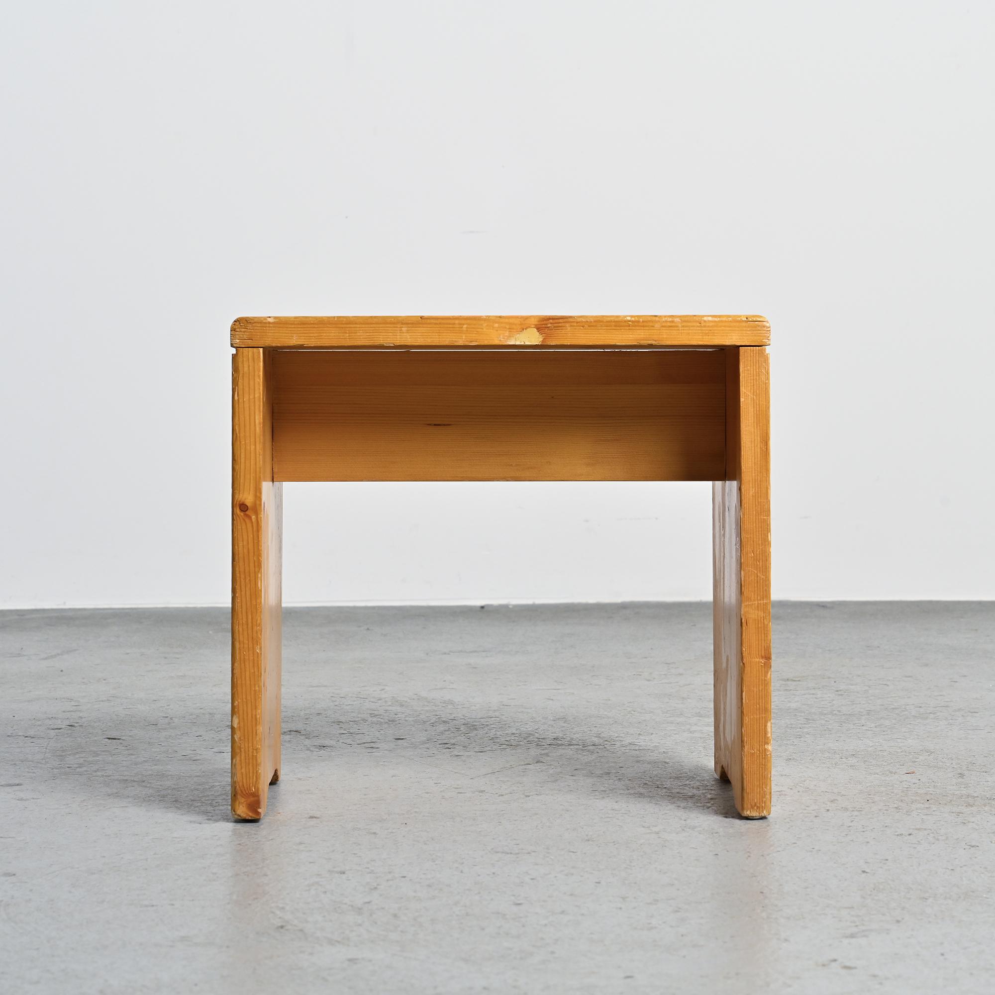 Solid pine stool with an inverted U-shaped base, produced for the furnishings of the Les Arcs 1800 ski resort. The design relies on an elementary and sturdy construction, emphasizing stability and structural clarity. The use of solid pine and restrained form relates to furniture conceived for collective use in a mountain environment, within the context of the furnishing programs overseen by Charlotte Perriand.