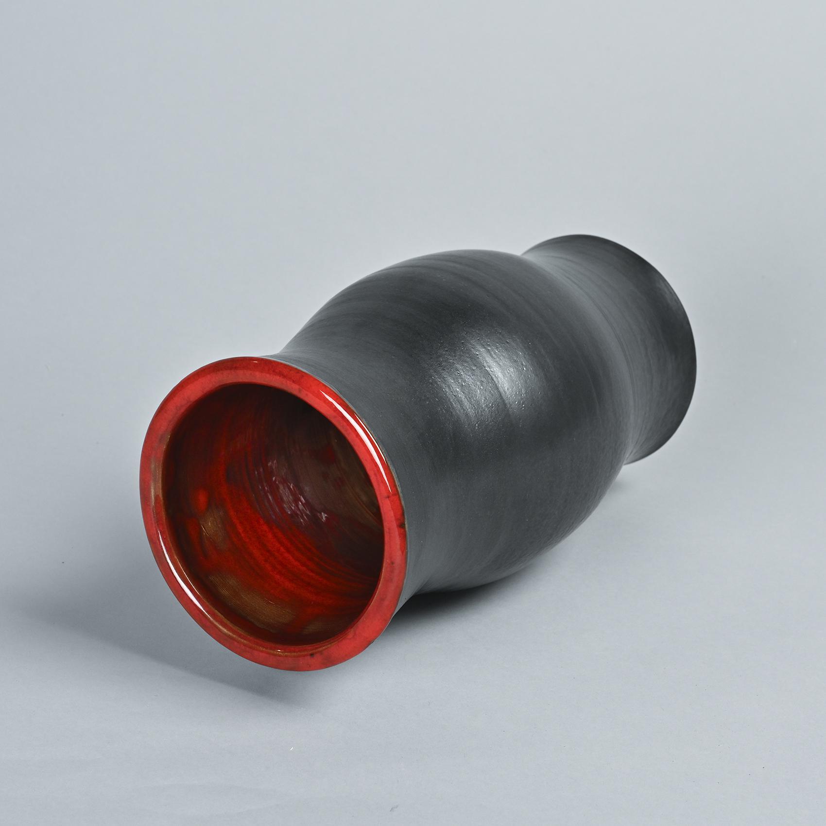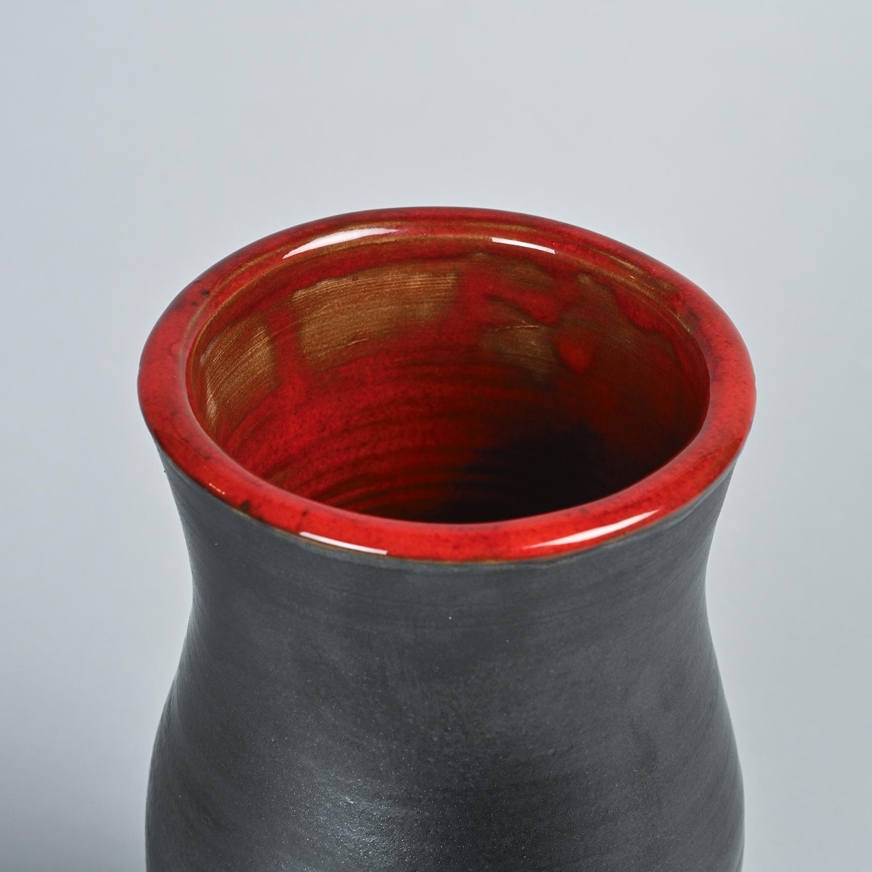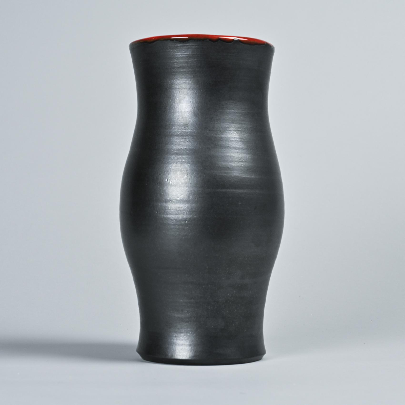 This vase features a slightly bulging cylindrical form with a flared neck, showcasing a matte black exterior and a Cloutier red glazed interior.