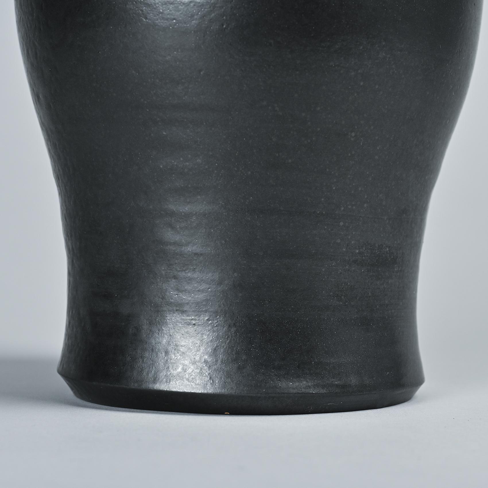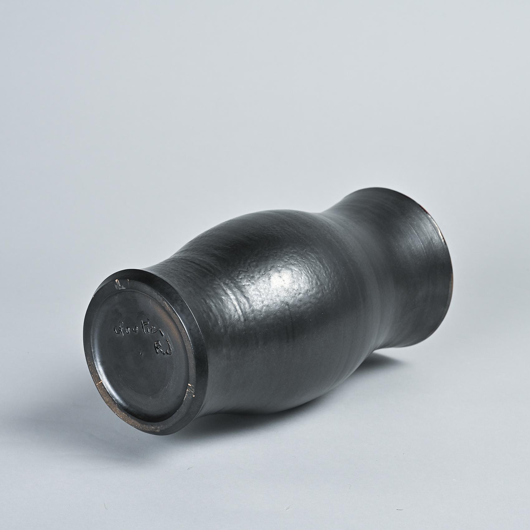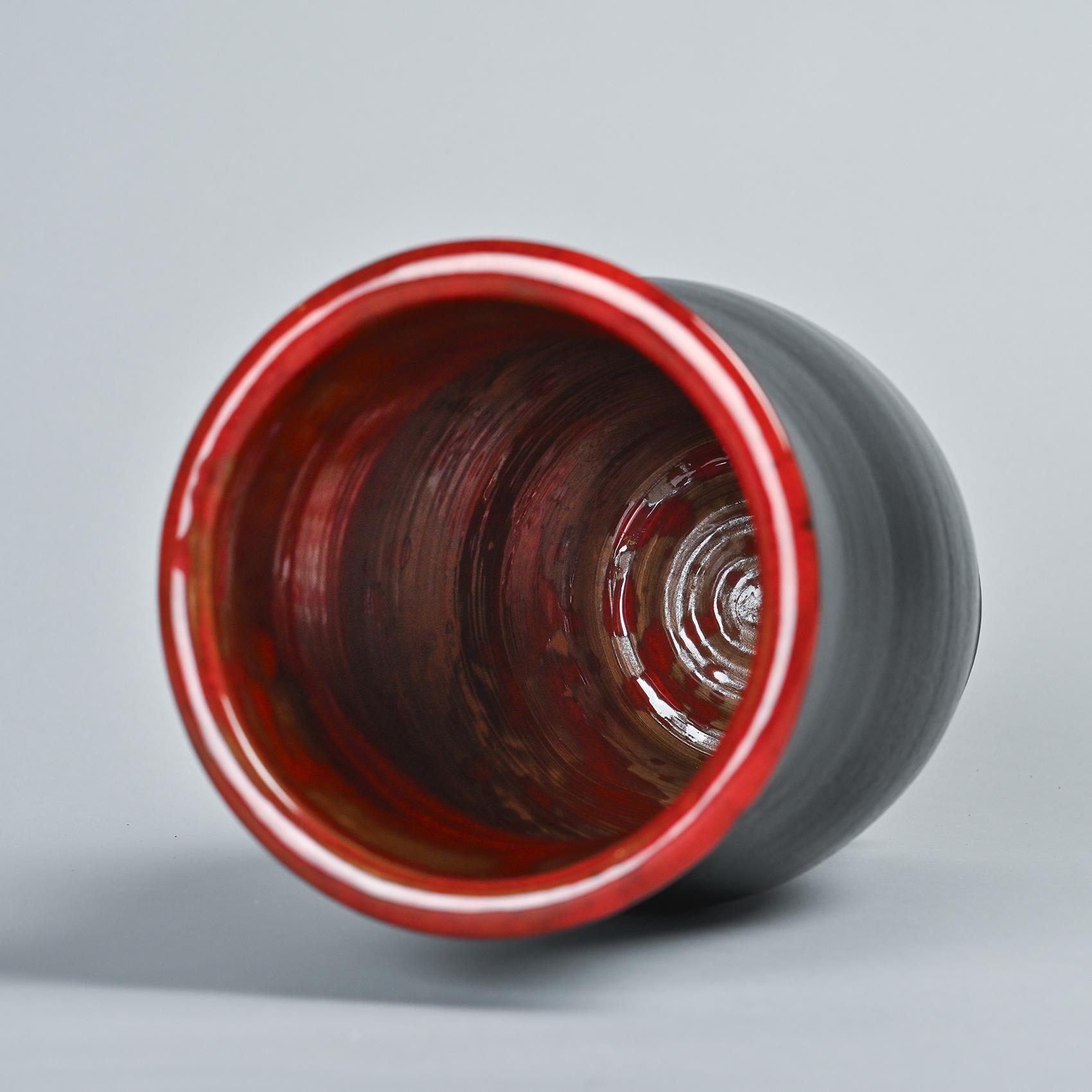 This vase features a slightly bulging cylindrical form with a flared neck, showcasing a matte black exterior and a Cloutier red glazed interior.