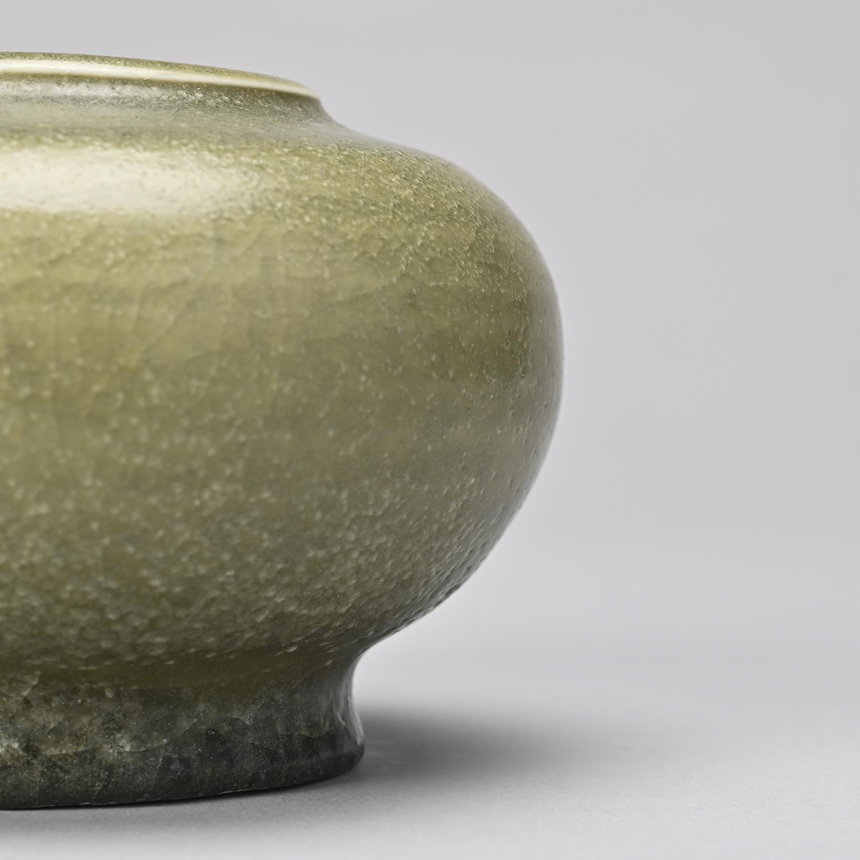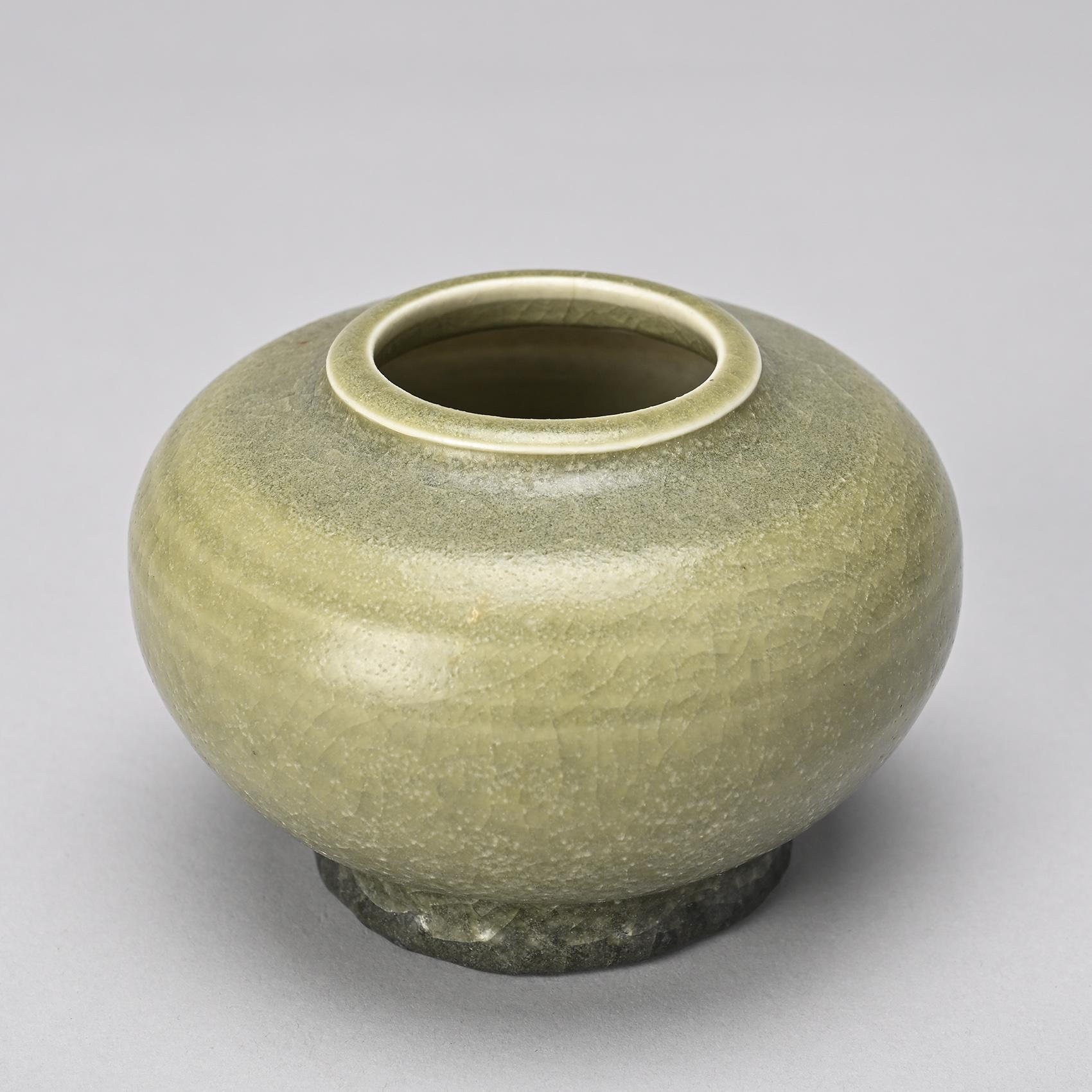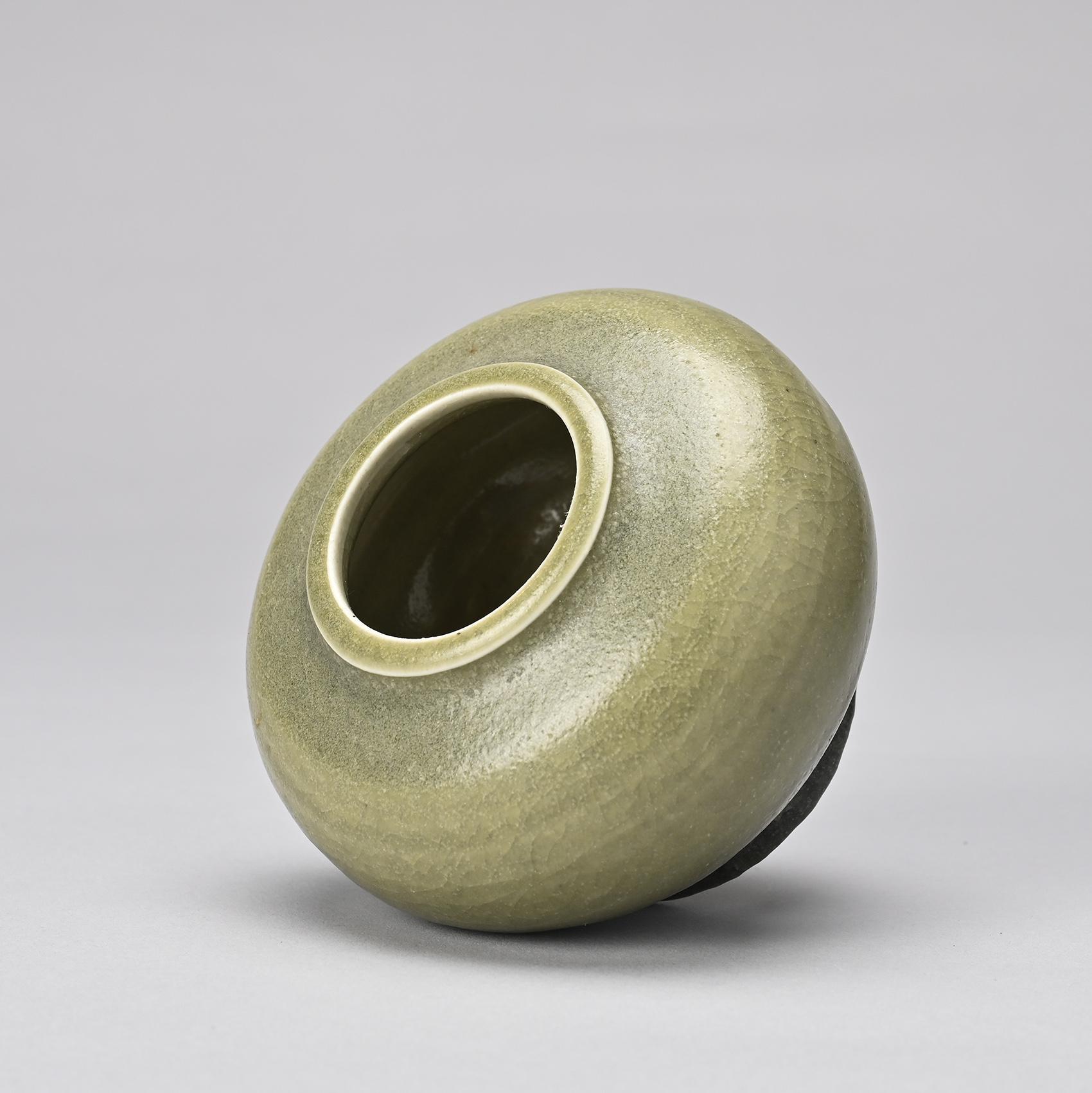 This vase, featuring a flattened spherical form with a gently flared neck, rests on a porcelain foot with a celadon glaze and subtle craquelure.
