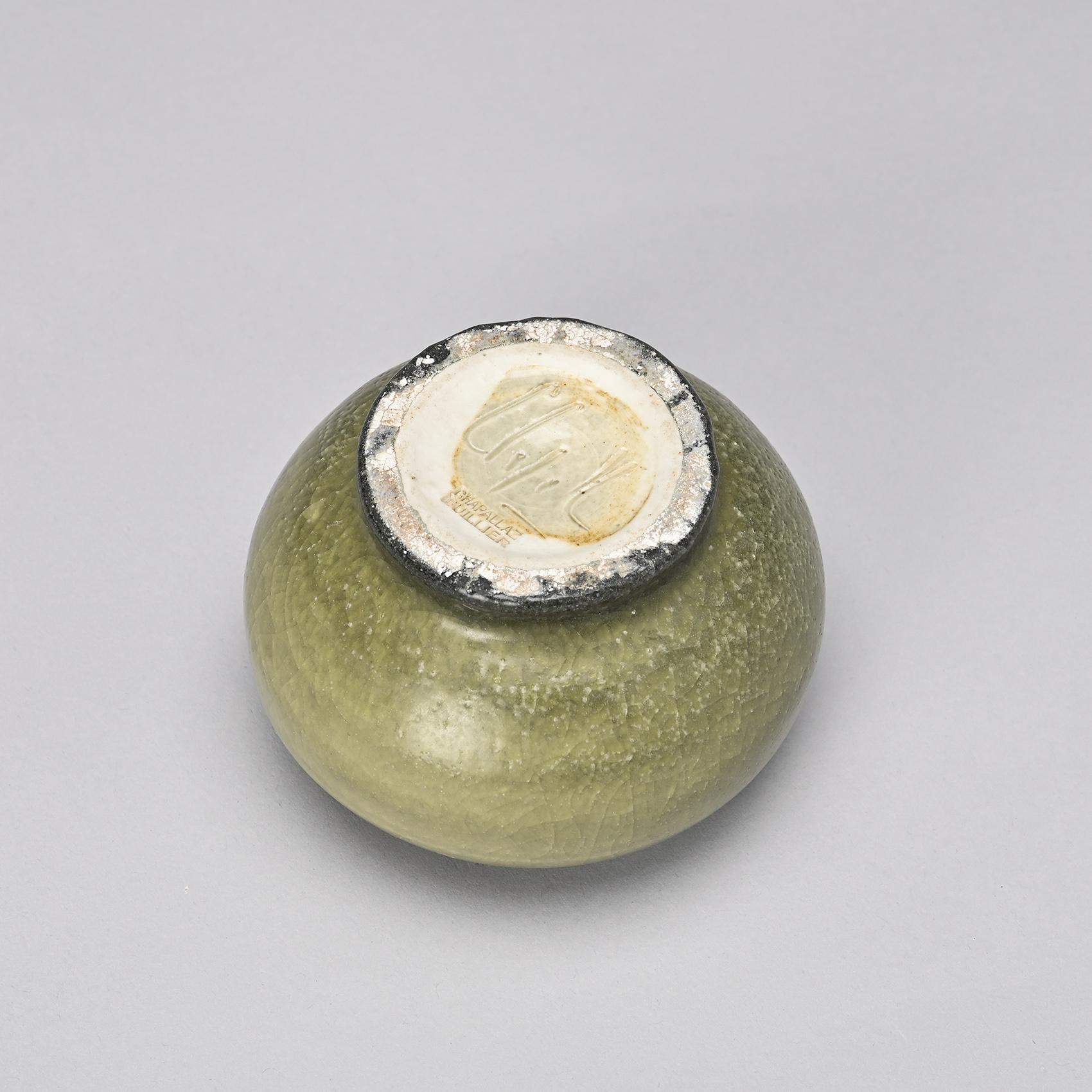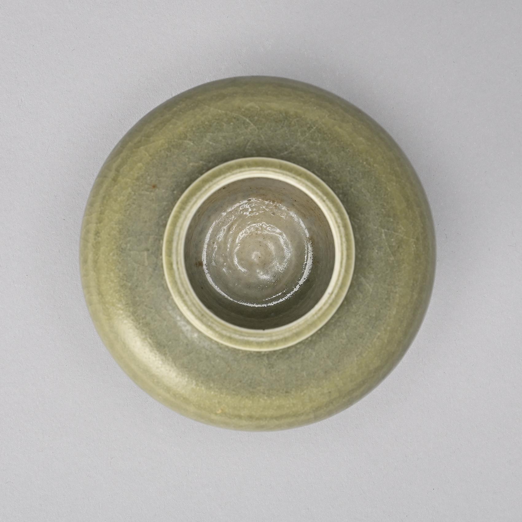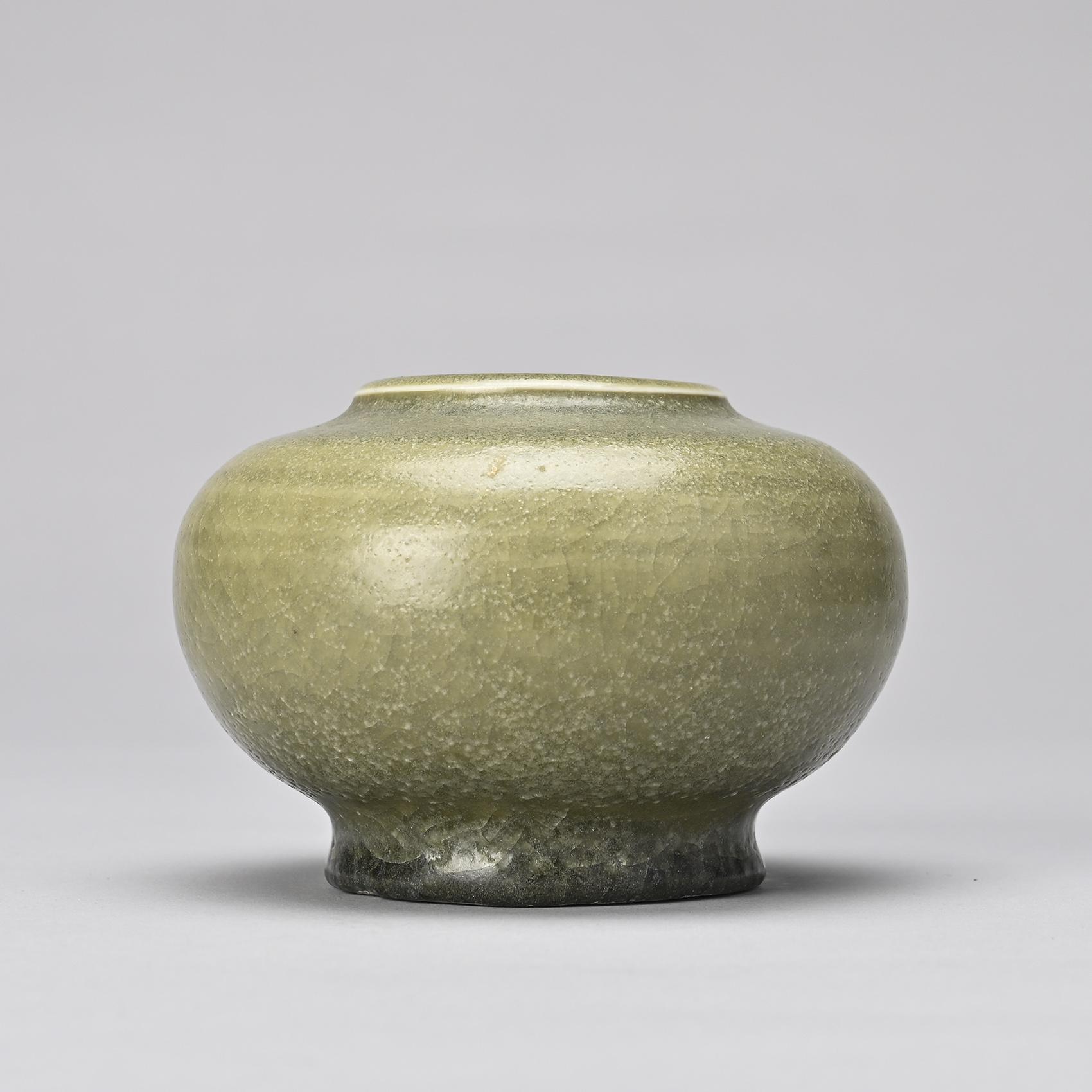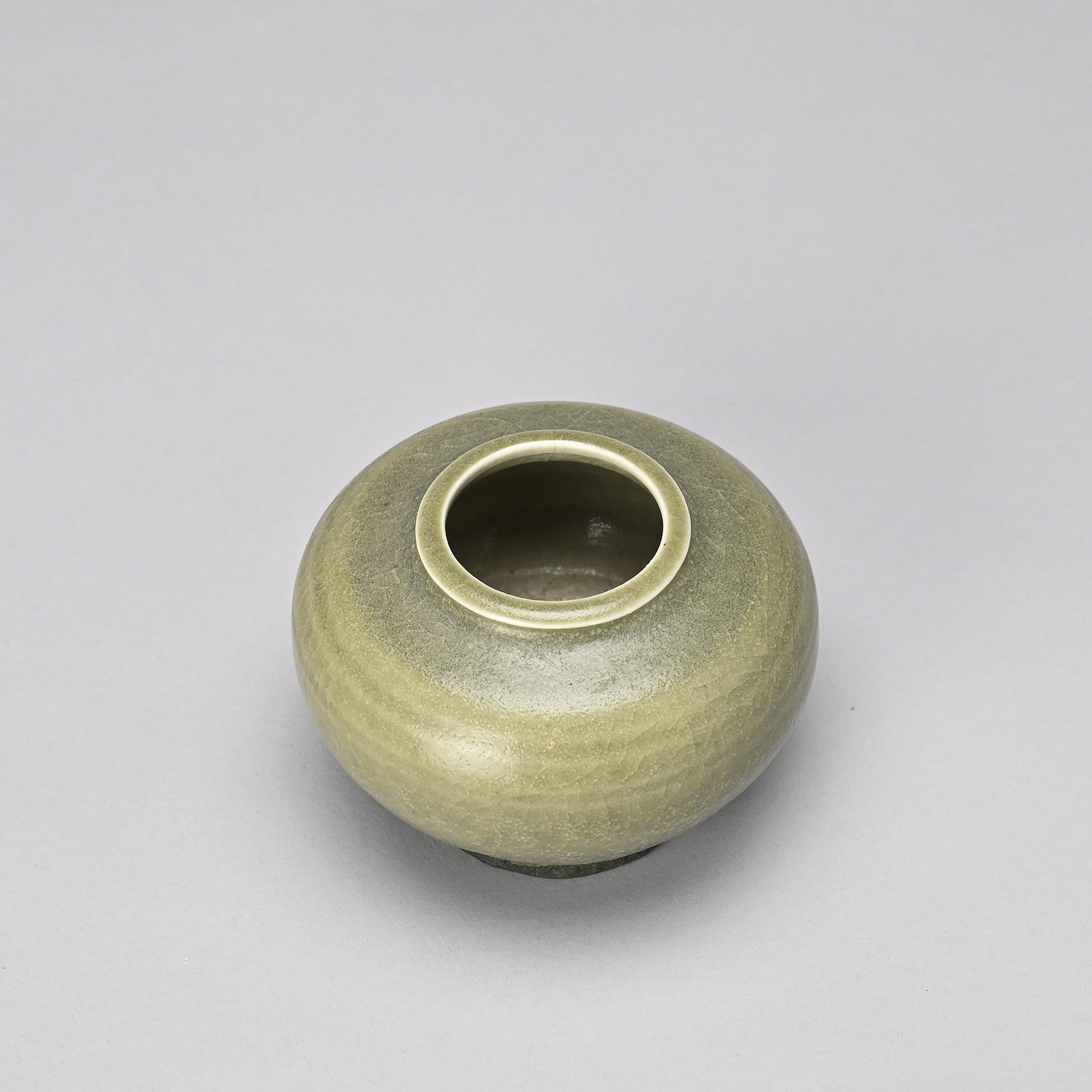 This vase, featuring a flattened spherical form with a gently flared neck, rests on a porcelain foot with a celadon glaze and subtle craquelure.