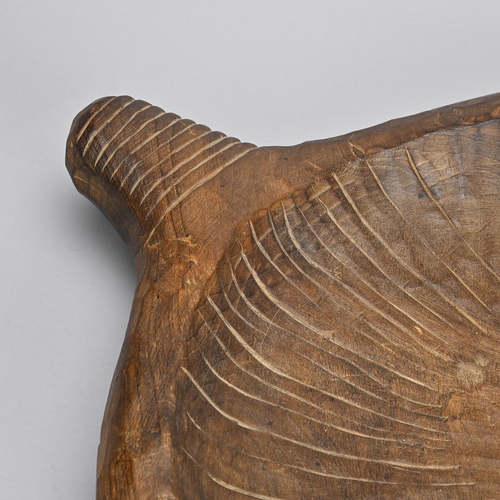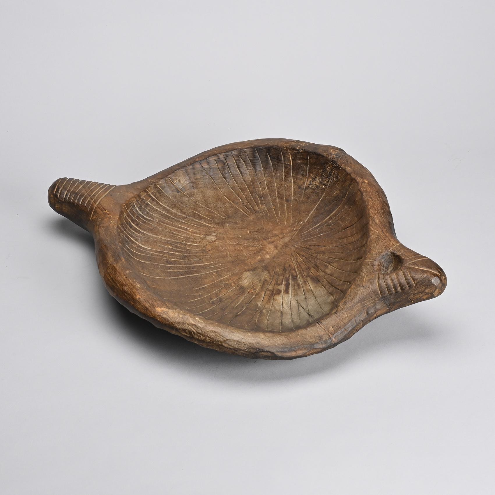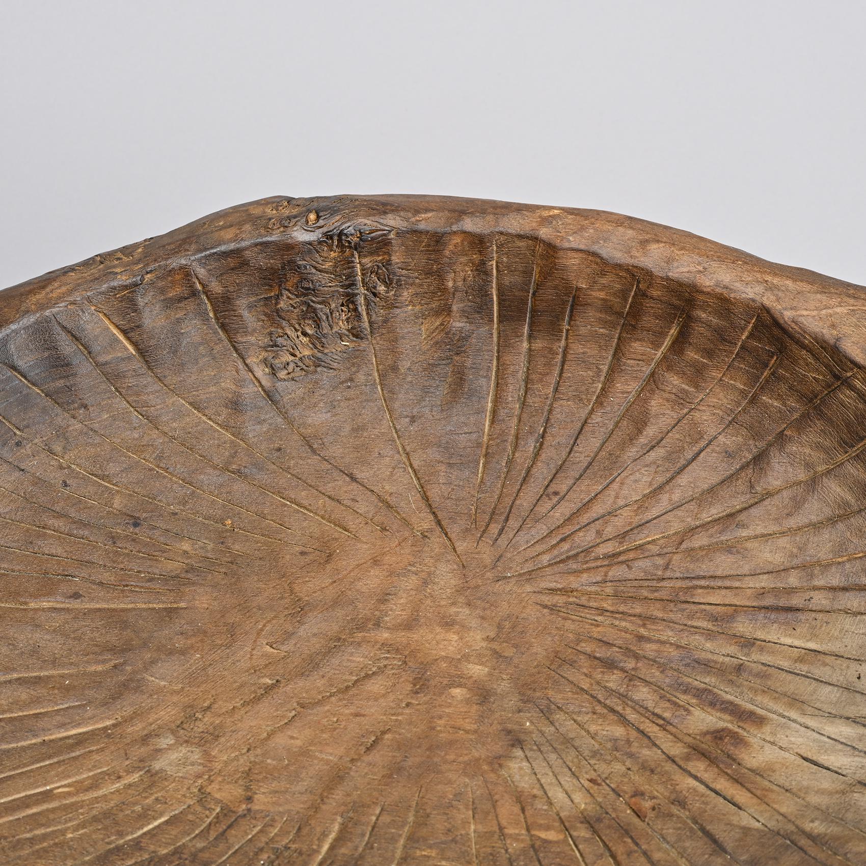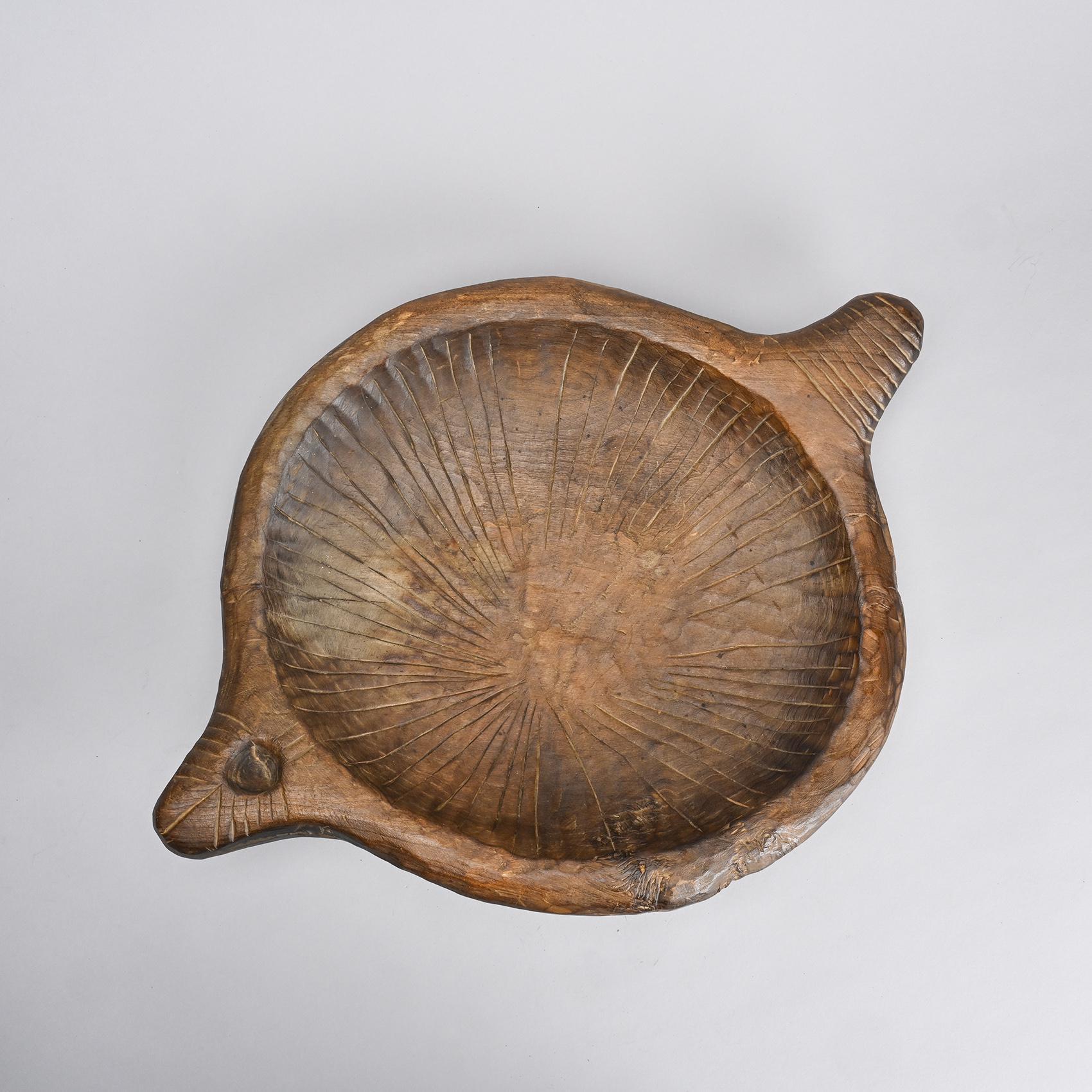 Hollow fruit bowl with two handles, carved from a single piece of wood using a gouge. The incised radial pattern highlights the maker's gesture and adds a graphic, almost symbolic presence. The surface bears a warm, raw patina, reflecting everyday domestic use.