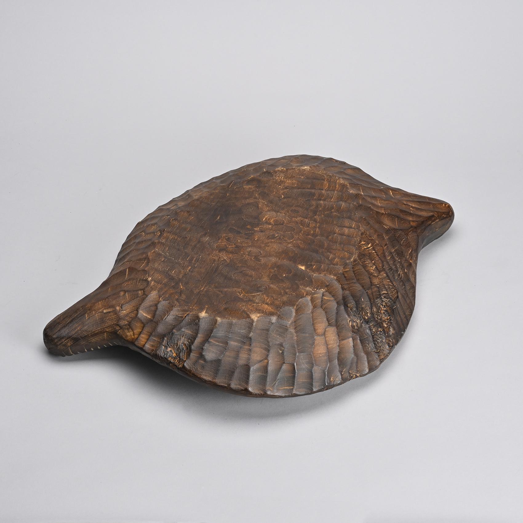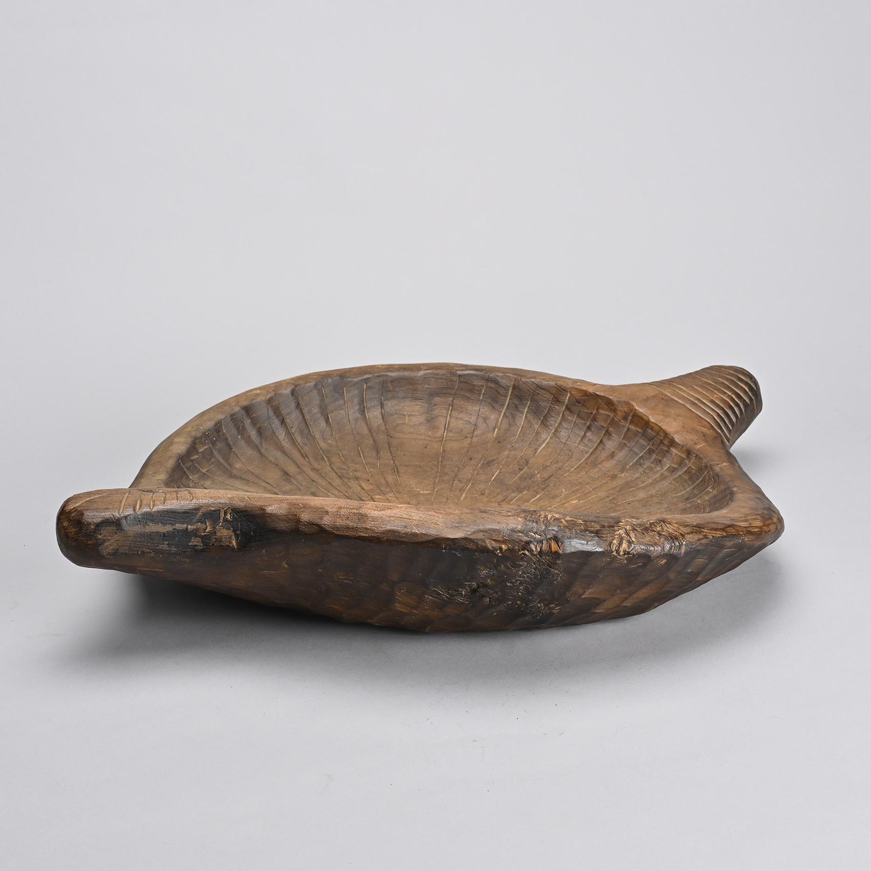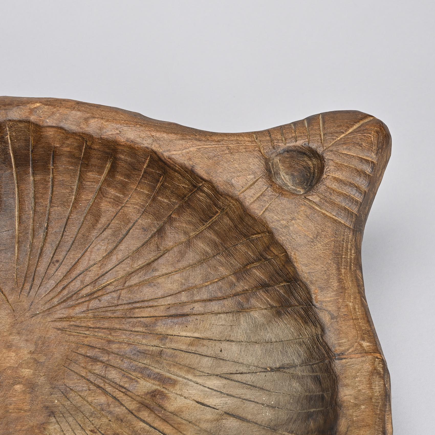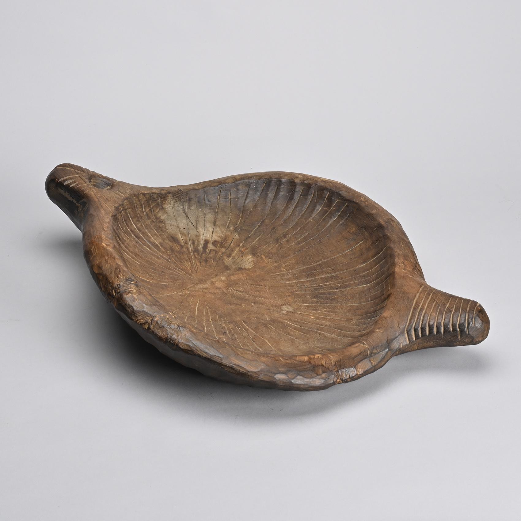 Hollow fruit bowl with two handles, carved from a single piece of wood using a gouge. The incised radial pattern highlights the maker's gesture and adds a graphic, almost symbolic presence. The surface bears a warm, raw patina, reflecting everyday domestic use.