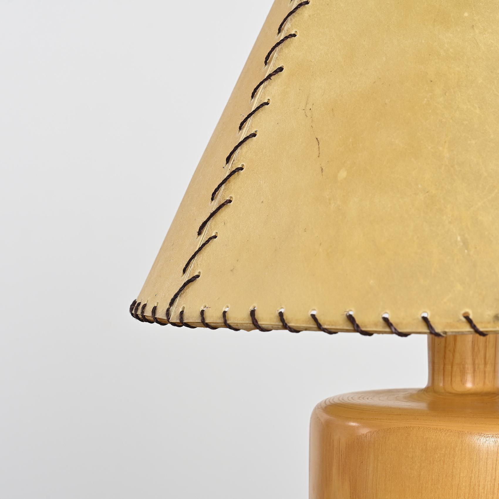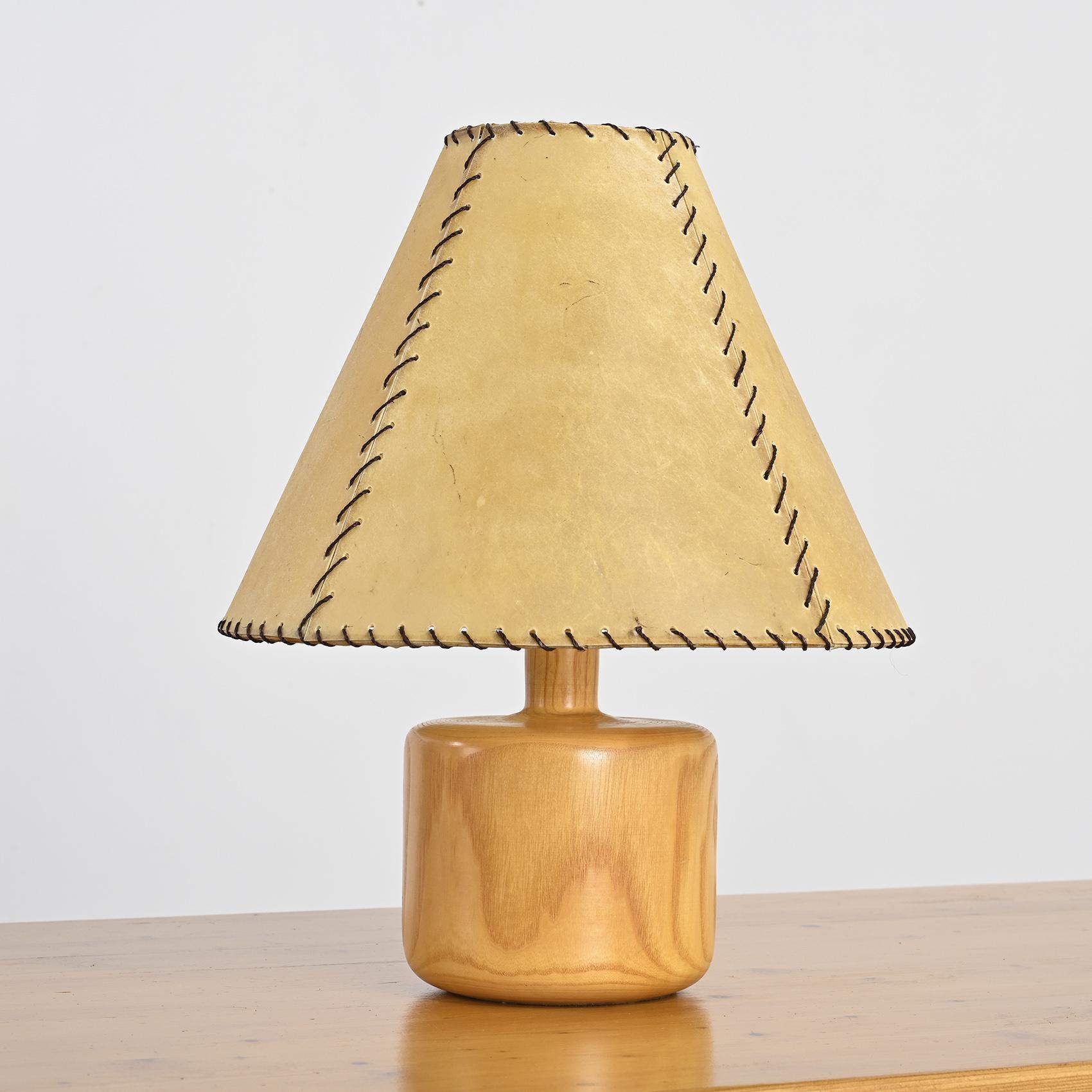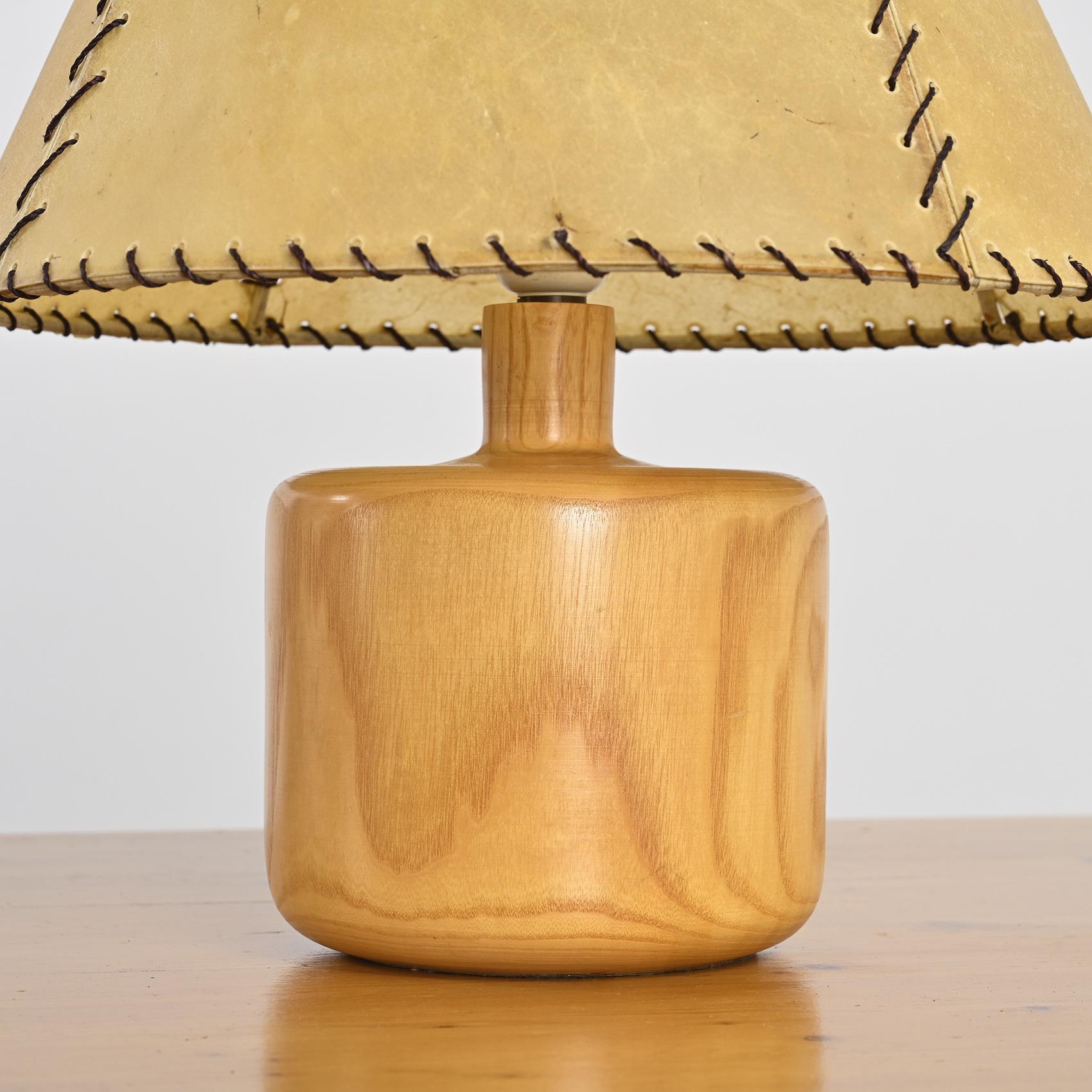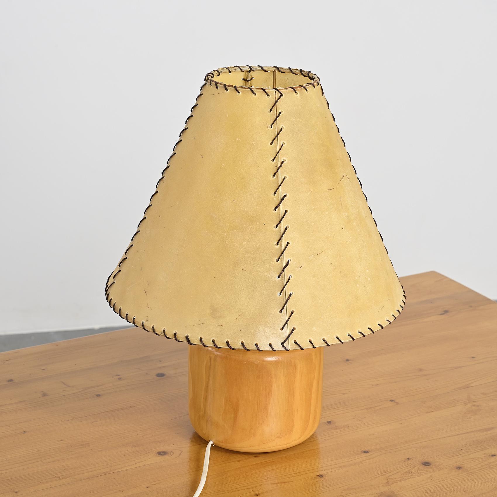 A table lamp in solid elm composed of two sculpted pieces on which rests a parchment lampshade.