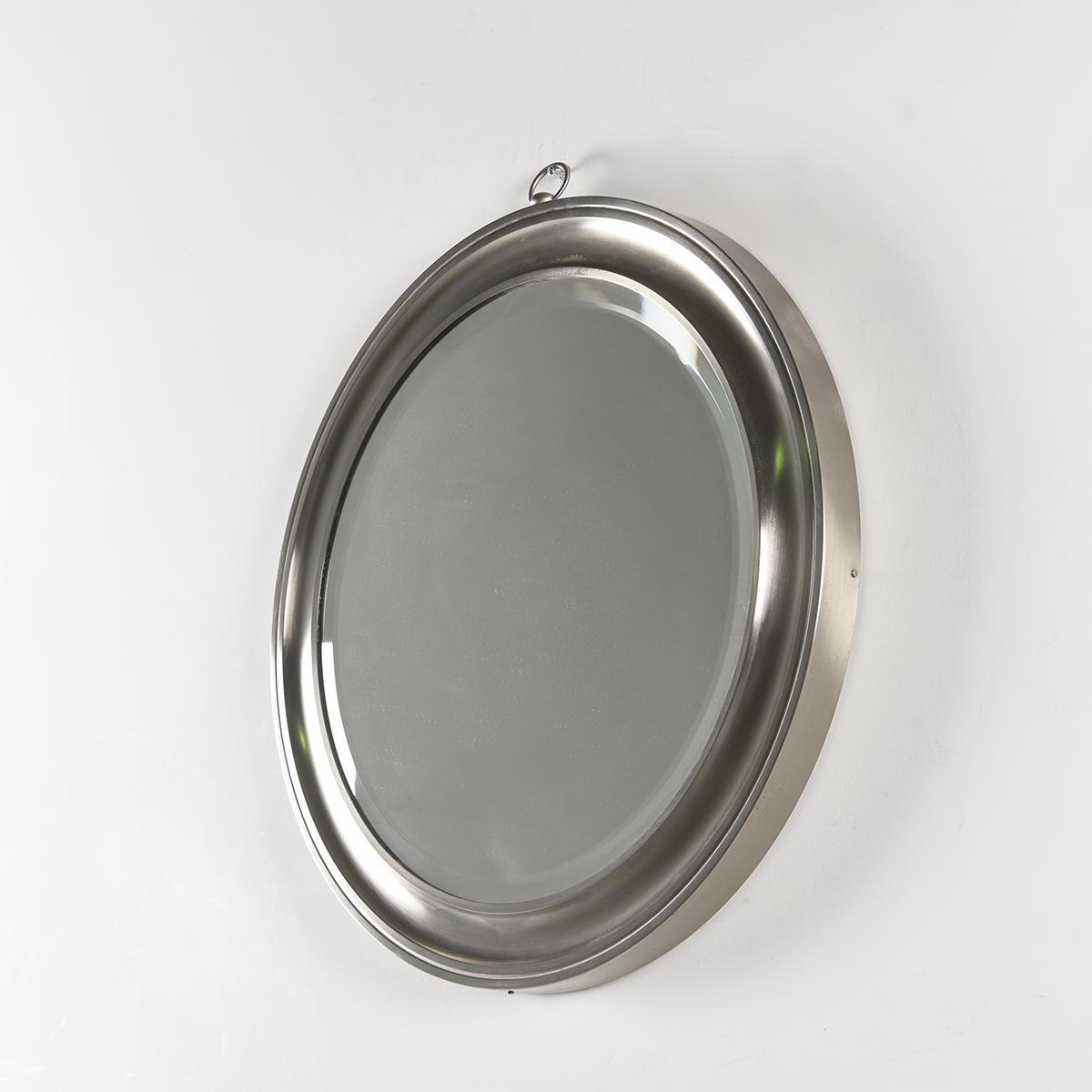 Sober and elegant circular Narciso model mirror with brushed aluminum frame.