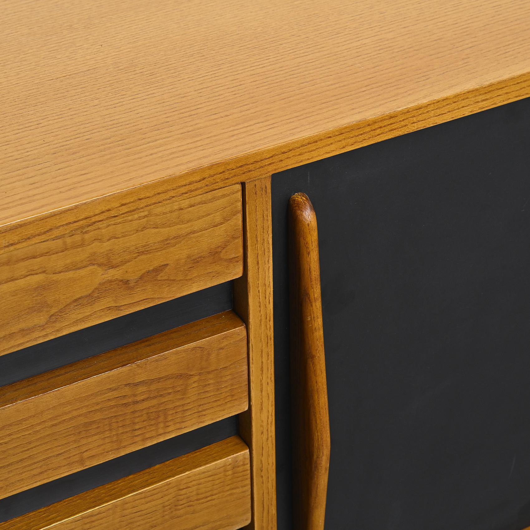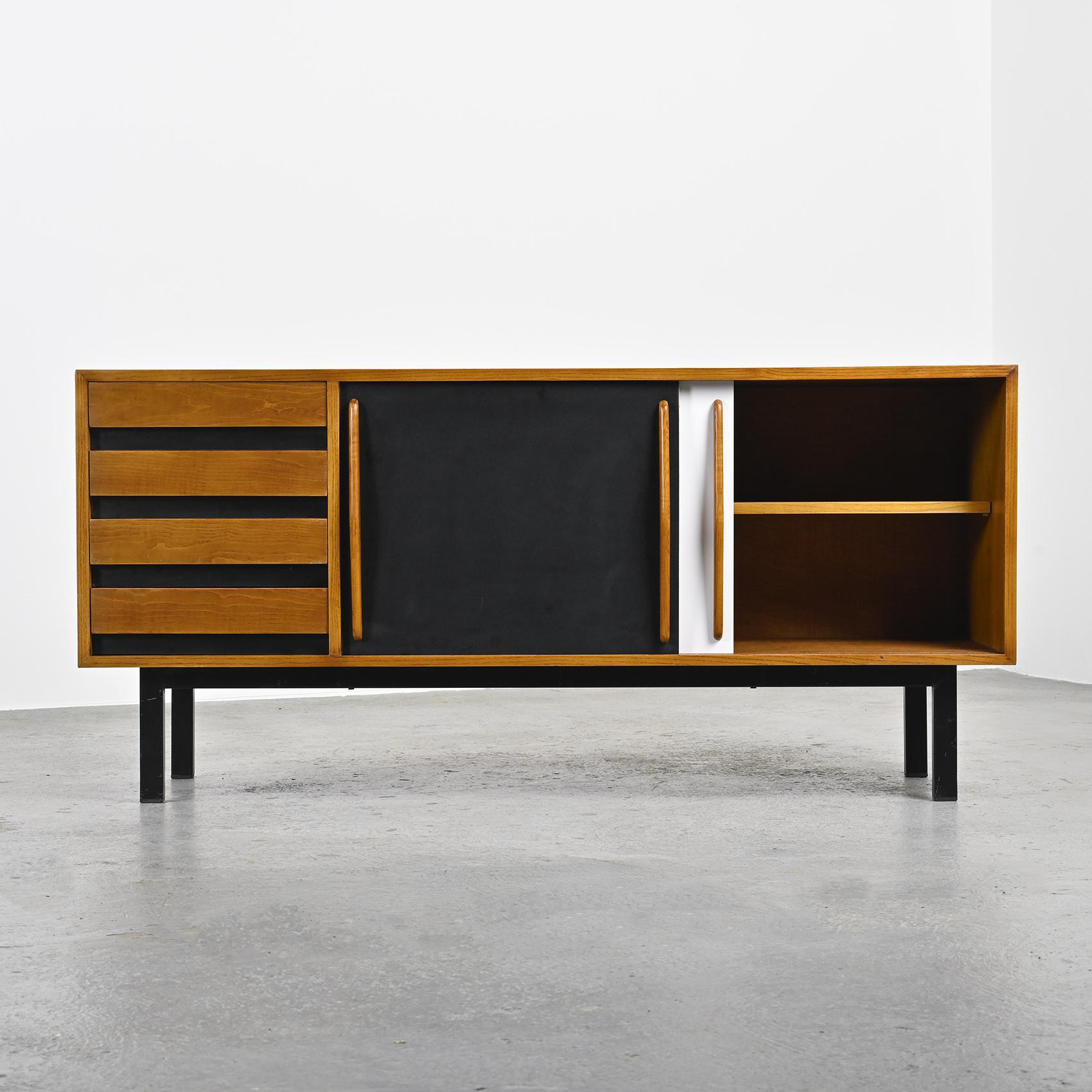Cansado sideboard in ash veneer, with two black and white laminate sliding doors, as well as four wooden drawers, all resting on a base in black lacquered metal.