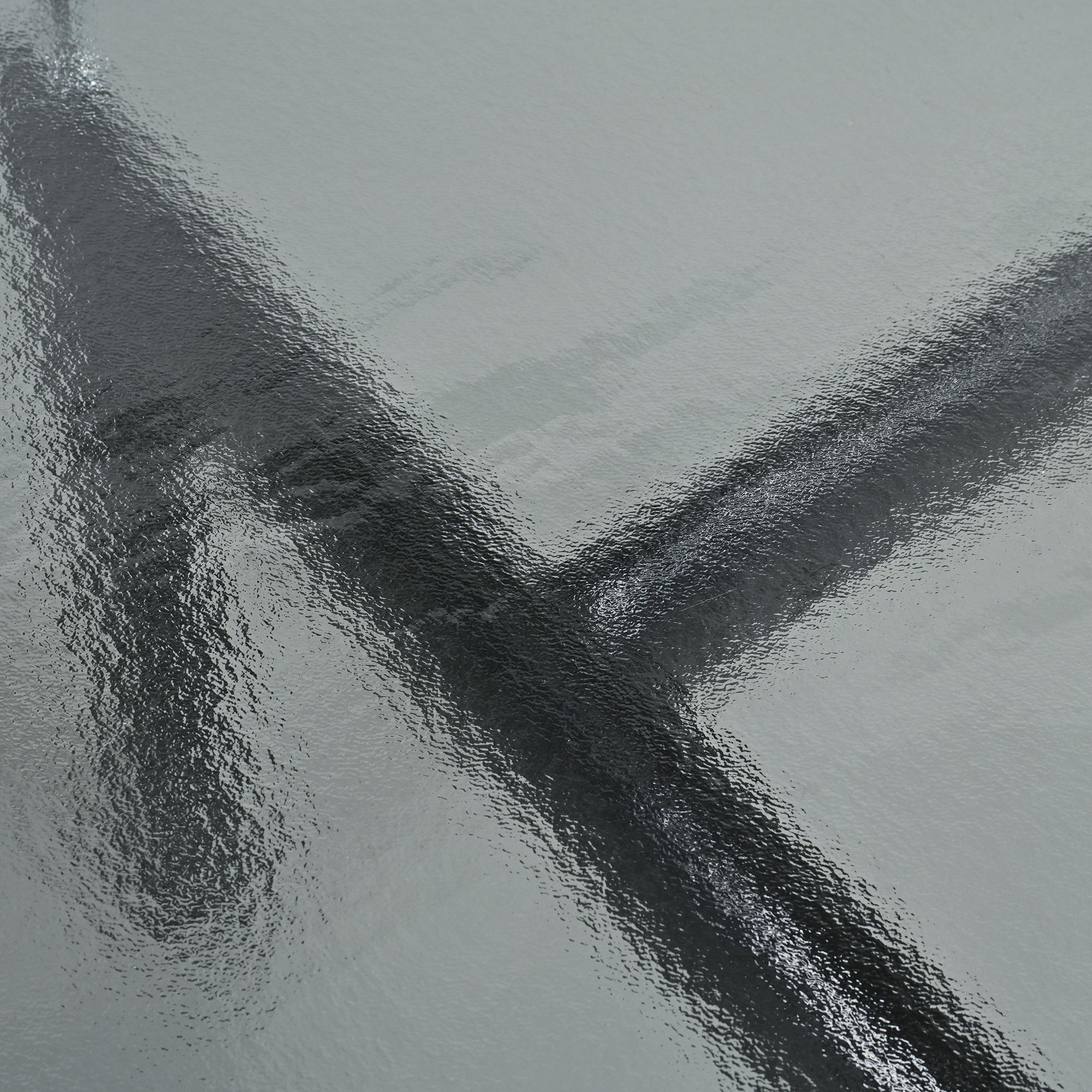 The design is defined by the contrast between a thick textured glass top, sand-cast on a sand bed, and a black painted steel base inspired by the ovoid profiles used in aeronautical engineering at the end of the 1920s. This manufacturing process results in a subtly irregular surface and a pronounced visual depth. The structure incorporates an adjustment system allowing the table height to be set between 69 and 74 cm. The composition reflects a technical and disciplined approach characteristic of the modernist language developed by its designers.