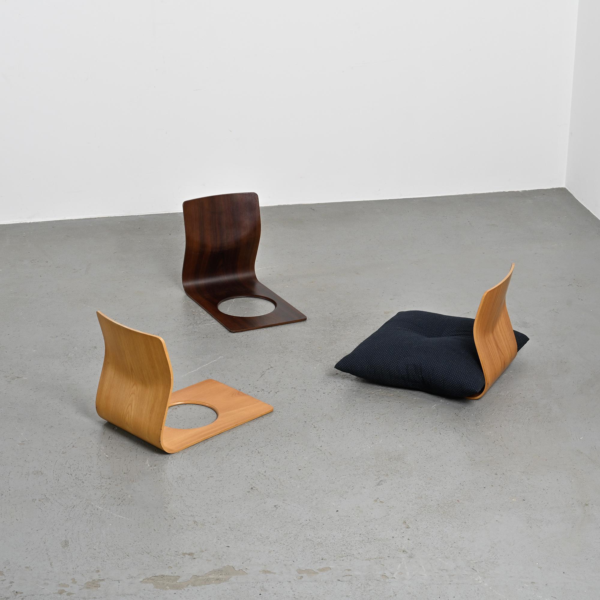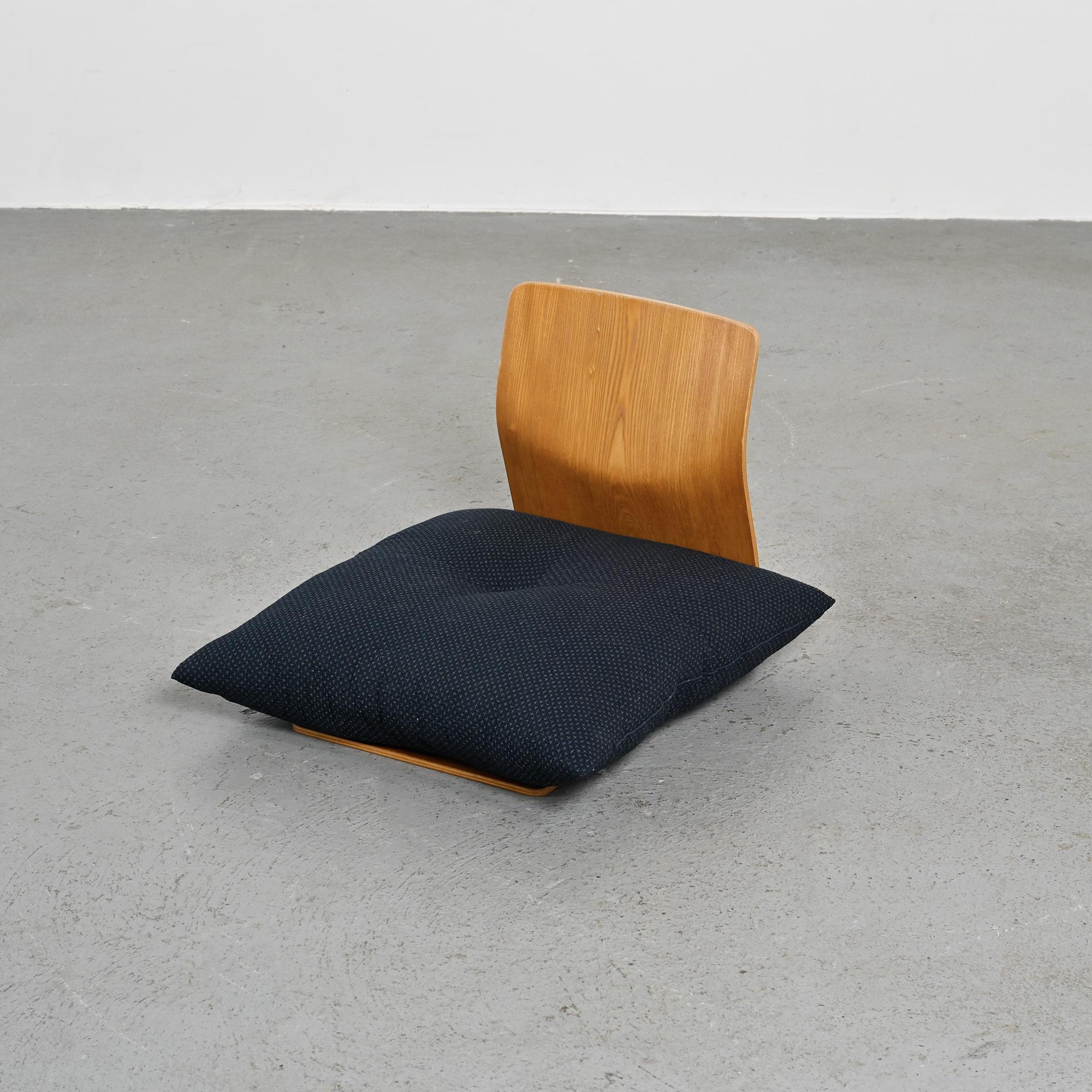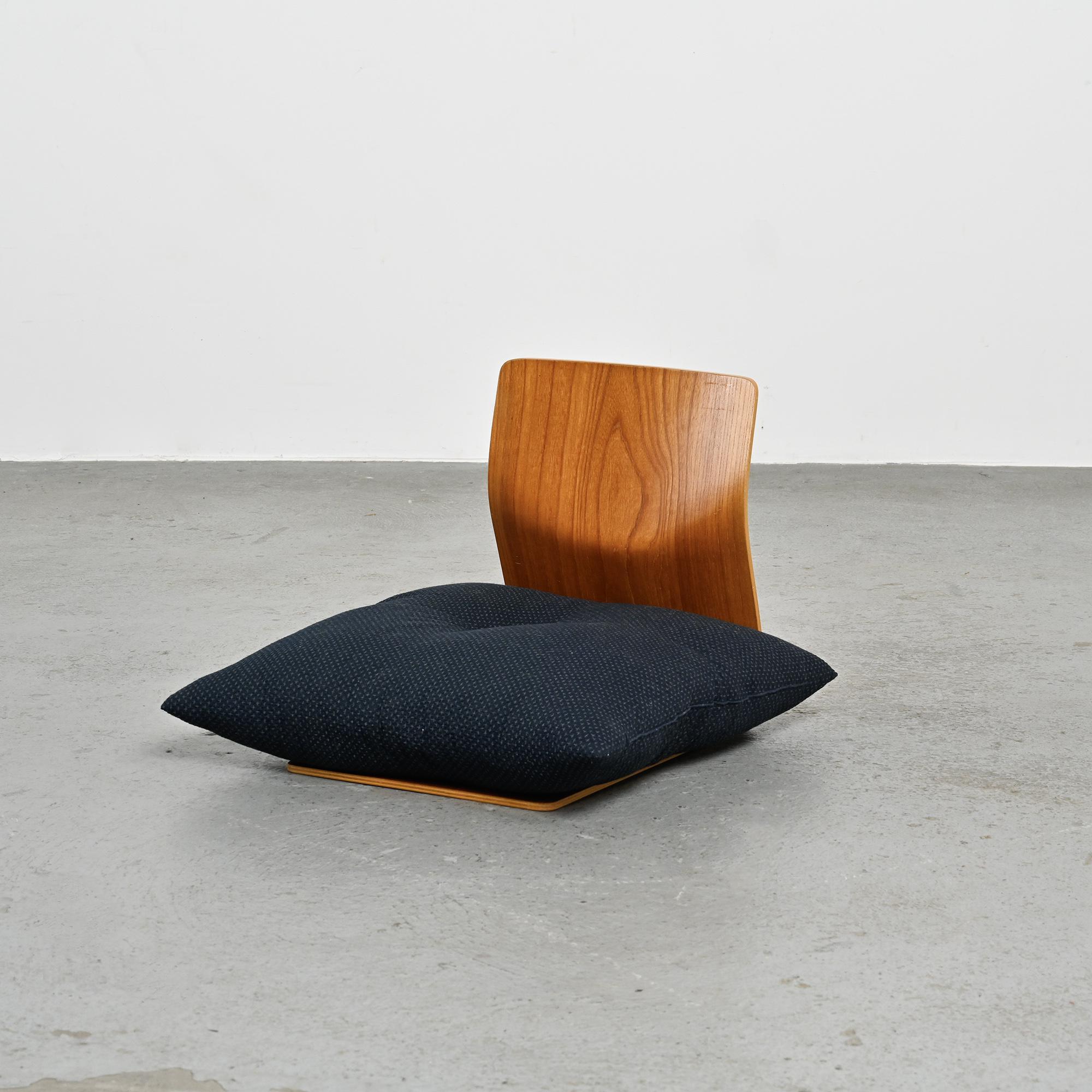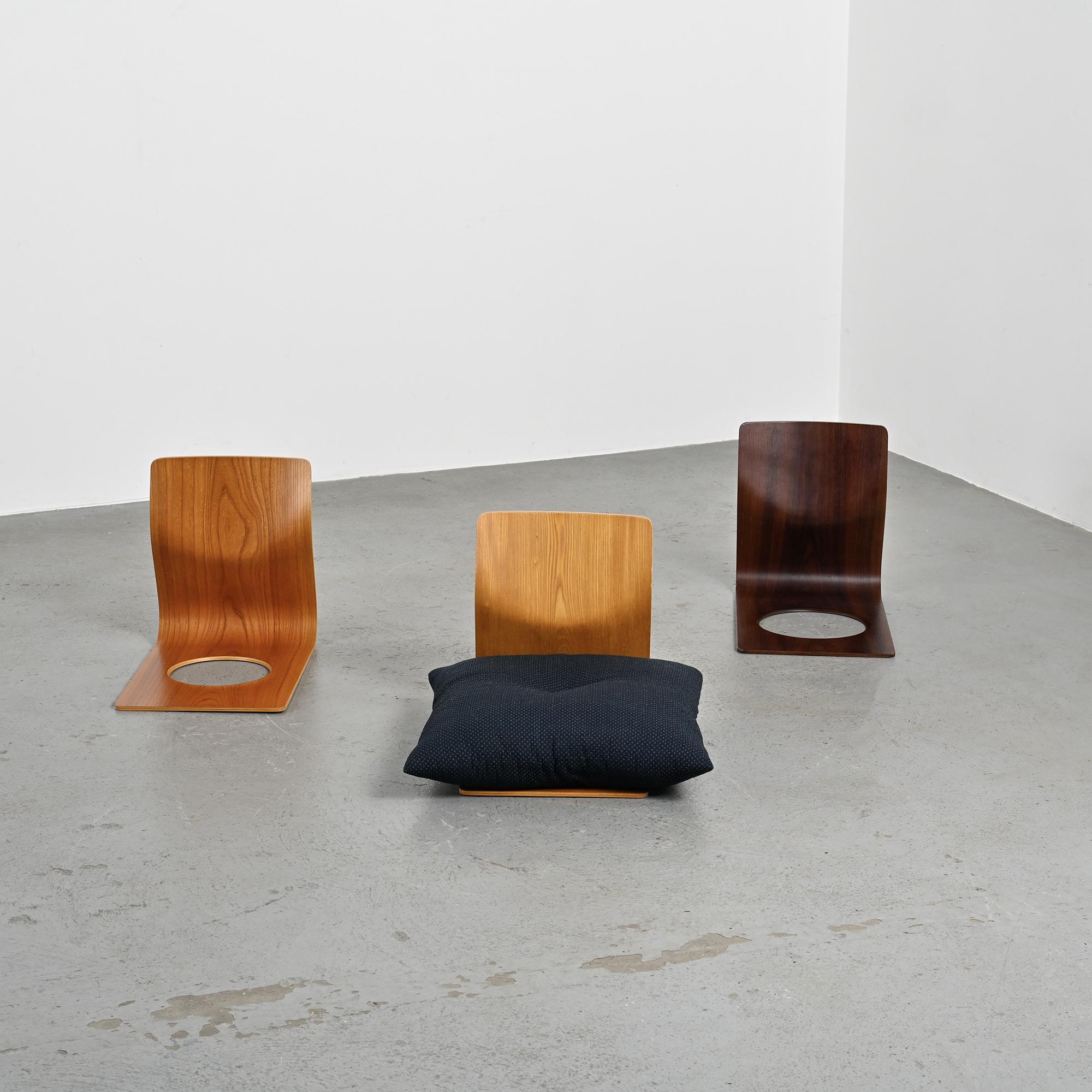 Conçue pour les intérieurs traditionnels japonais, cette assise au ras du sol se caractérise par une ligne continue formée d'une seule feuille de bois cintré. Réalisée en placage de hêtre ou de zelkova selon les exemplaires, elle illustre le savoir-faire technique développé par Tendo Mokko dans le travail du bois courbé durant l'après-guerre. Le dossier légèrement incliné assure un confort naturel. L'ouverture circulaire pratiquée dans l'assise permet de maintenir un coussin en place.