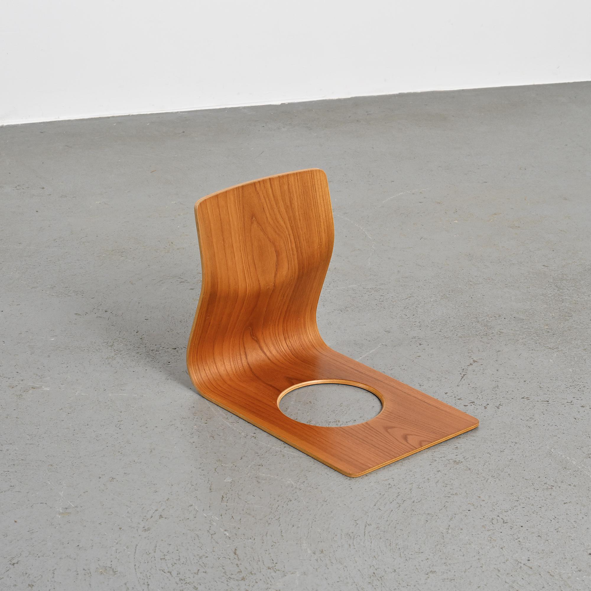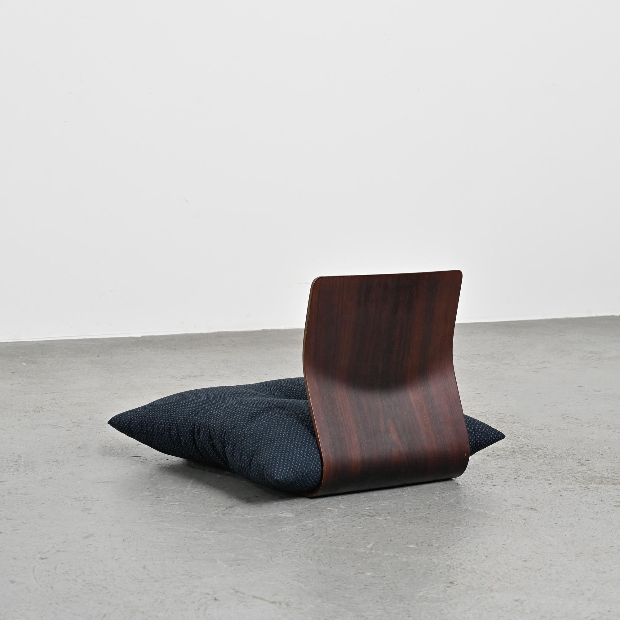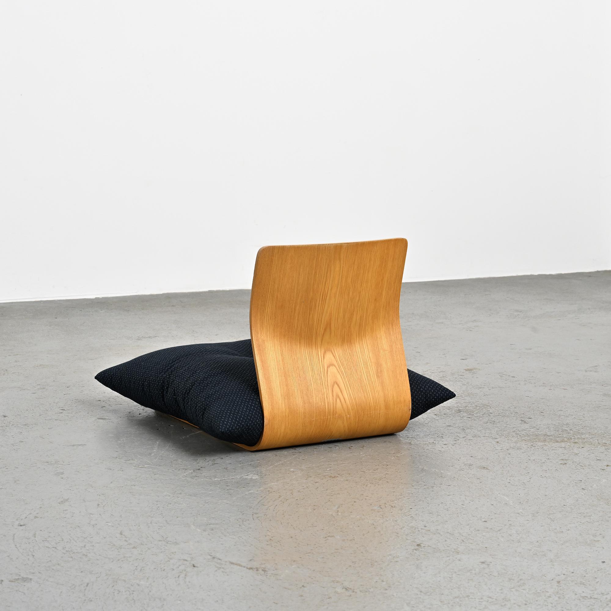 Conçue pour les intérieurs traditionnels japonais, cette assise au ras du sol se caractérise par une ligne continue formée d'une seule feuille de bois cintré. Réalisée en placage de hêtre ou de zelkova selon les exemplaires, elle illustre le savoir-faire technique développé par Tendo Mokko dans le travail du bois courbé durant l'après-guerre. Le dossier légèrement incliné assure un confort naturel. L'ouverture circulaire pratiquée dans l'assise permet de maintenir un coussin en place.