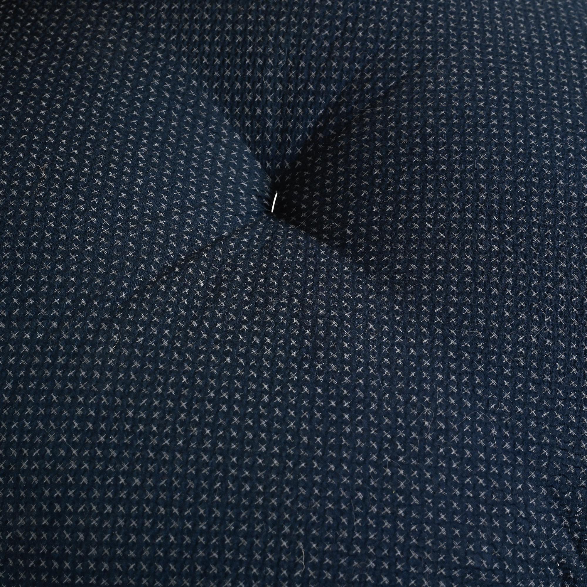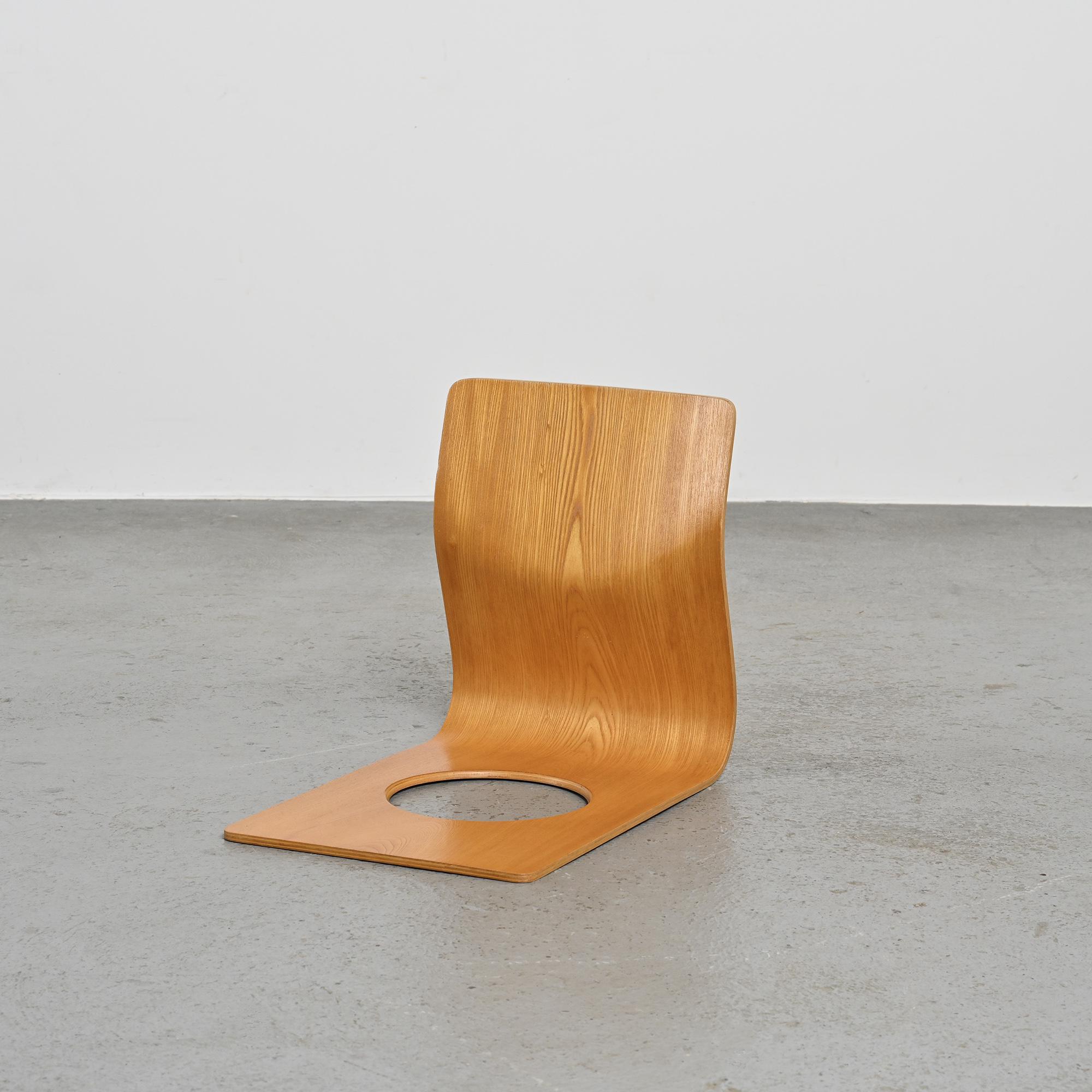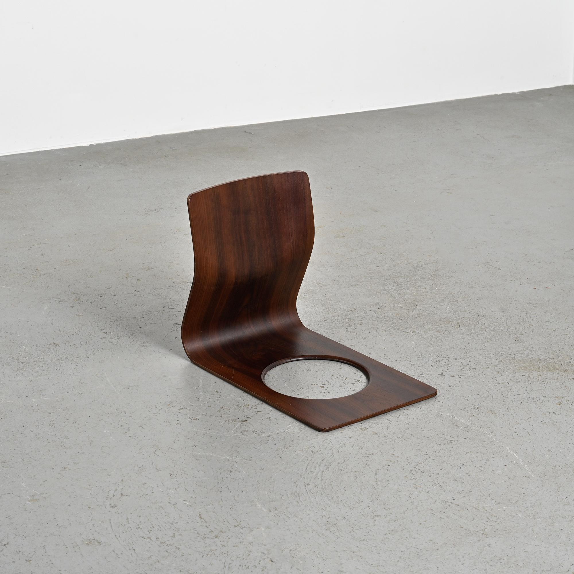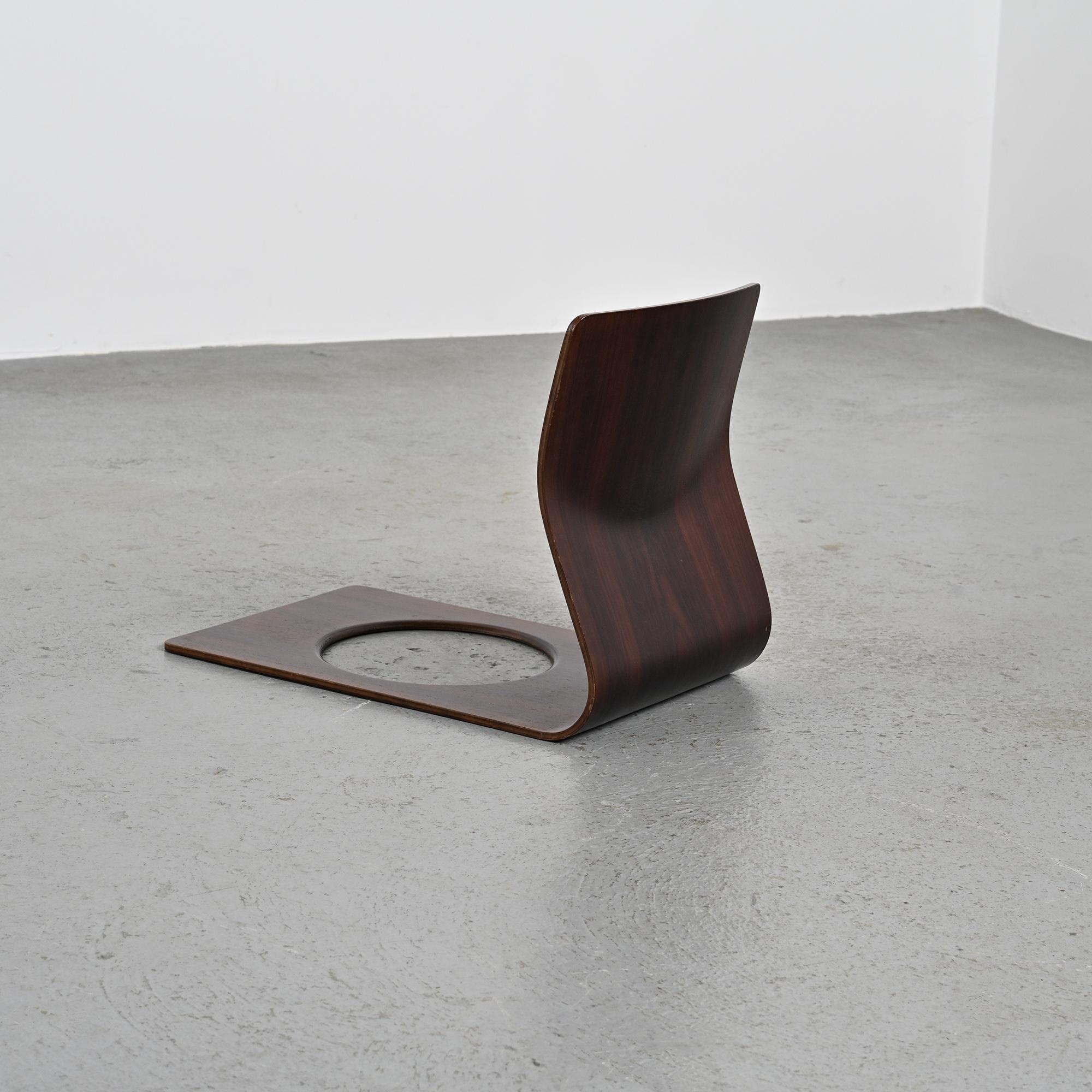 Conçue pour les intérieurs traditionnels japonais, cette assise au ras du sol se caractérise par une ligne continue formée d'une seule feuille de bois cintré. Réalisée en placage de hêtre ou de zelkova selon les exemplaires, elle illustre le savoir-faire technique développé par Tendo Mokko dans le travail du bois courbé durant l'après-guerre. Le dossier légèrement incliné assure un confort naturel. L'ouverture circulaire pratiquée dans l'assise permet de maintenir un coussin en place.