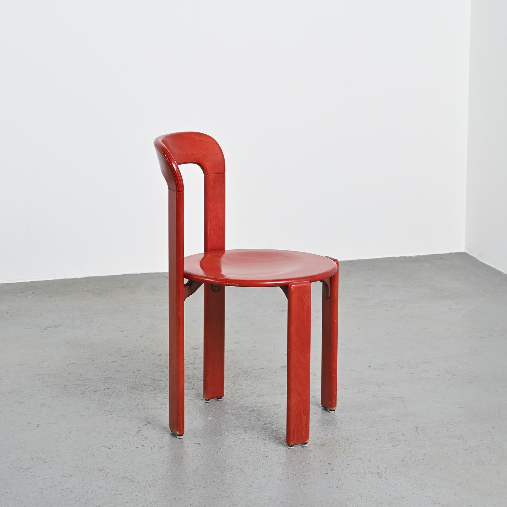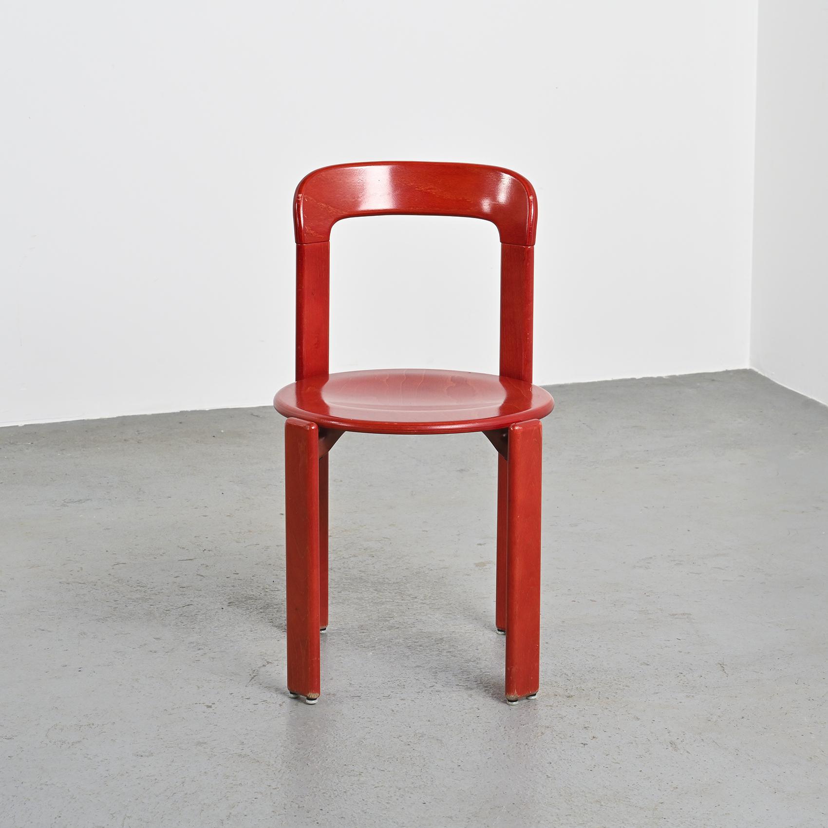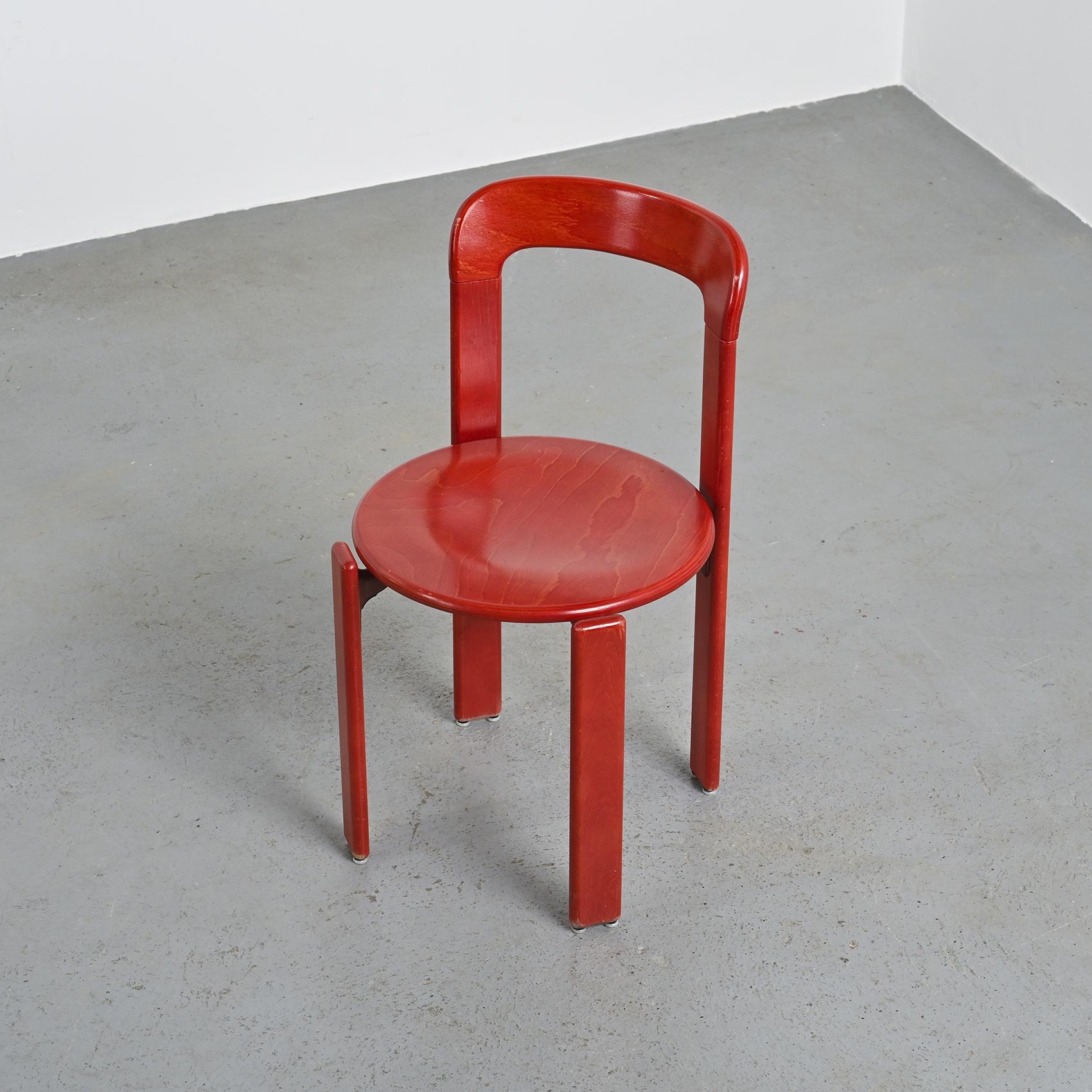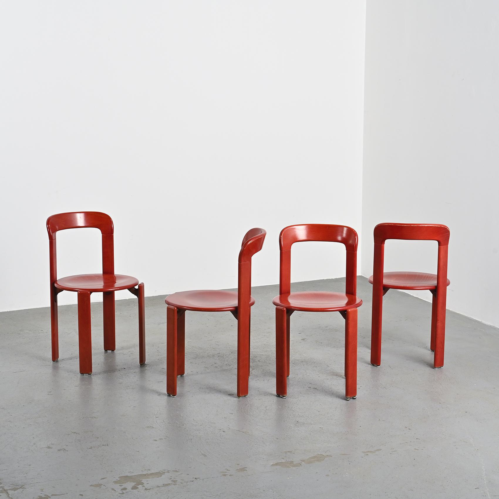 Suite de quatre chaises, modèle "Rey Chair", dessinées par Bruno Rey et fabriquées en bois de hêtre teinté rouge par Dietiker à Stein am Rhein, vers 1971.