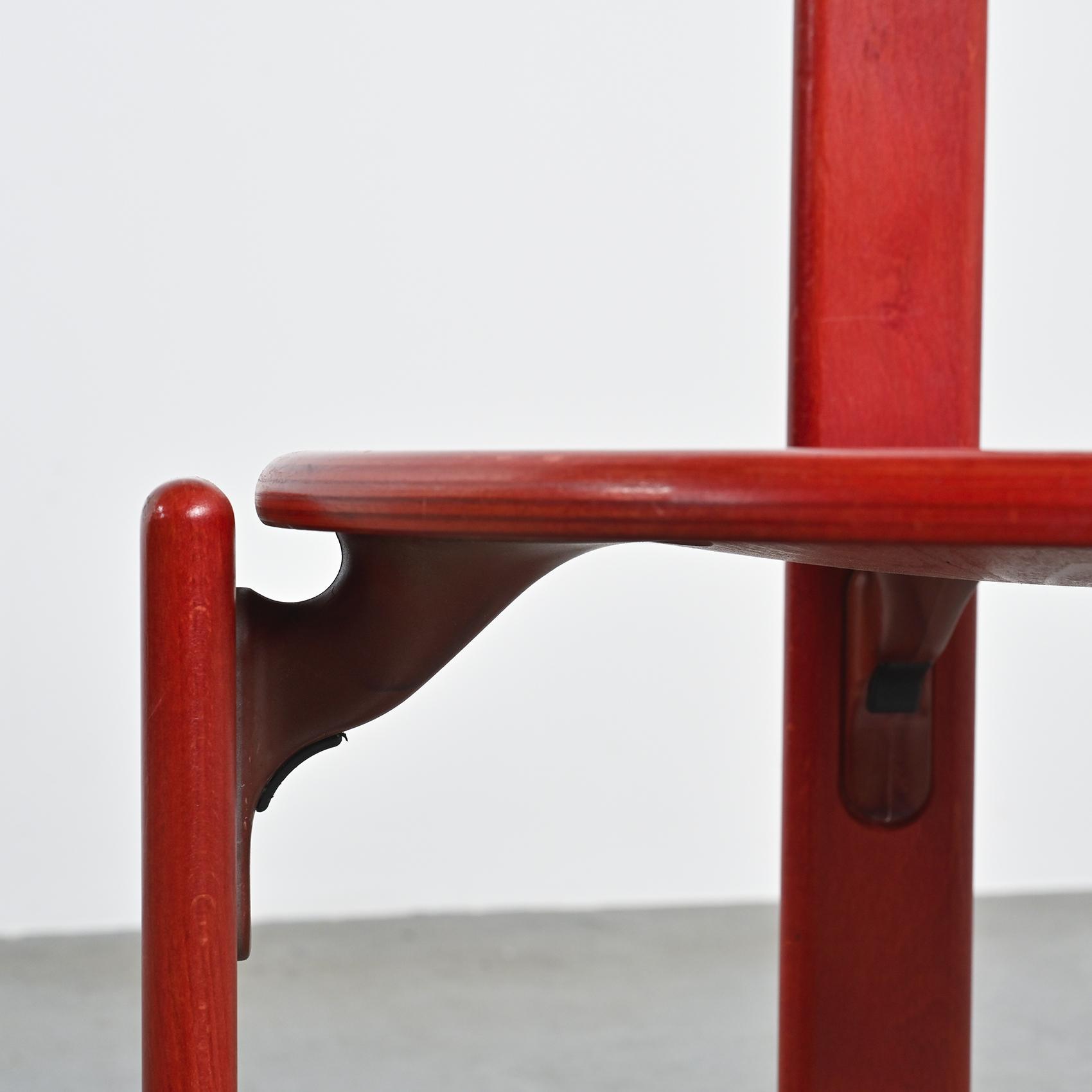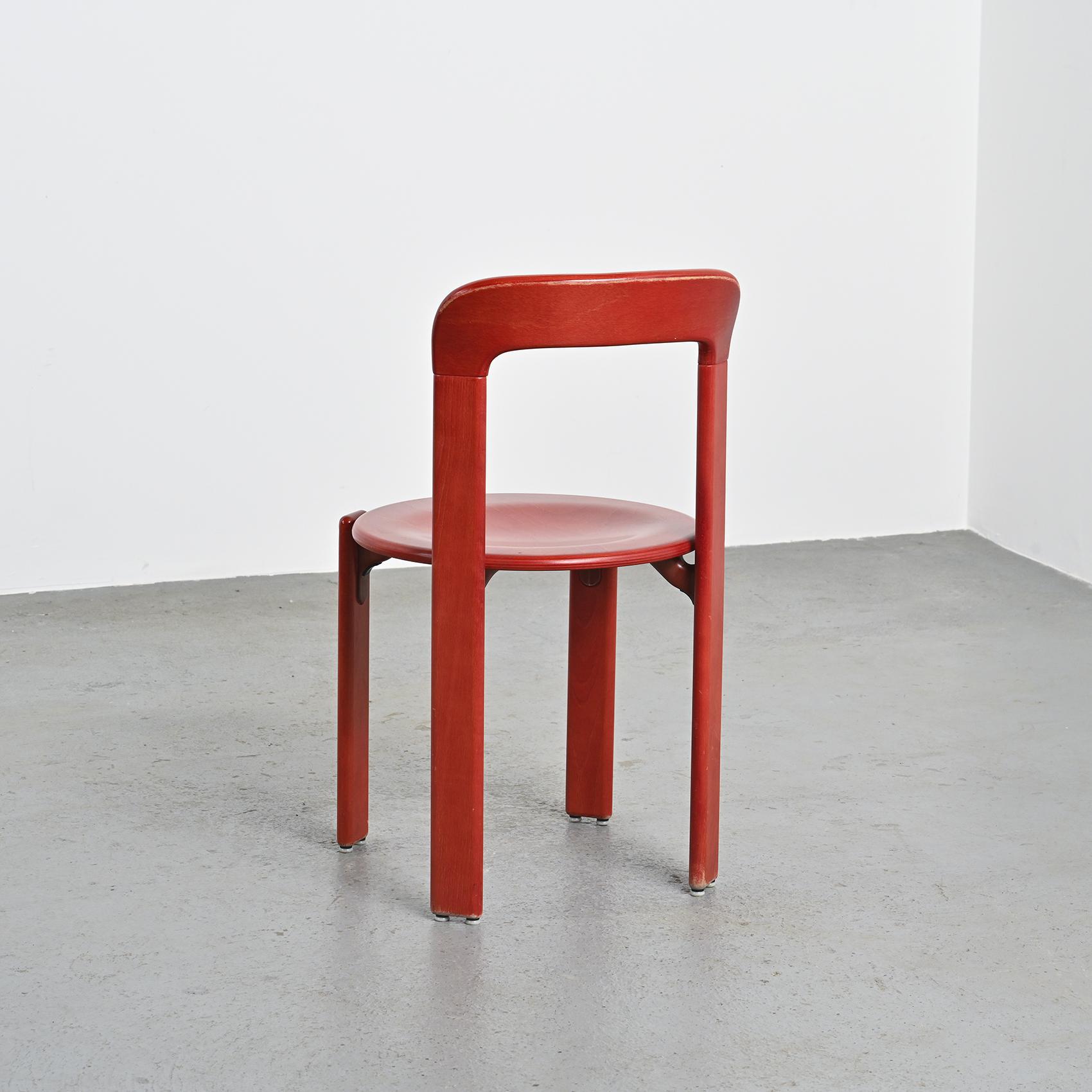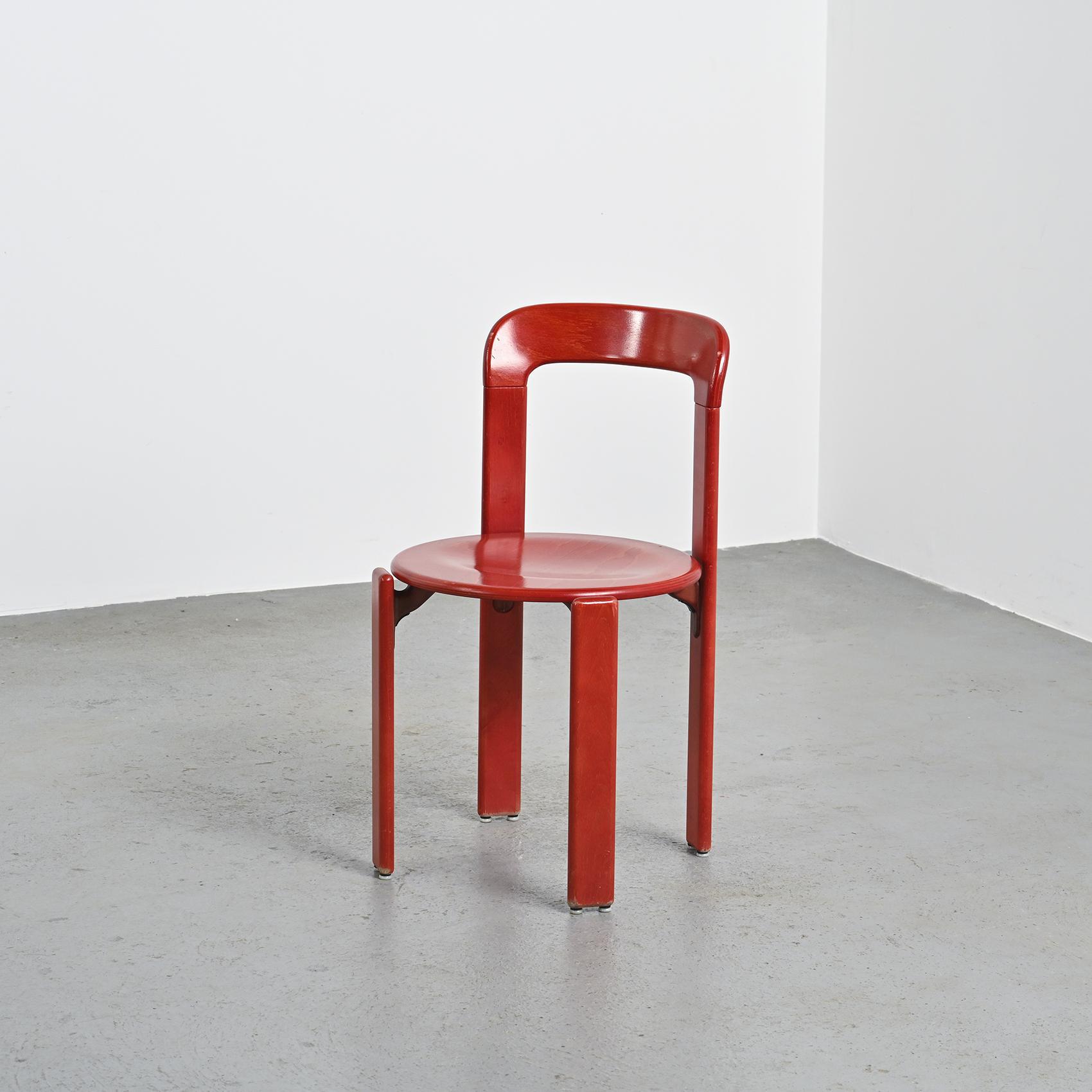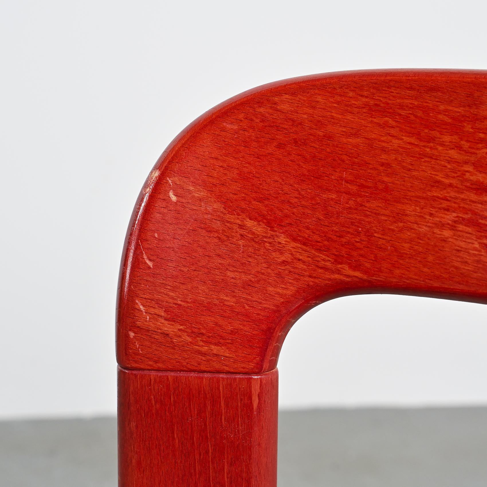 Suite de quatre chaises, modèle "Rey Chair", dessinées par Bruno Rey et fabriquées en bois de hêtre teinté rouge par Dietiker à Stein am Rhein, vers 1971.