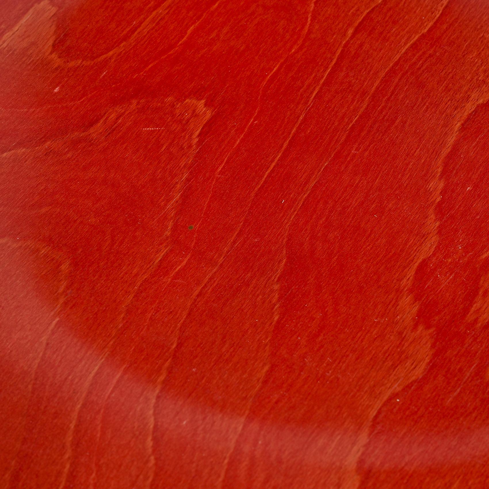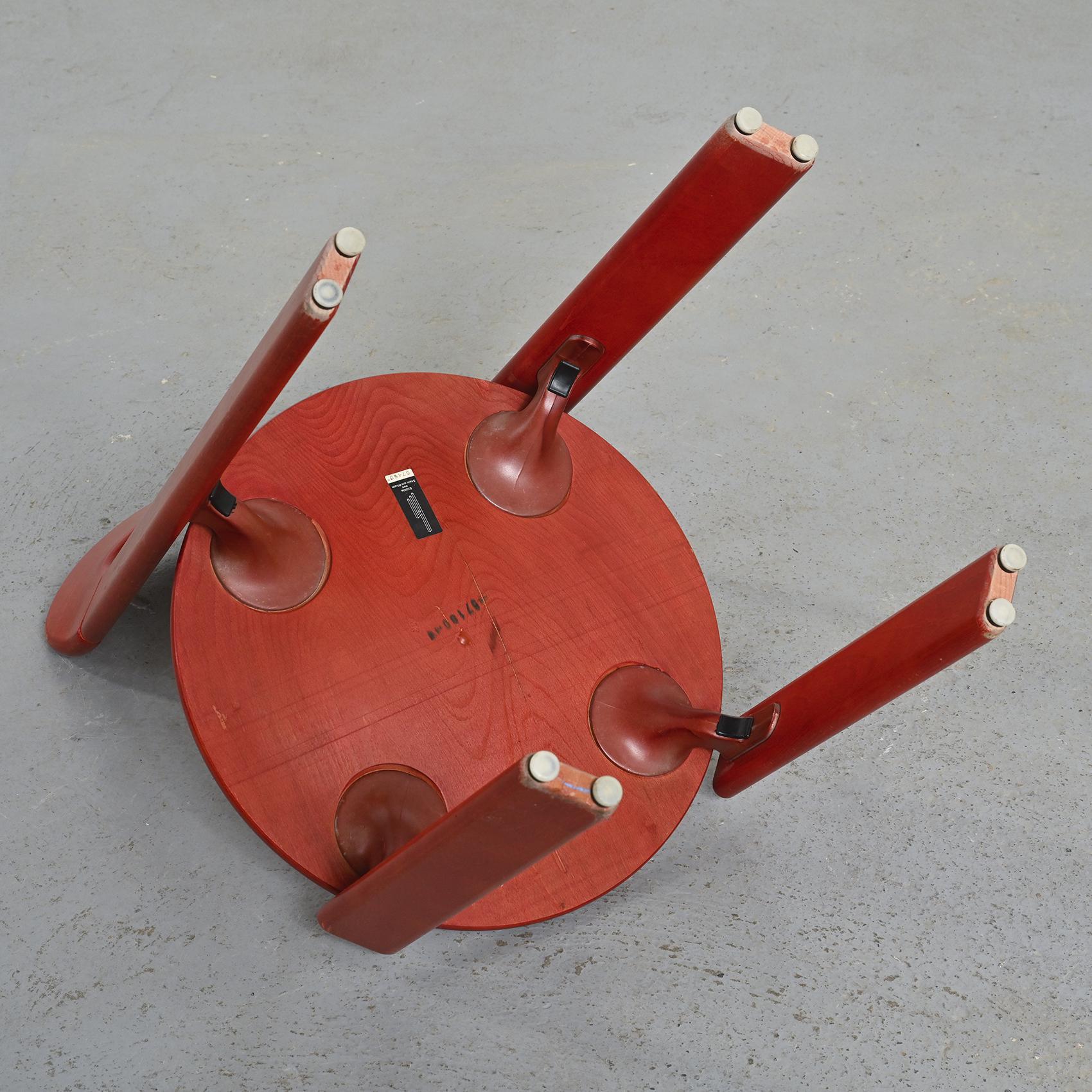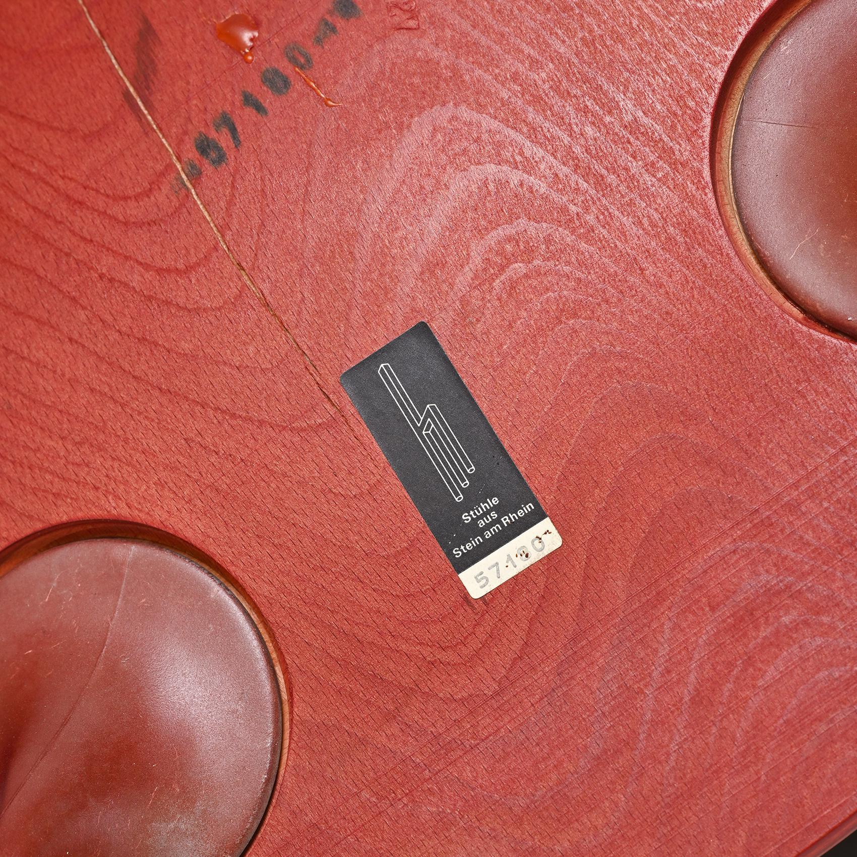 Icônes du design suisse, ces chaises se distinguent par leur assemblage novateur sans vis apparentes, alliant solidité, souplesse et élégance formelle. Leur finition laquée rouge d'origine offre une belle patine, avec de légères marques d'usage cohérentes avec l'âge.