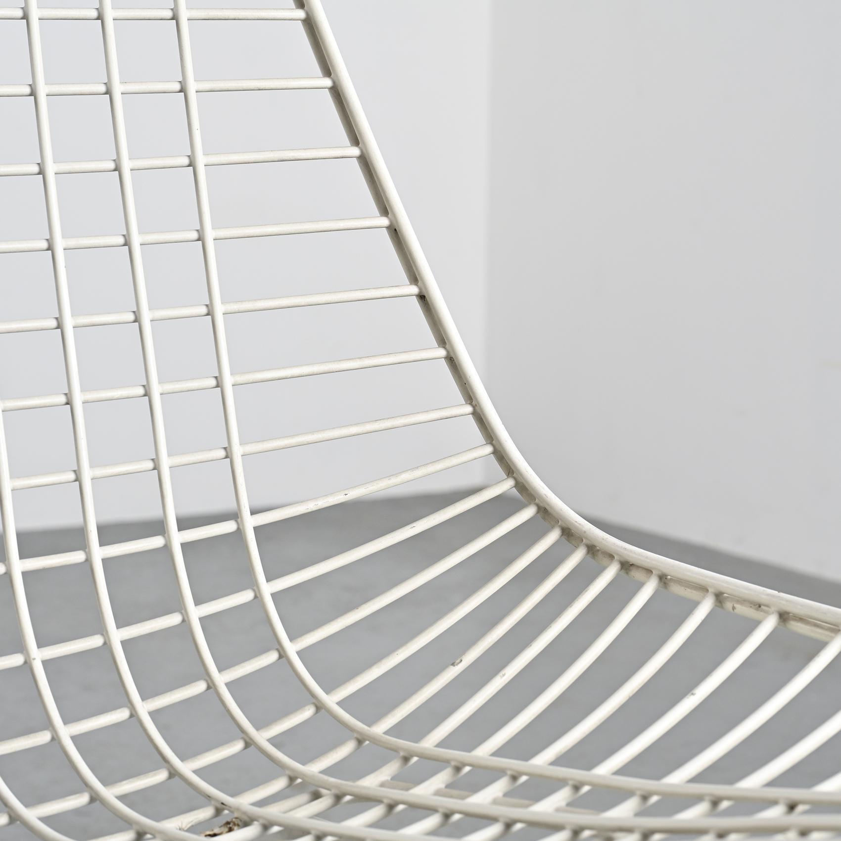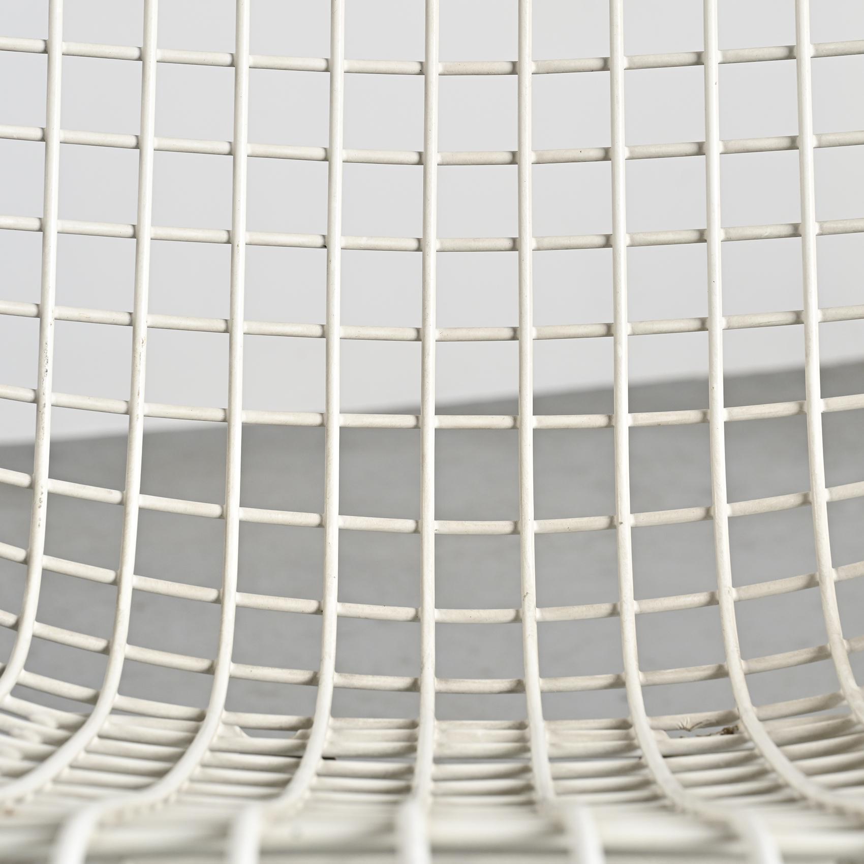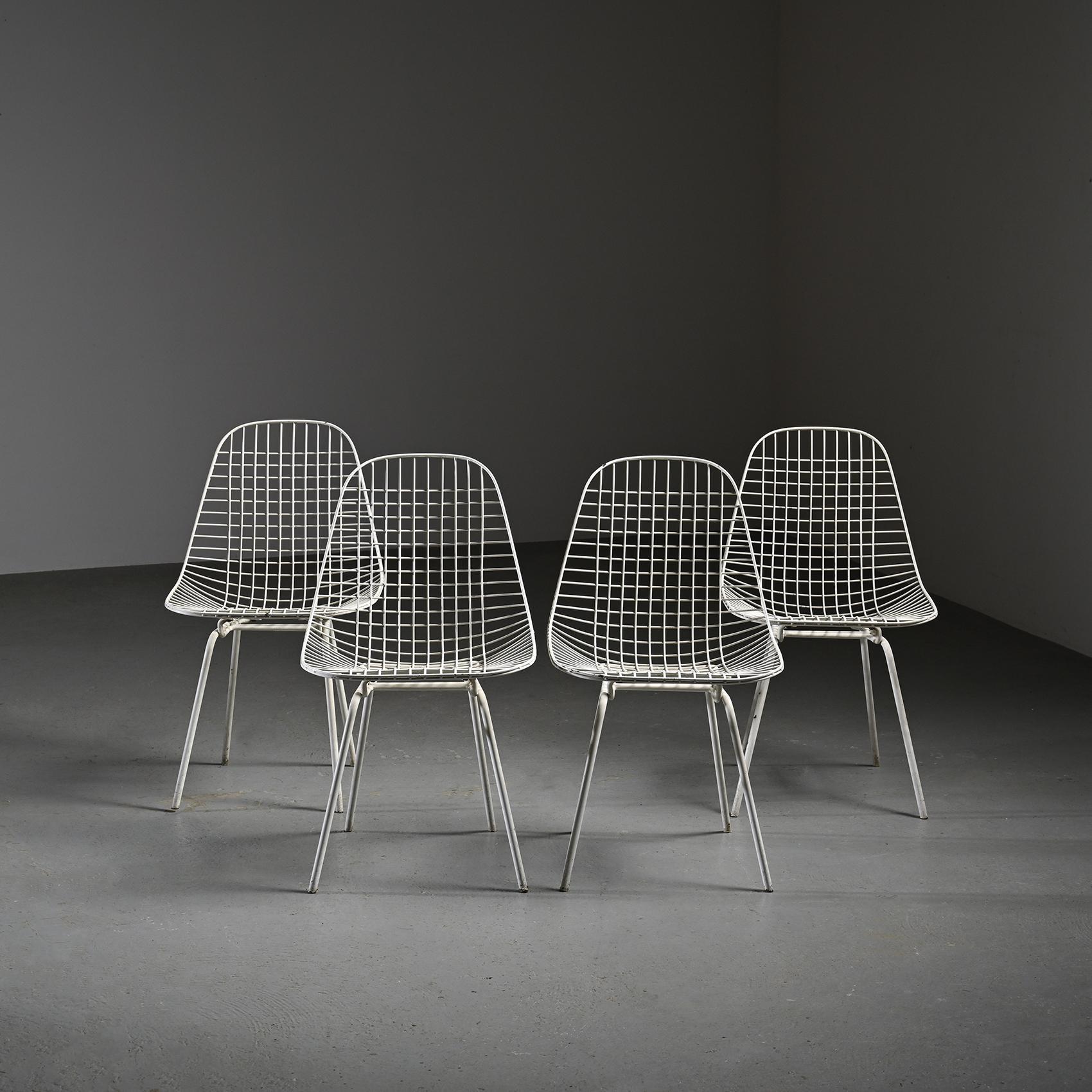 Ces chaises emblématiques, issues de la série "Wire Chair", sont réalisées en fil d'acier soudé, ici recouvert d'une finition laquée blanche. Leur structure aérienne allie légèreté visuelle et robustesse technique, témoignant de l'approche novatrice des Eames dans l'utilisation des matériaux industriels. Ce modèle "Bikini" est caractérisé par son cadre ergonomique conçu pour épouser la forme du corps, offrant un confort optimal même en l'absence de coussins.