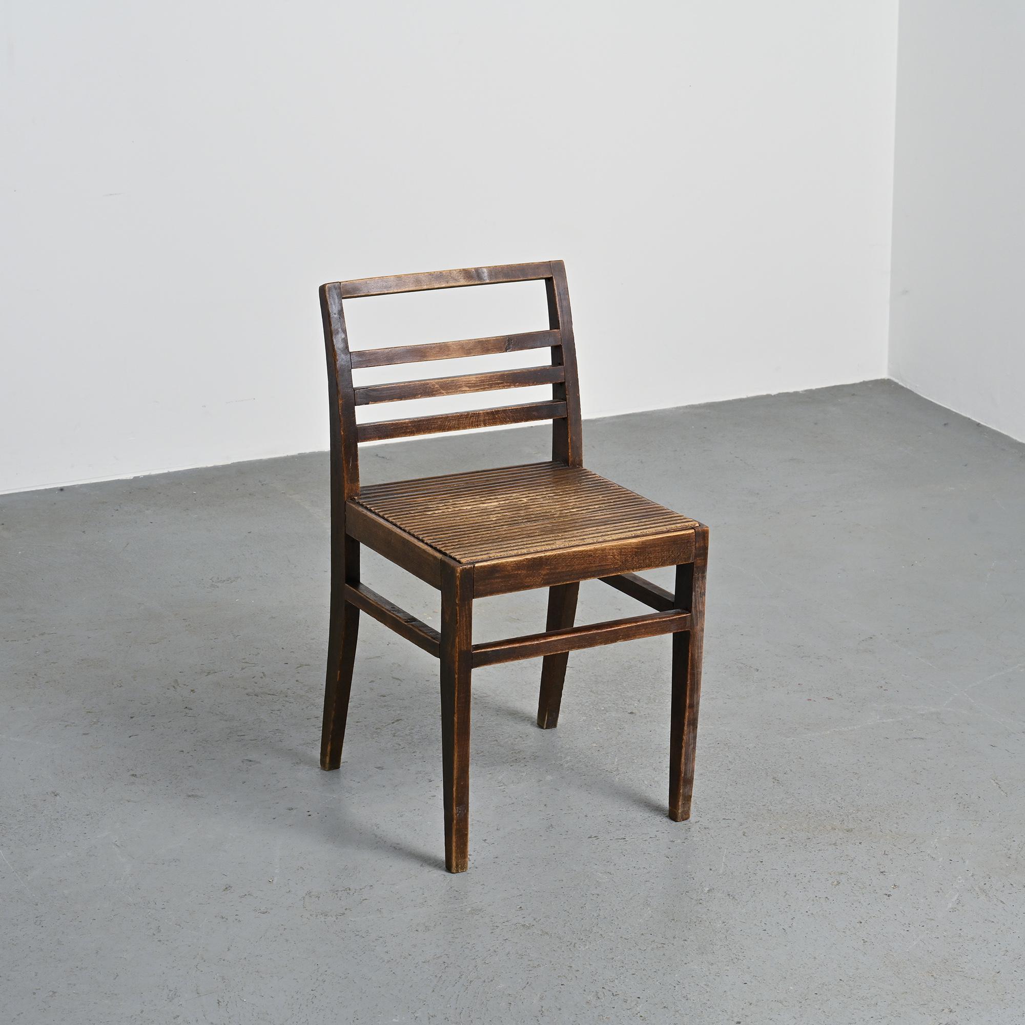 Featuring grooved wooden slats on the seat and a backrest with three horizontal bars, these chairs reflect the simplicity and rational design typical of the French postwar reconstruction period. Functional and durable, they embody René Gabriel's vision of democratic design and his contribution to the modernist movement in France during the 1940s.