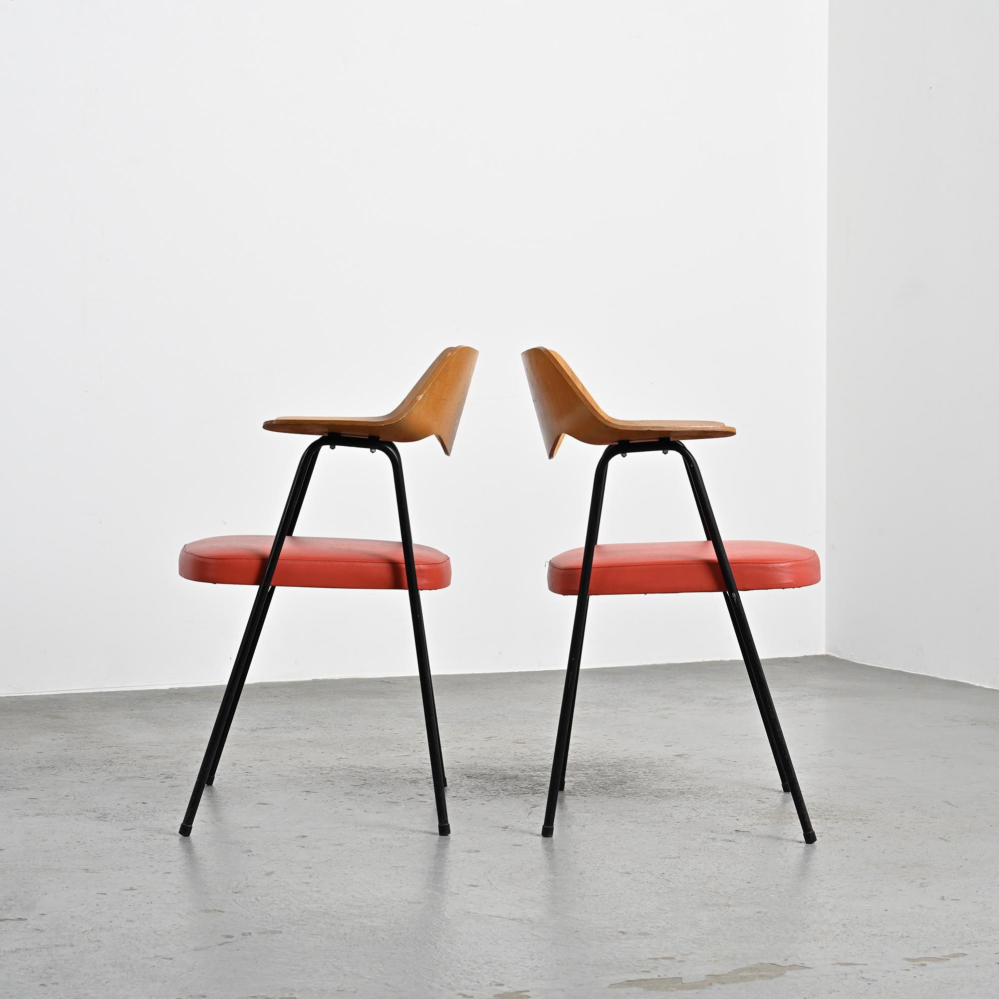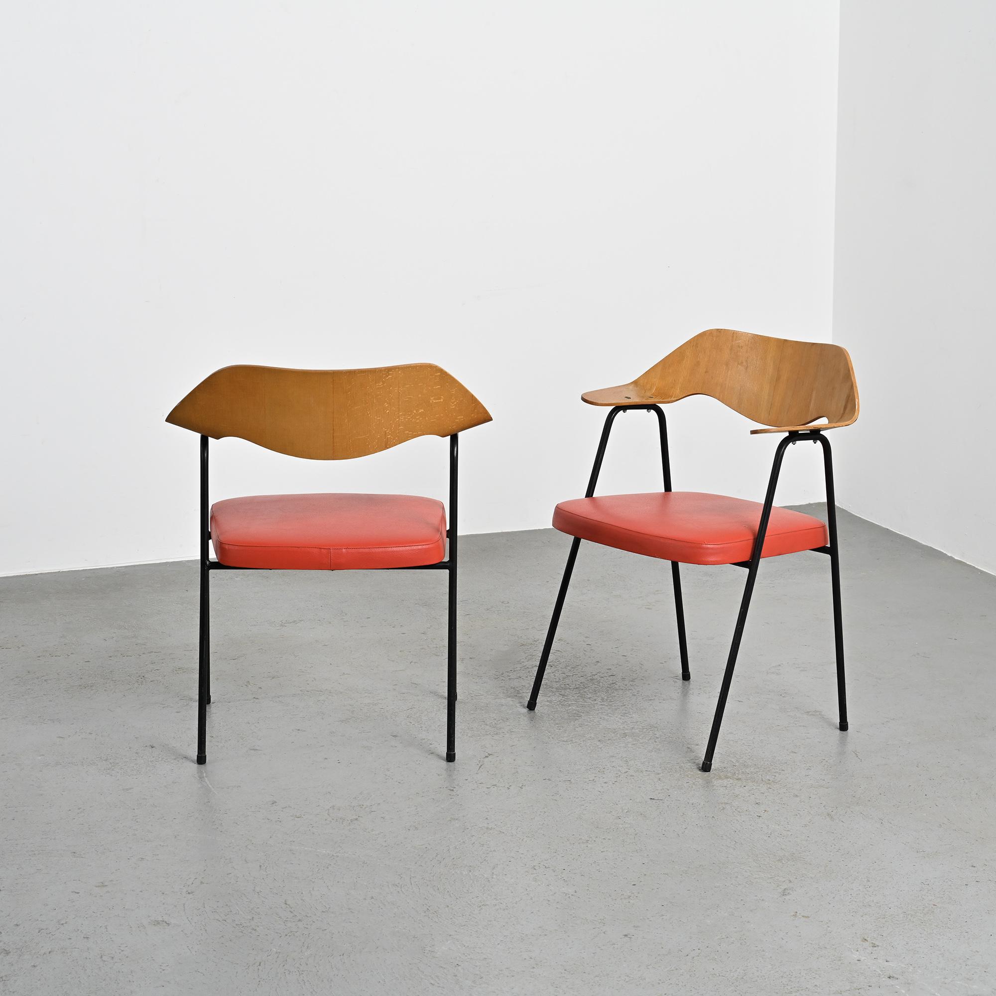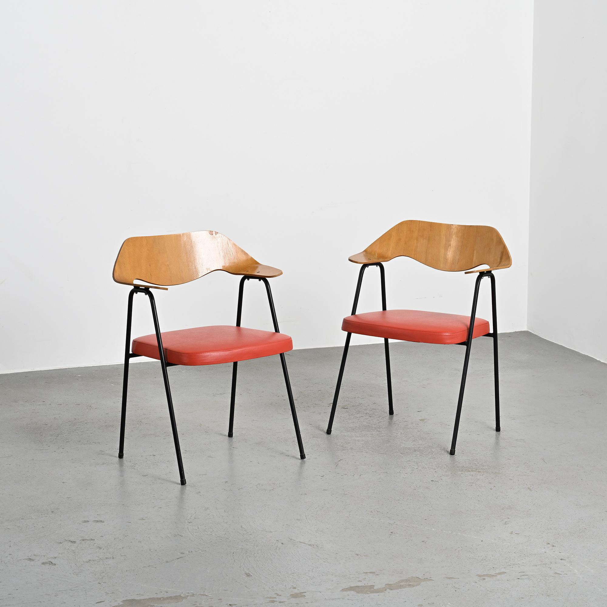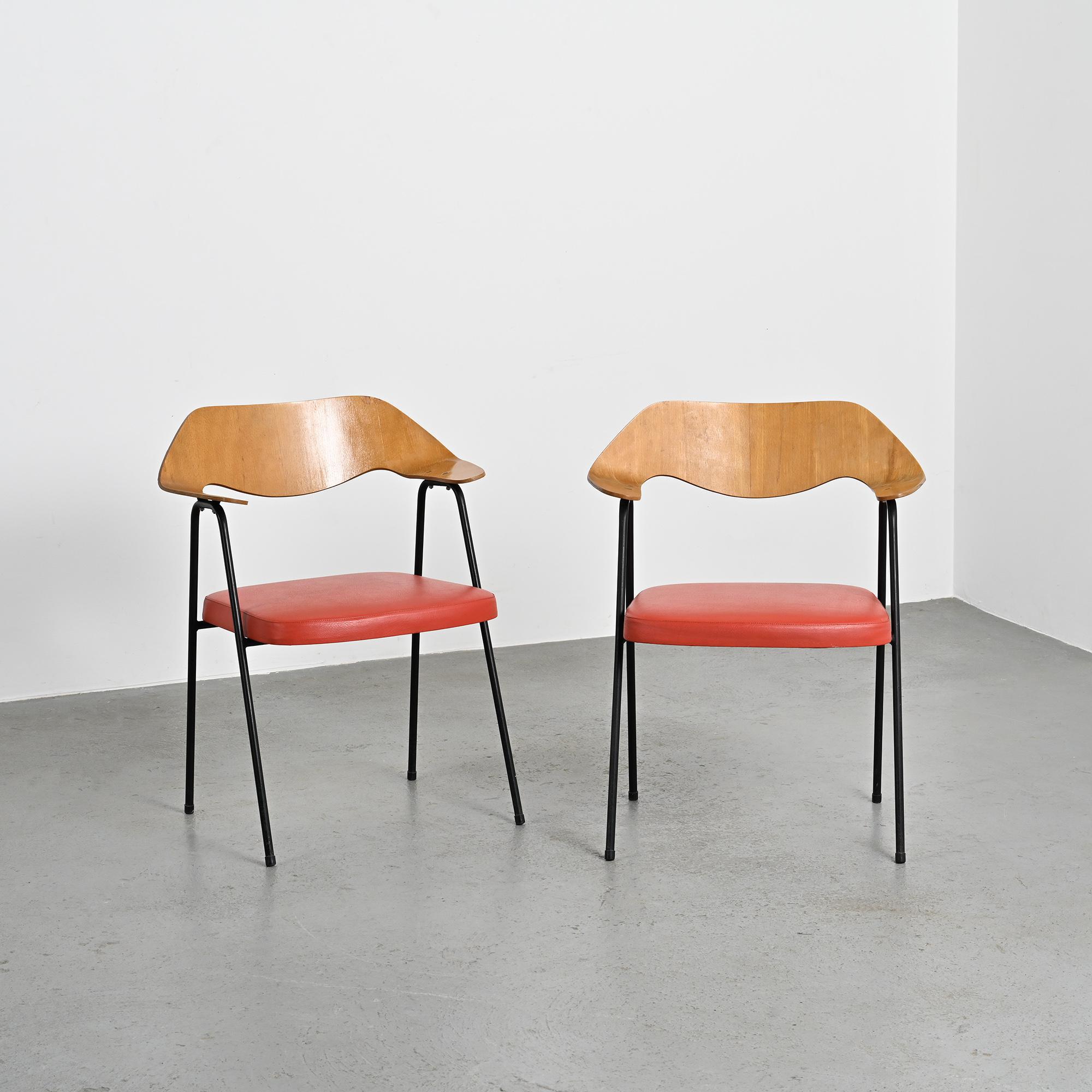 Chaque fauteuil repose sur une structure tubulaire en métal laqué noir formant un piétement fin et élancé. Le dossier, en bois moulé et contreplaqué cintré, constitue l'élément principal de la composition. Sa forme large et légèrement enveloppante assure le maintien du dos tout en dessinant une ligne fluide et structurée. L'assise seule est garnie de mousse et recouverte d'un simili cuir rouge. La hauteur d'assise est de 46 cm.