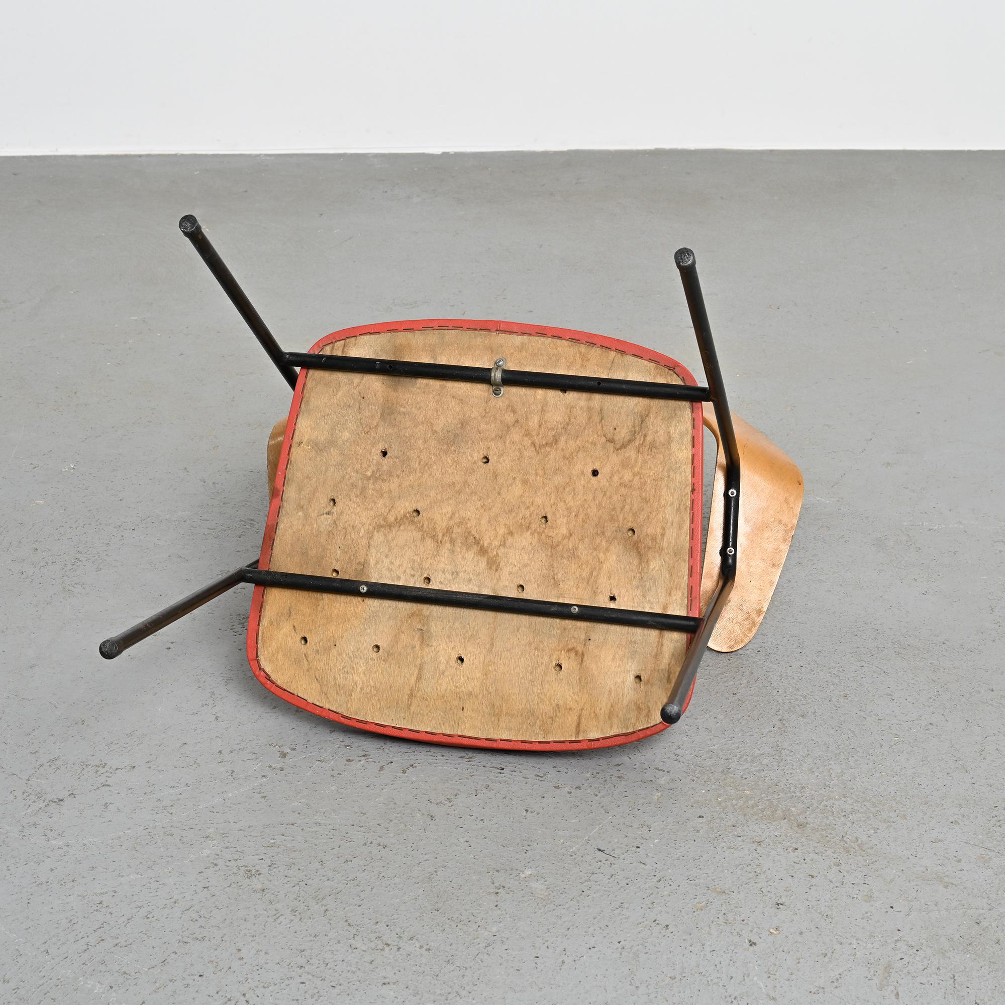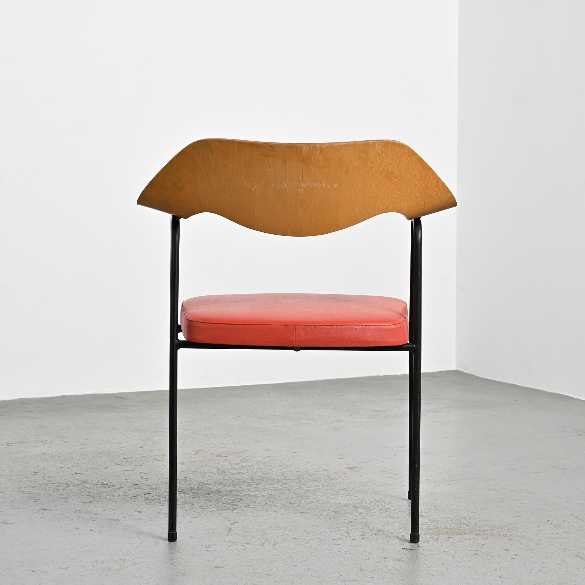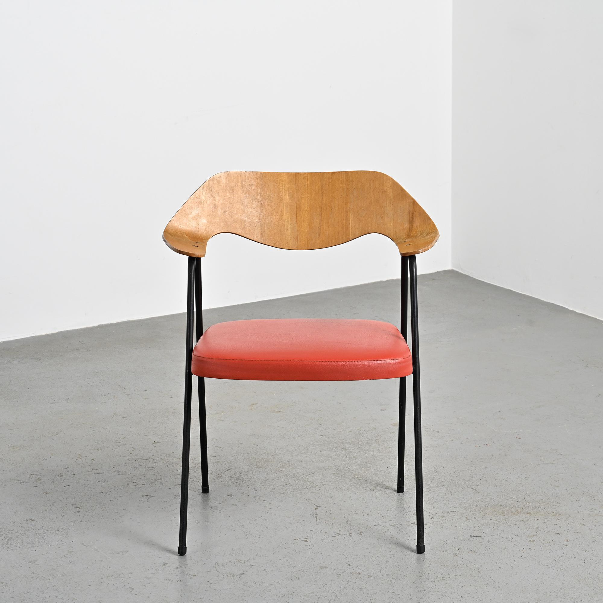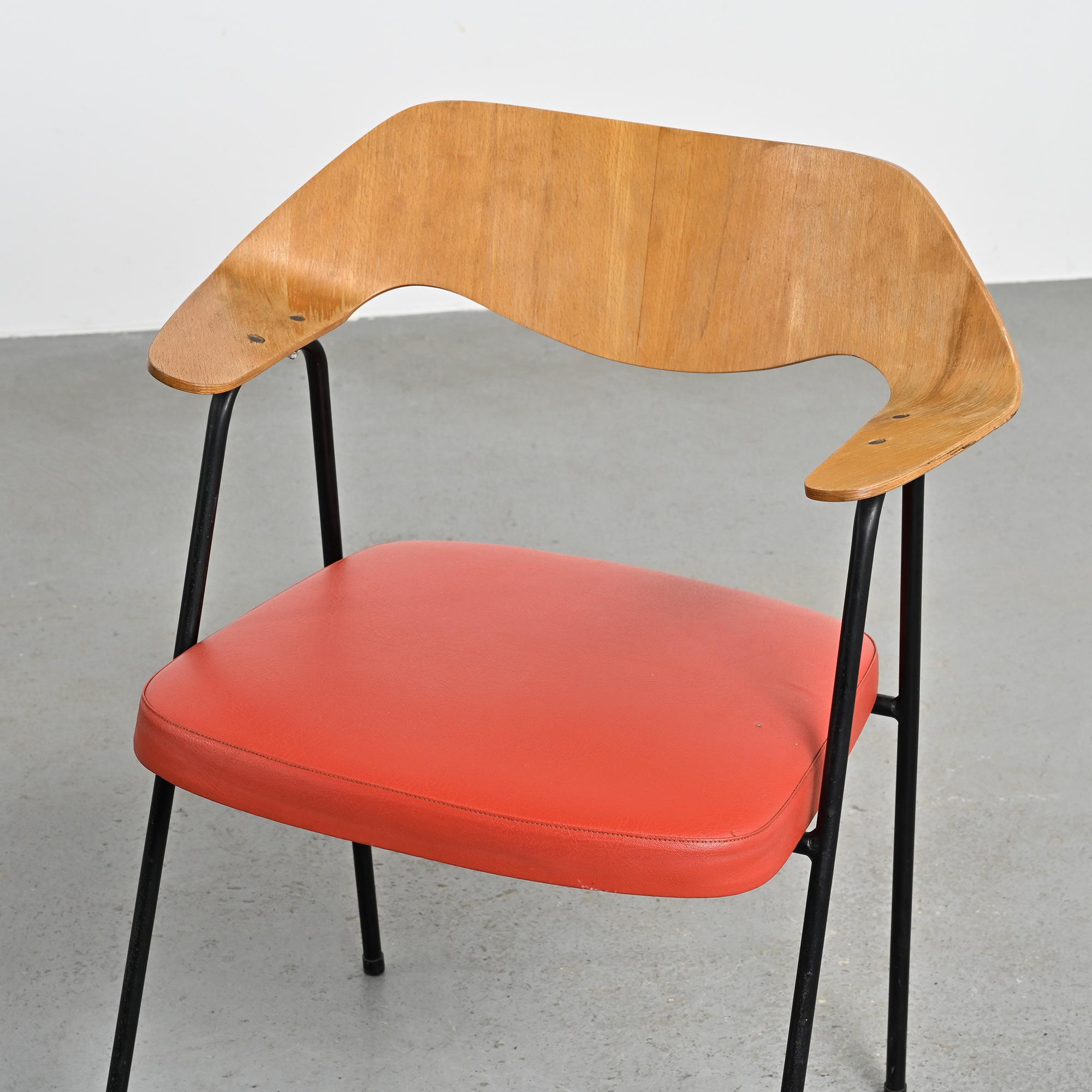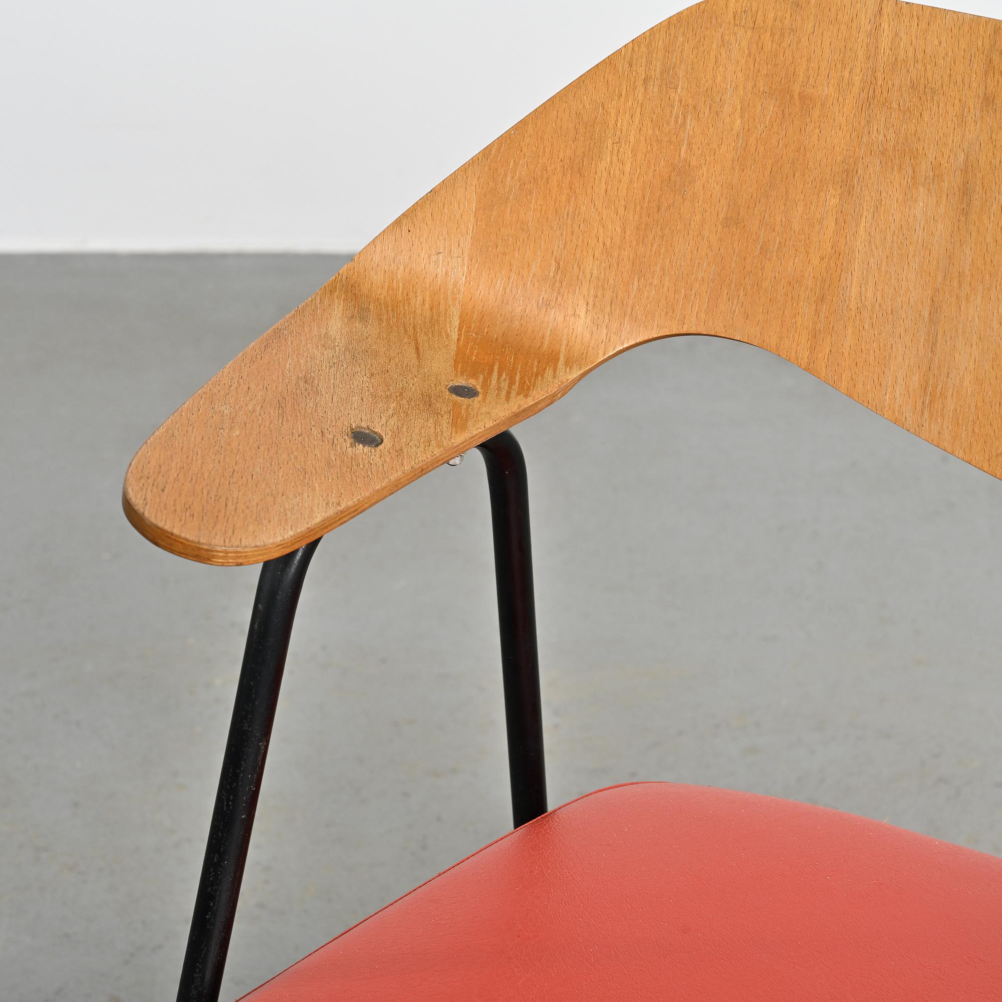 Chaque fauteuil repose sur une structure tubulaire en métal laqué noir formant un piétement fin et élancé. Le dossier, en bois moulé et contreplaqué cintré, constitue l'élément principal de la composition. Sa forme large et légèrement enveloppante assure le maintien du dos tout en dessinant une ligne fluide et structurée. L'assise seule est garnie de mousse et recouverte d'un simili cuir rouge. La hauteur d'assise est de 46 cm.