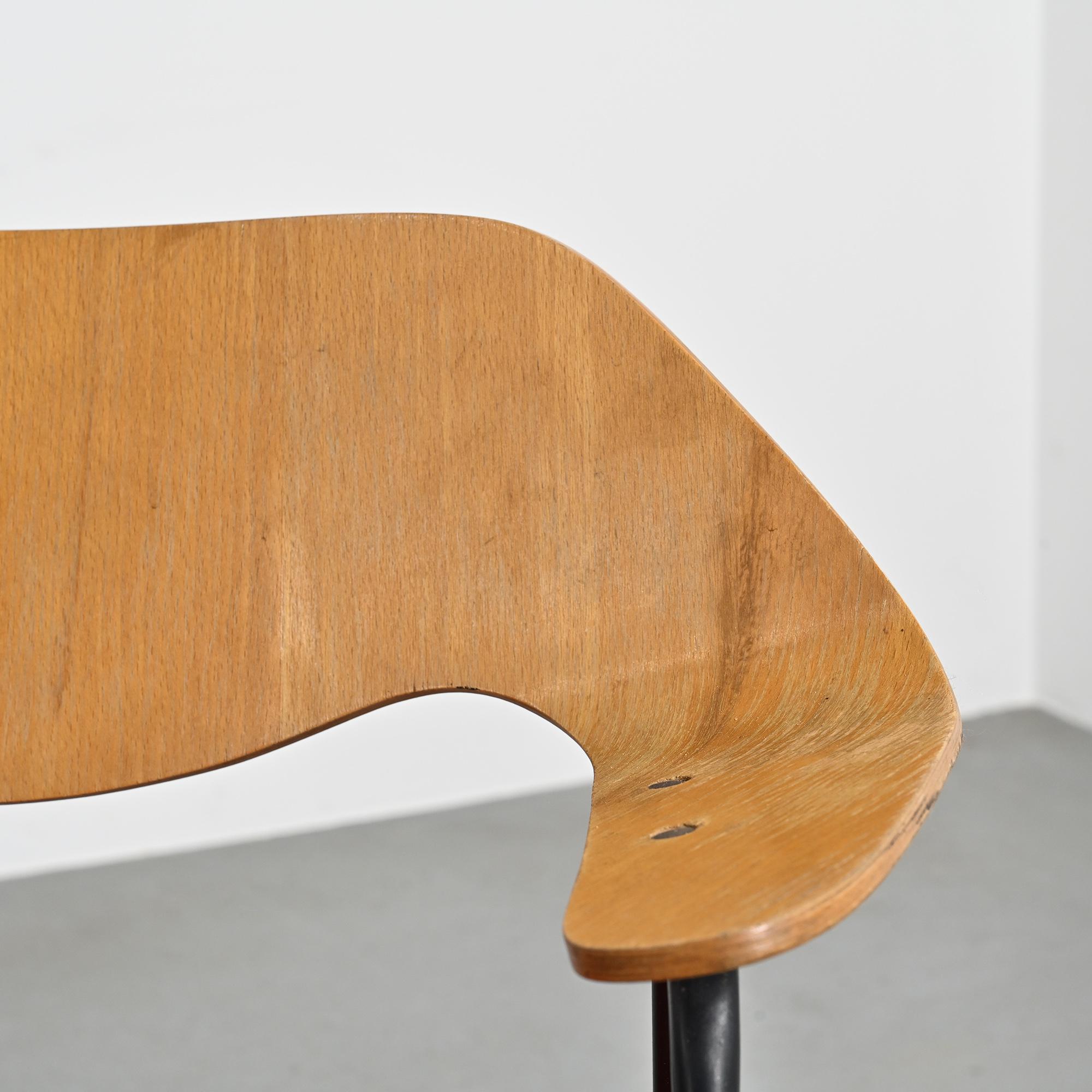 Le contraste entre la légèreté visuelle du piétement métallique, la présence sculpturale du dossier en bois moulé et la surface pleine de l'assise traduit l'esthétique moderniste développée par Robin et Lucienne Day dans les années 1950. Le modèle 675 s'inscrit dans cette recherche d'un mobilier rationnel, accessible et formellement affirmé.