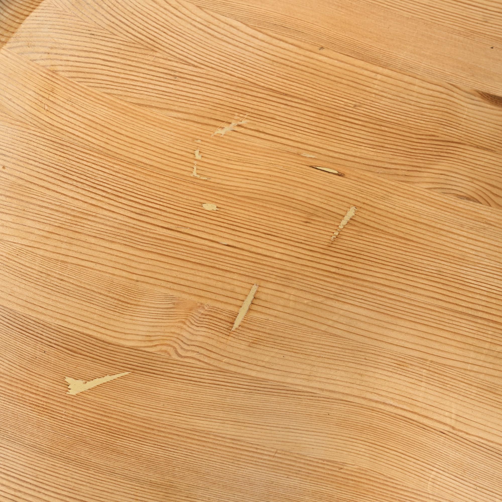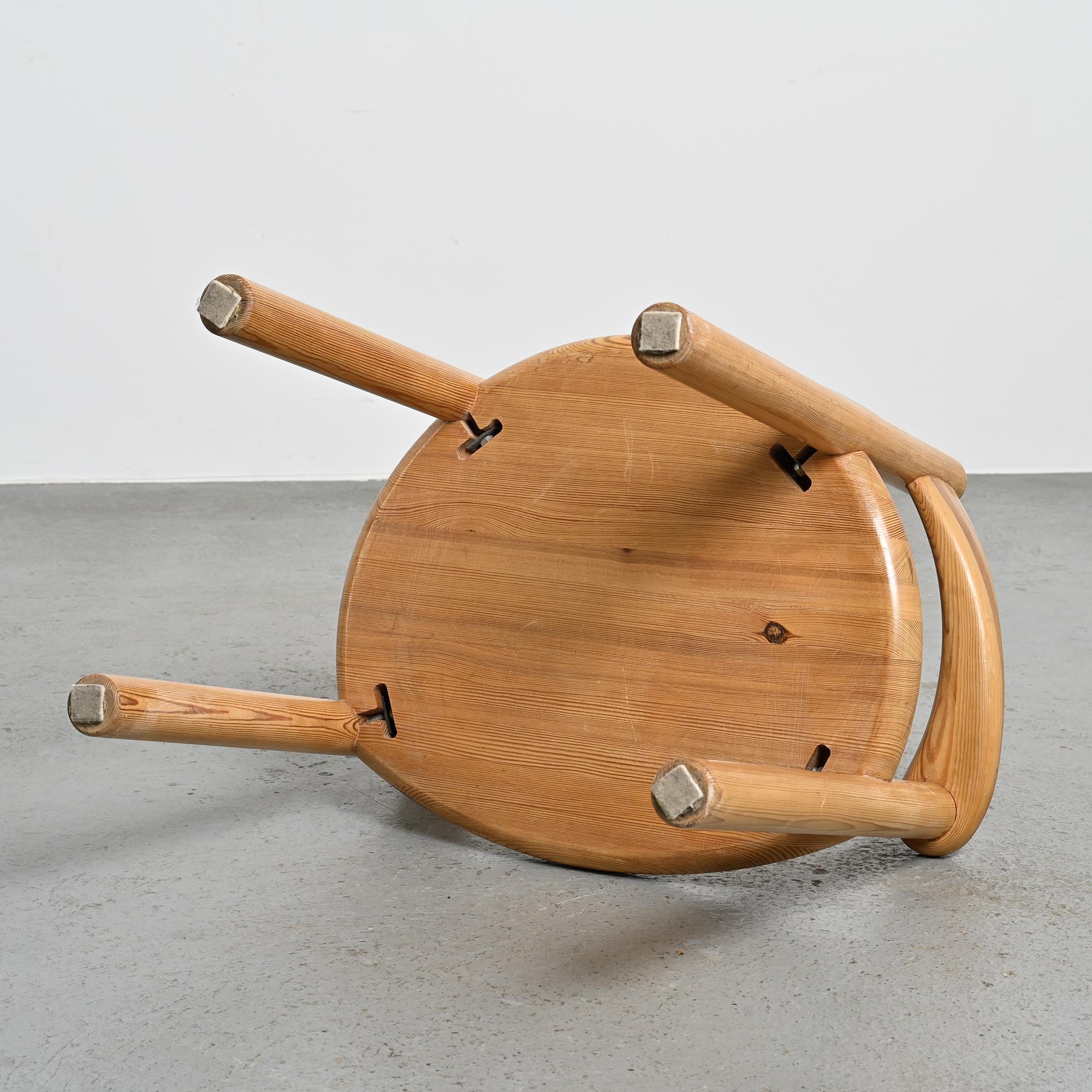 La structure est entièrement réalisée en pin massif, avec un dossier épais légèrement galbé venant s'emboîter dans des montants arrondis. L'assise circulaire, également en bois massif, repose sur un piétement robuste aux sections pleines et adoucies. Les lignes sont organiques, sans arêtes vives, privilégiant le confort et le contact direct avec la matière. Le veinage marqué du pin participe pleinement à l'identité du modèle.