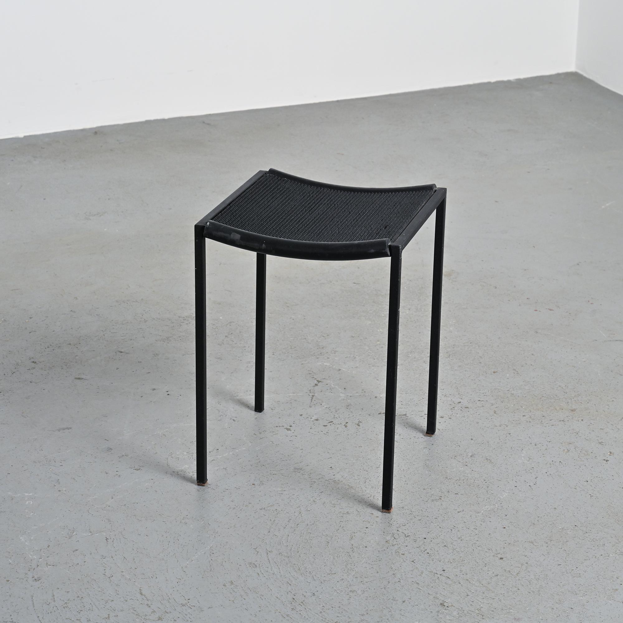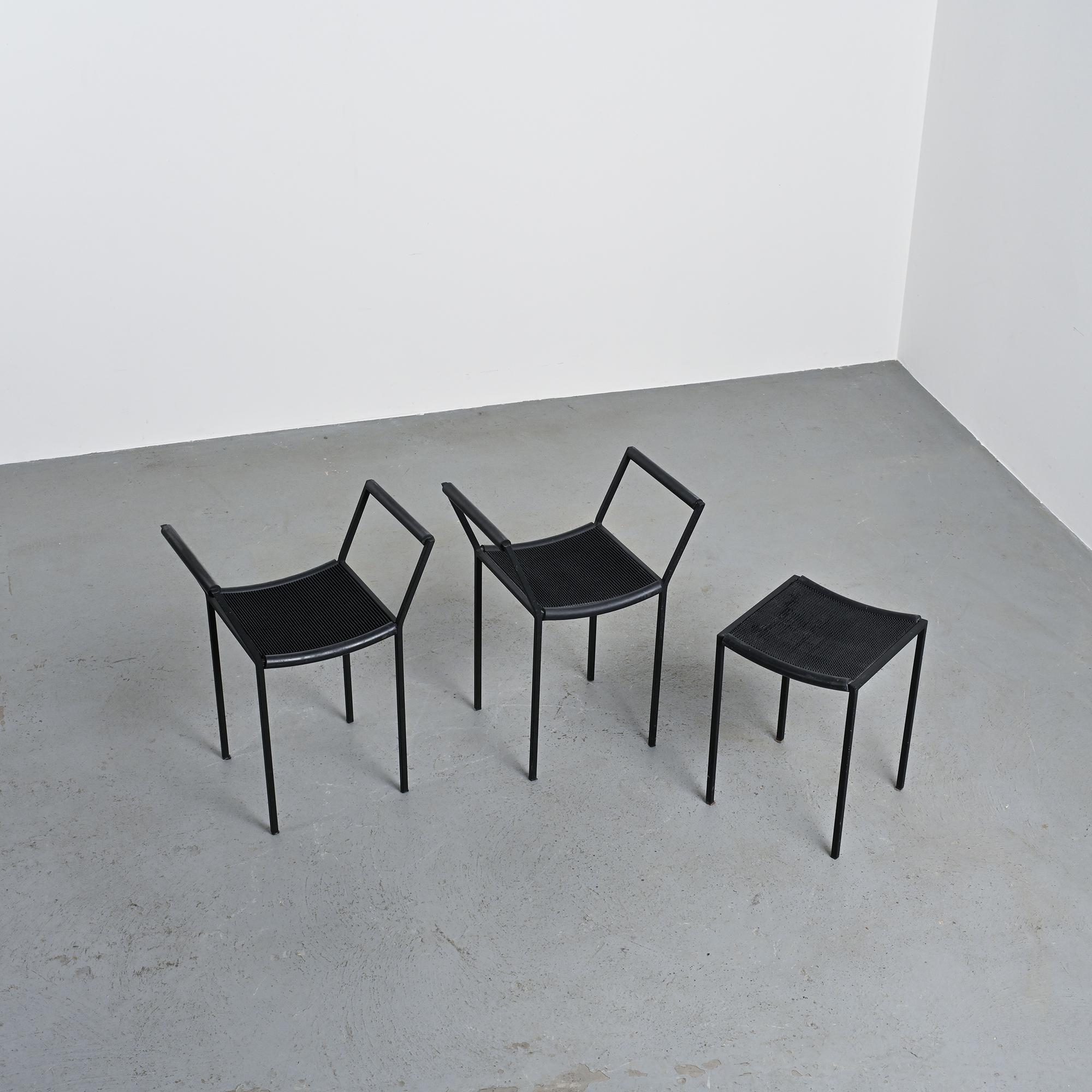 Chaque tabouret présente un piètement tripode en métal laqué noir, élément structurel emblématique de la série Millepunte. L'assise est constituée d'une bande en gomme tendue, reliant les points porteurs et affirmant une approche volontairement industrielle du mobilier. Le dessin repose sur une économie de moyens, associant légèreté visuelle, stabilité et lisibilité structurelle. Le contraste entre la rigidité du métal et la souplesse de la gomme participe à l'identité radicale de l'ensemble.