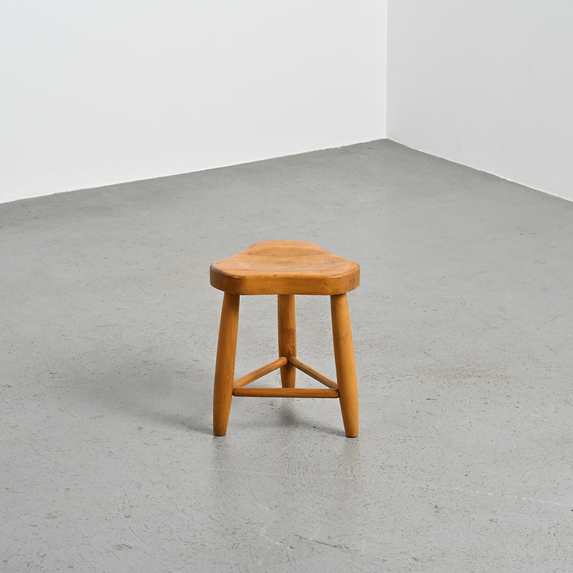 Tabouret bas tripode à assise de forme trèfle en chêne par Christian Durupt, ébéniste qui a collaboré avec Charlotte Perriand sur l'aménagement des Arcs.