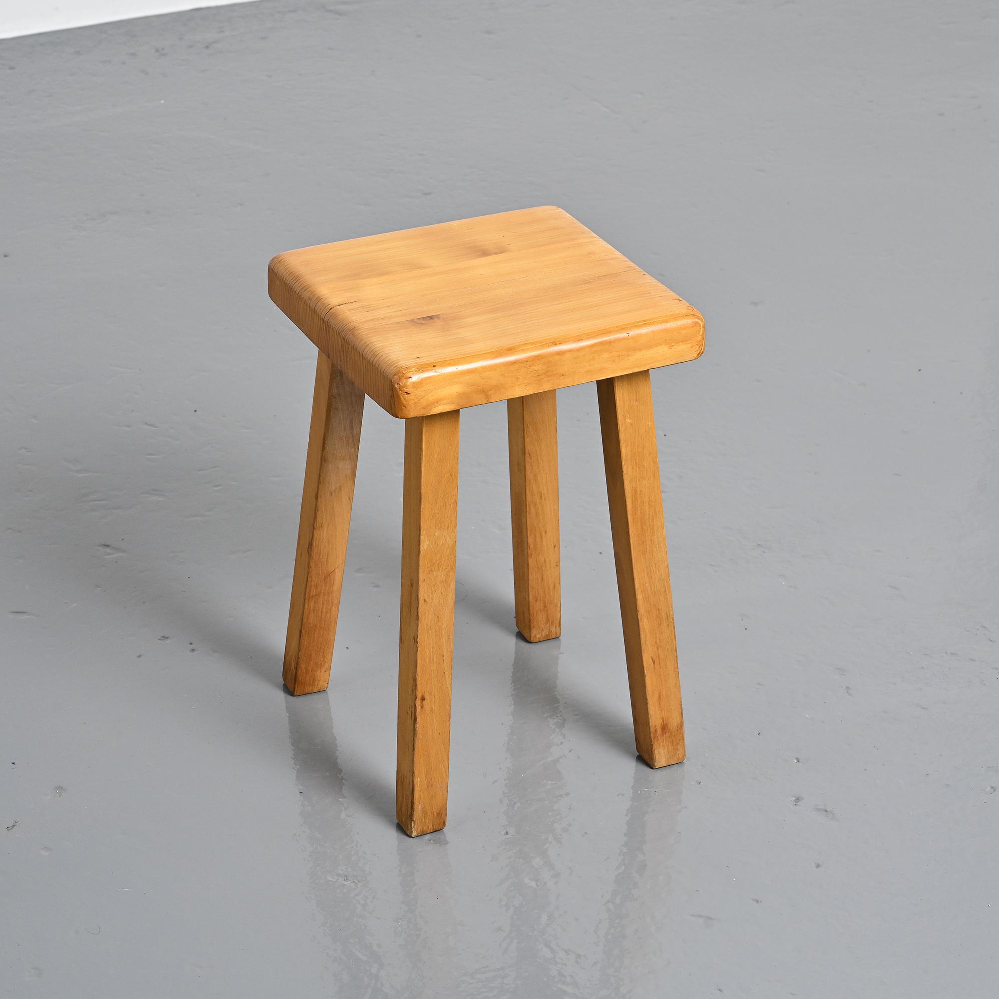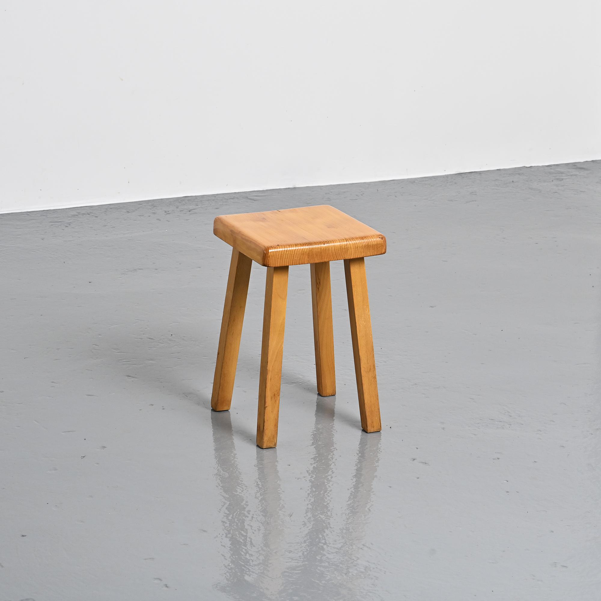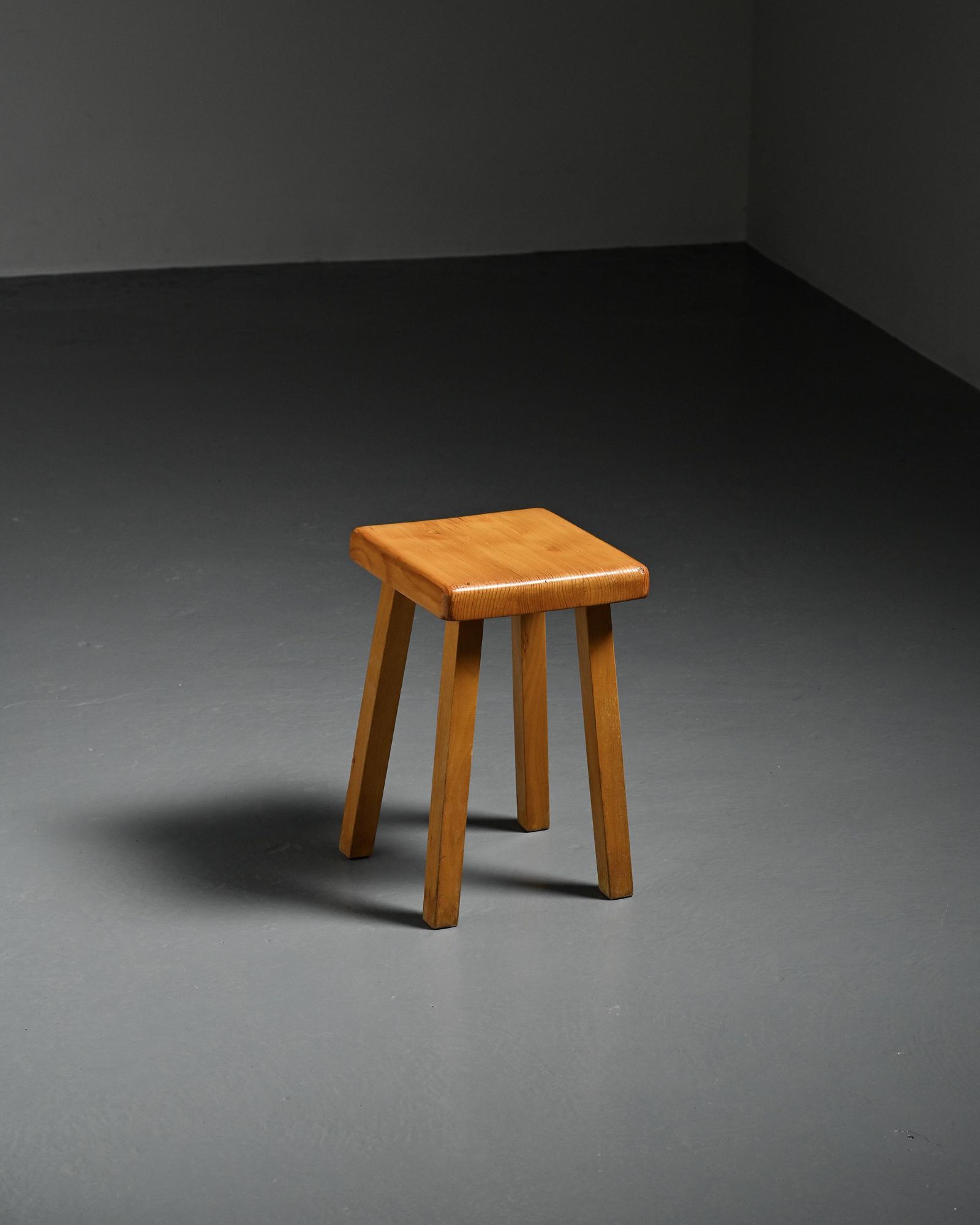 Tabouret en pin massif à assise carrée et piétement quadripode. Il a été dessiné pour la station de ski des Arcs, à laquelle Charlotte Perriand, passionnée de montagne, a contribué pendant près de 20 ans.