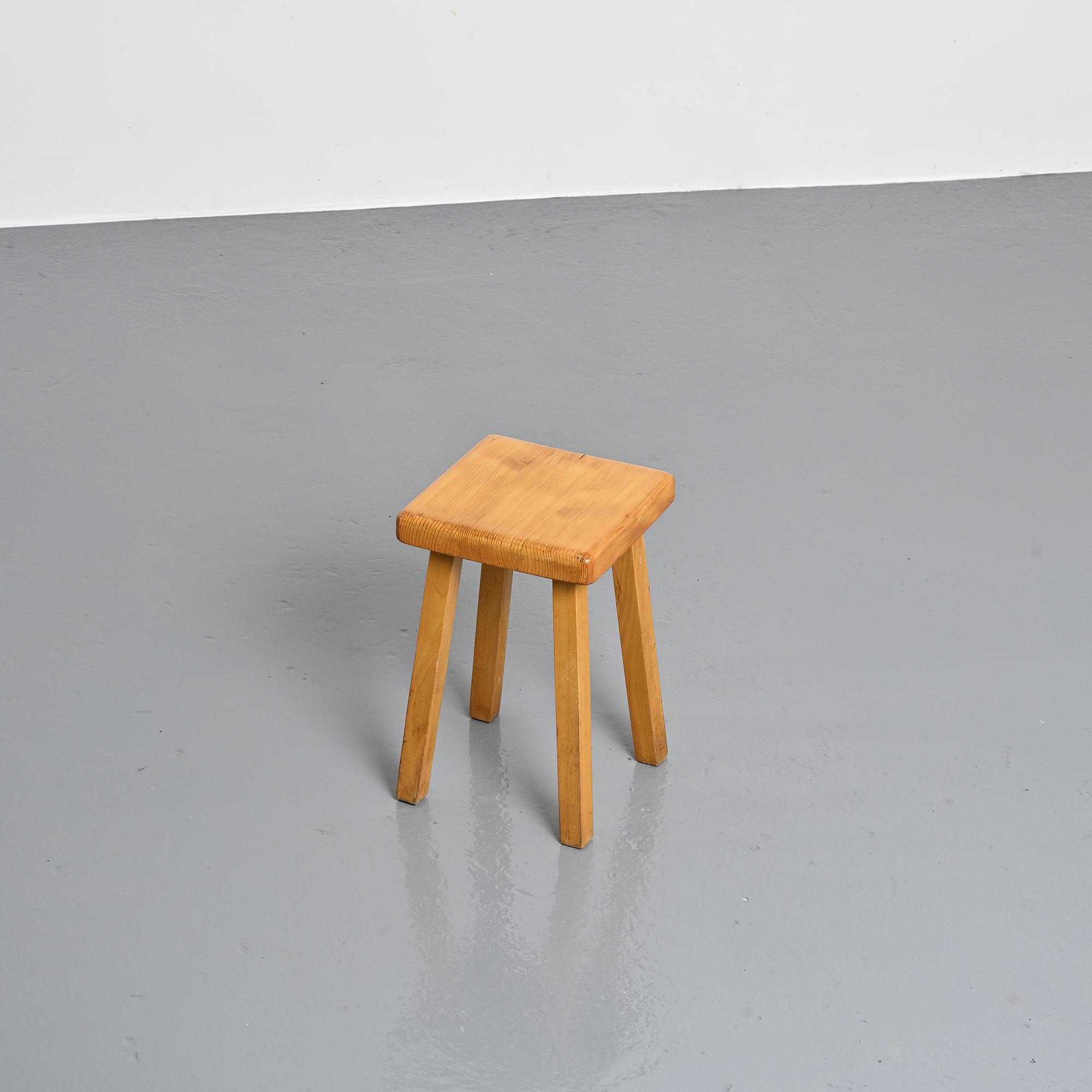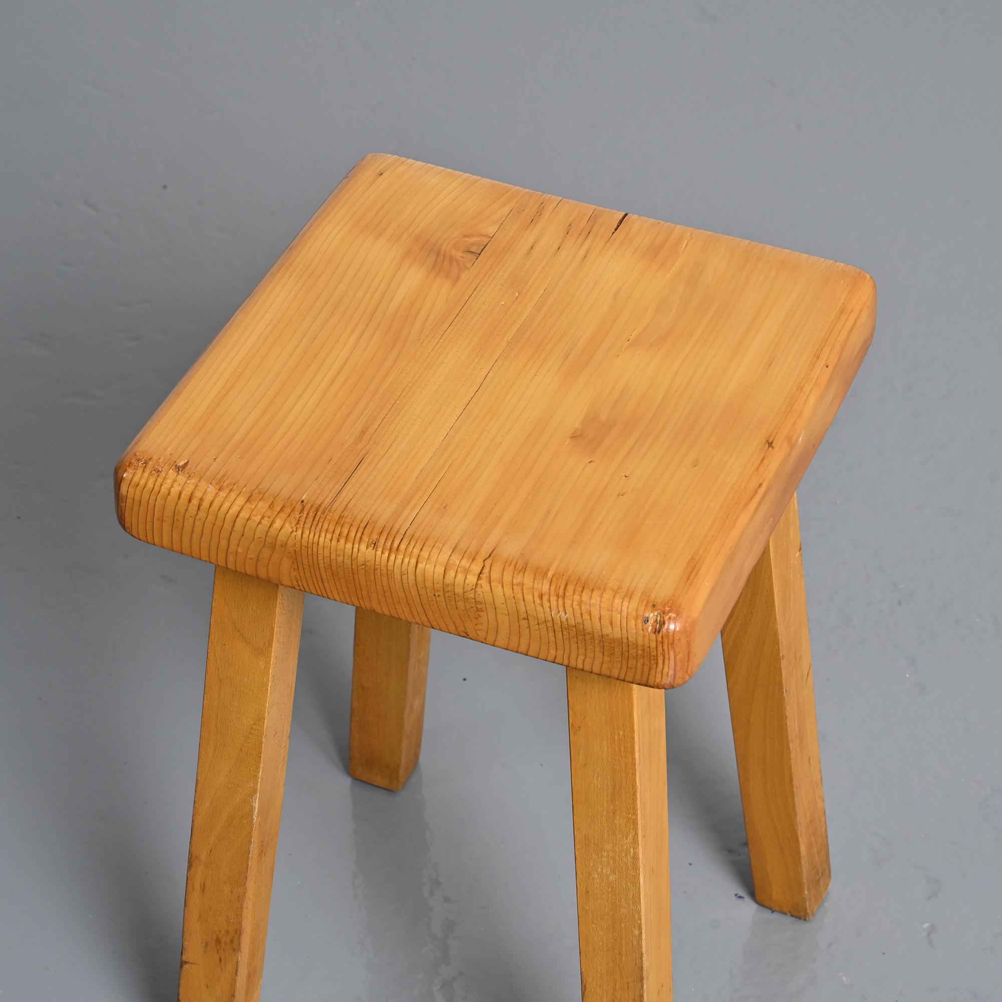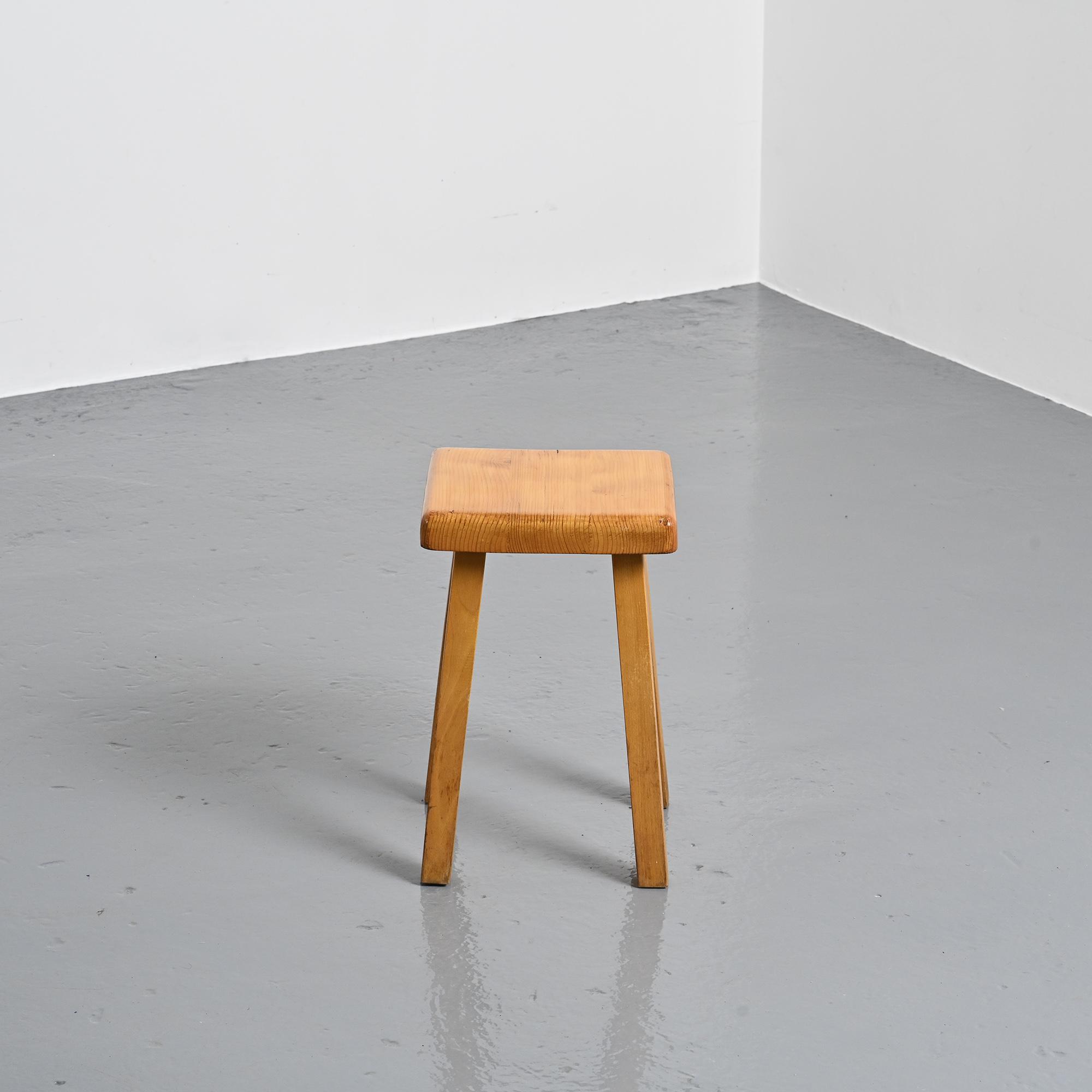 Tabouret en pin massif à assise carrée et piétement quadripode. Il a été dessiné pour la station de ski des Arcs, à laquelle Charlotte Perriand, passionnée de montagne, a contribué pendant près de 20 ans.