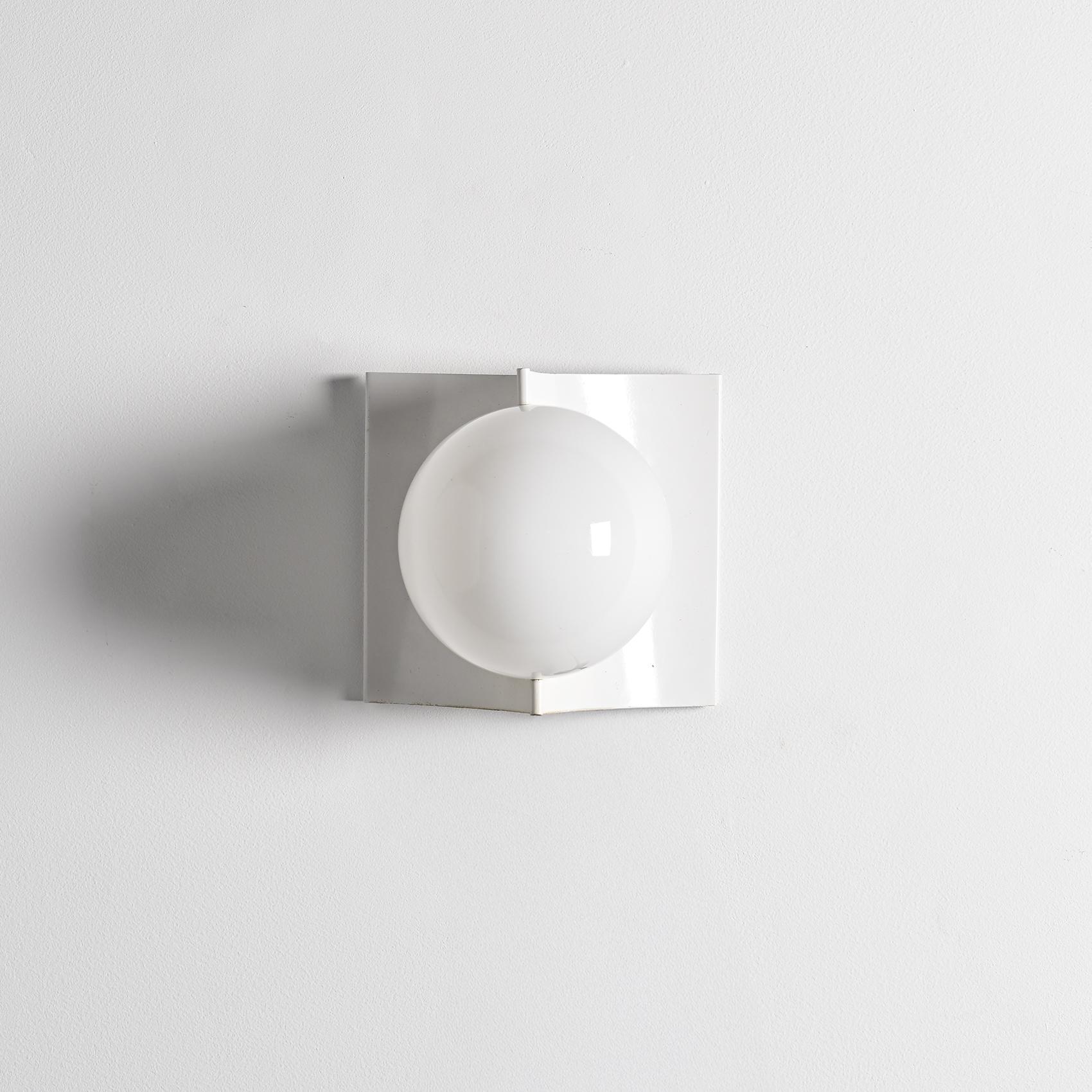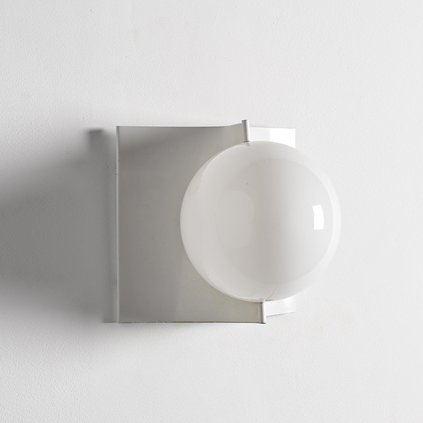 Composée d'un support en tôle pliée laquée blanc et d'un diffuseur sphérique en verre opalin, cette applique illustre l'esthétique épurée du design des années 1970. La lumière, adoucie par l'opaline, se réfléchit sur la base métallique pour créer un halo diffus et chaleureux.