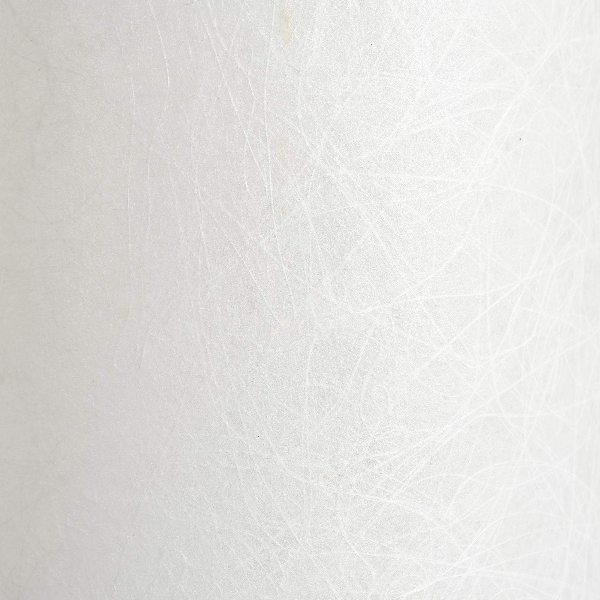 Diffuseur cylindrique en papier de riz monté sur une structure en métal laqué noir reposant sur un piétement tripode. La matière fibreuse du papier filtre la lumière et crée une diffusion douce et homogène. L'ensemble présente une silhouette épurée, caractéristique des luminaires européens de la période.