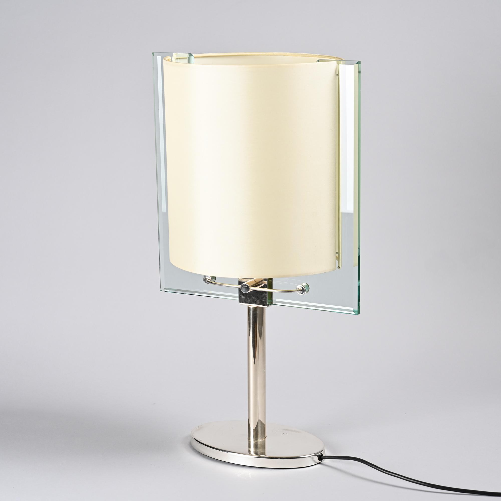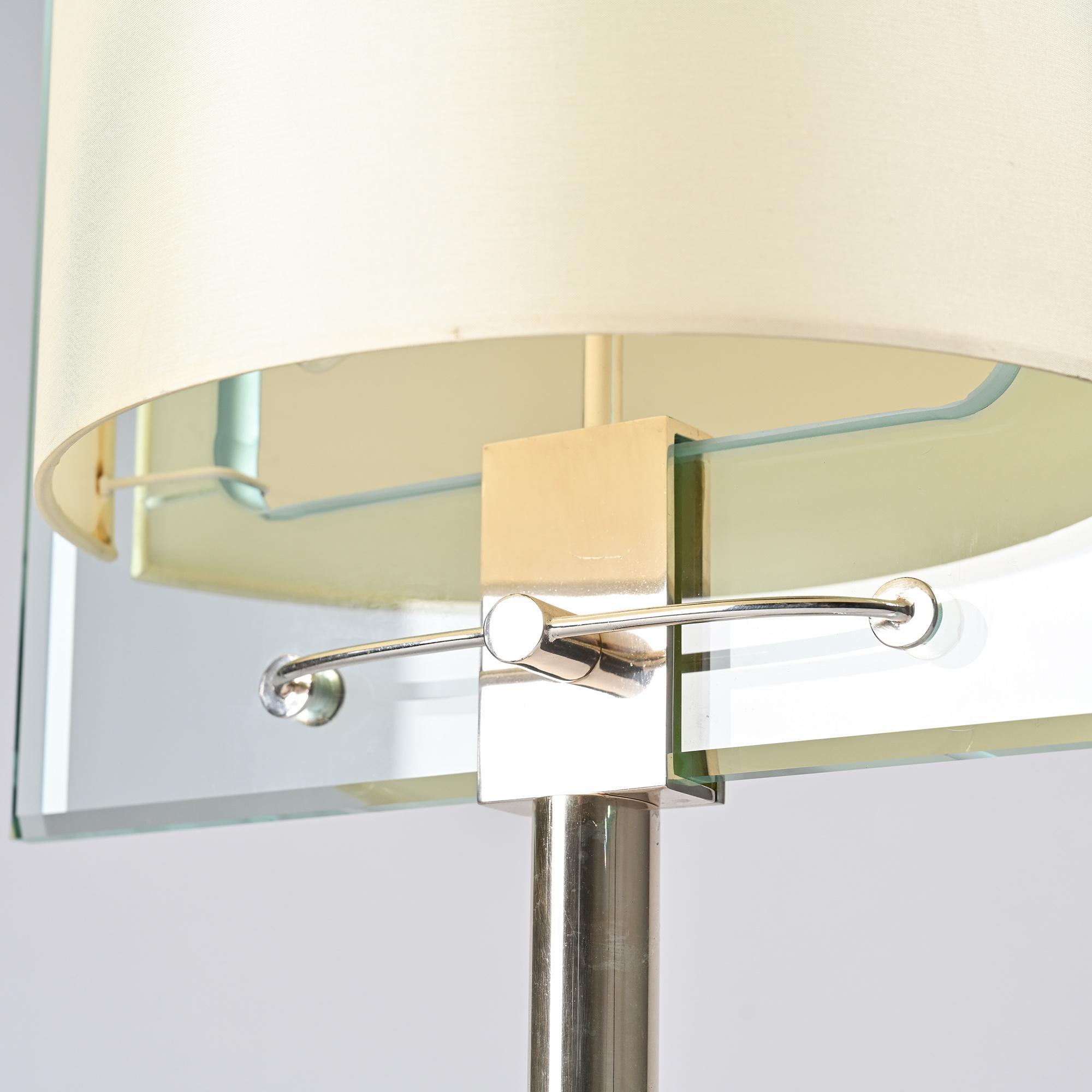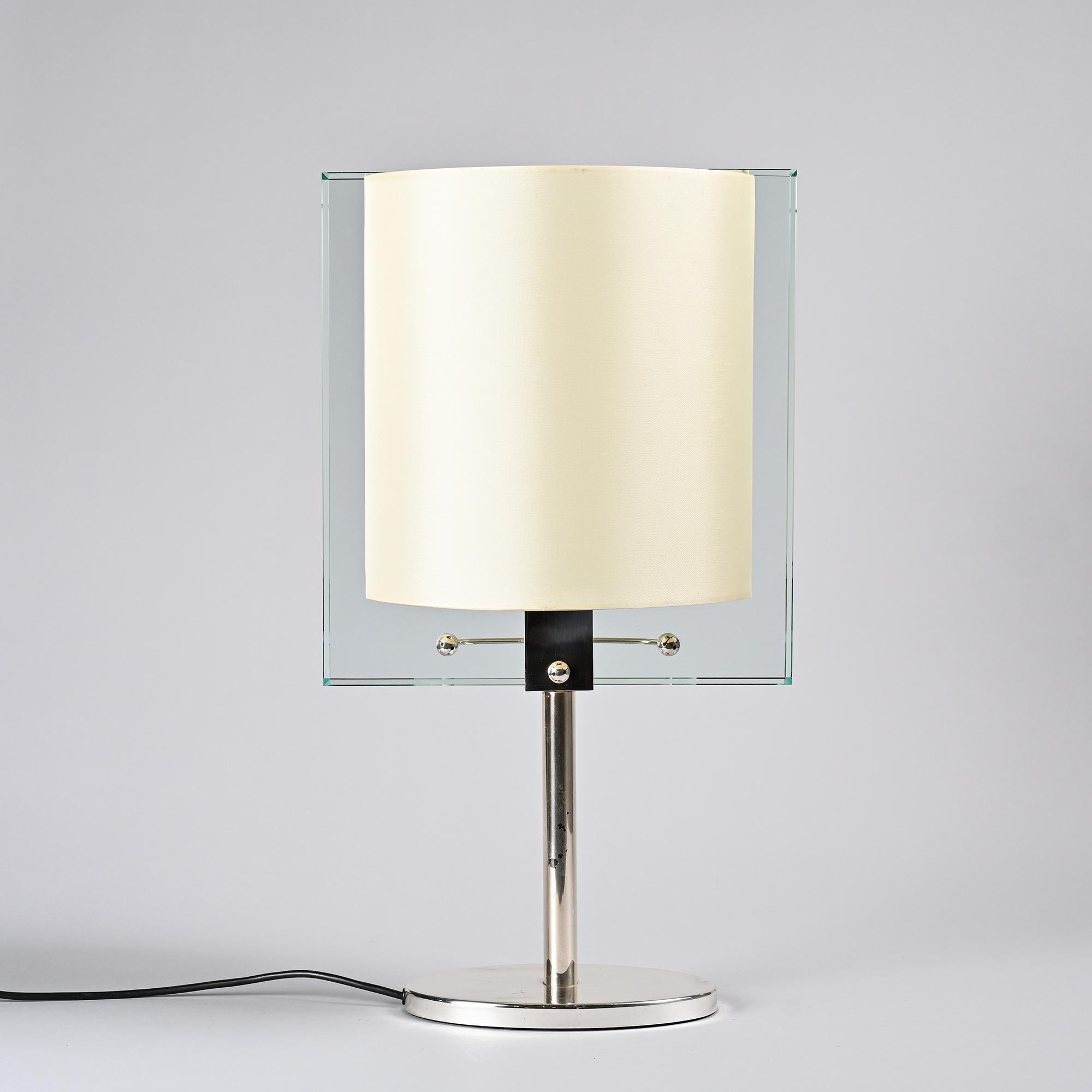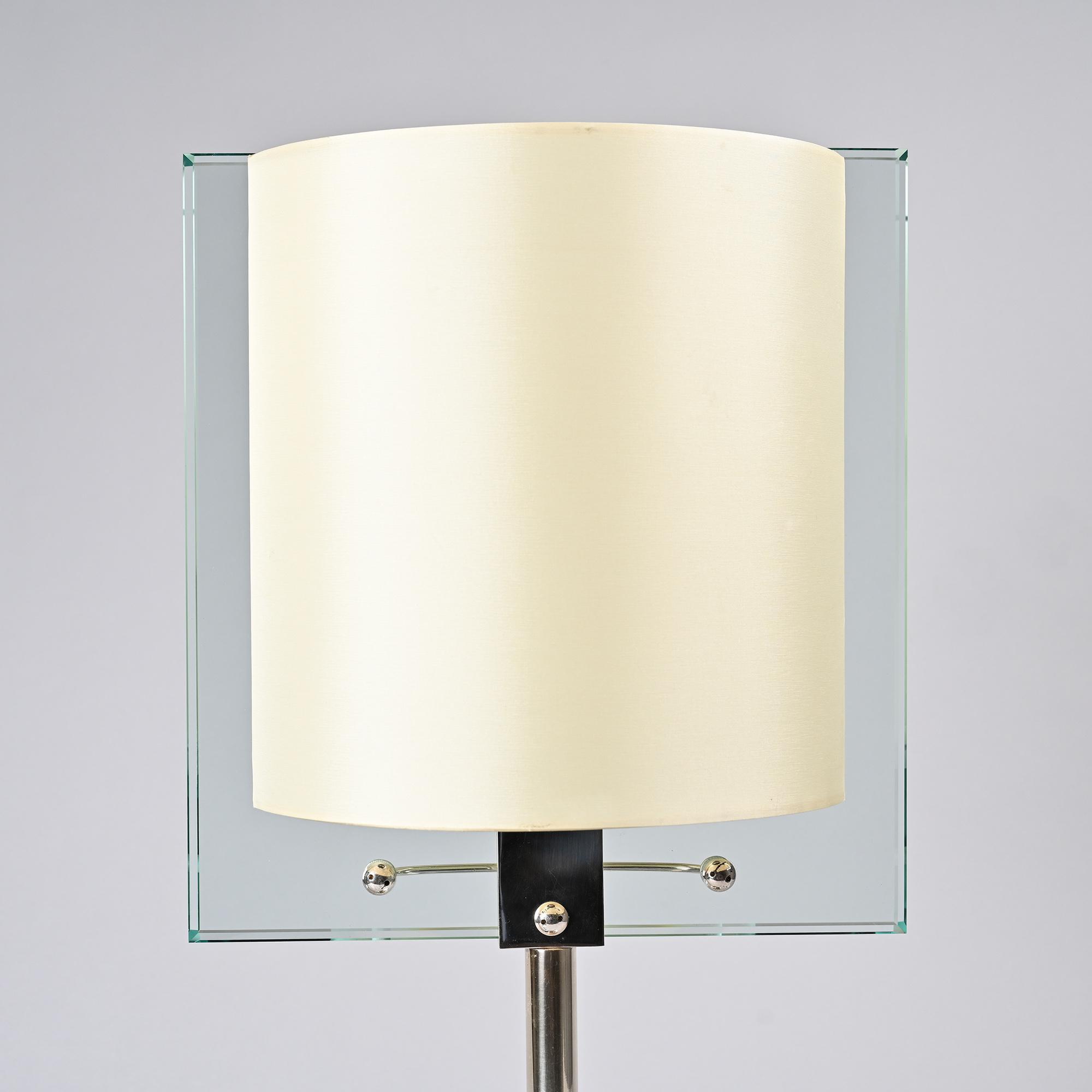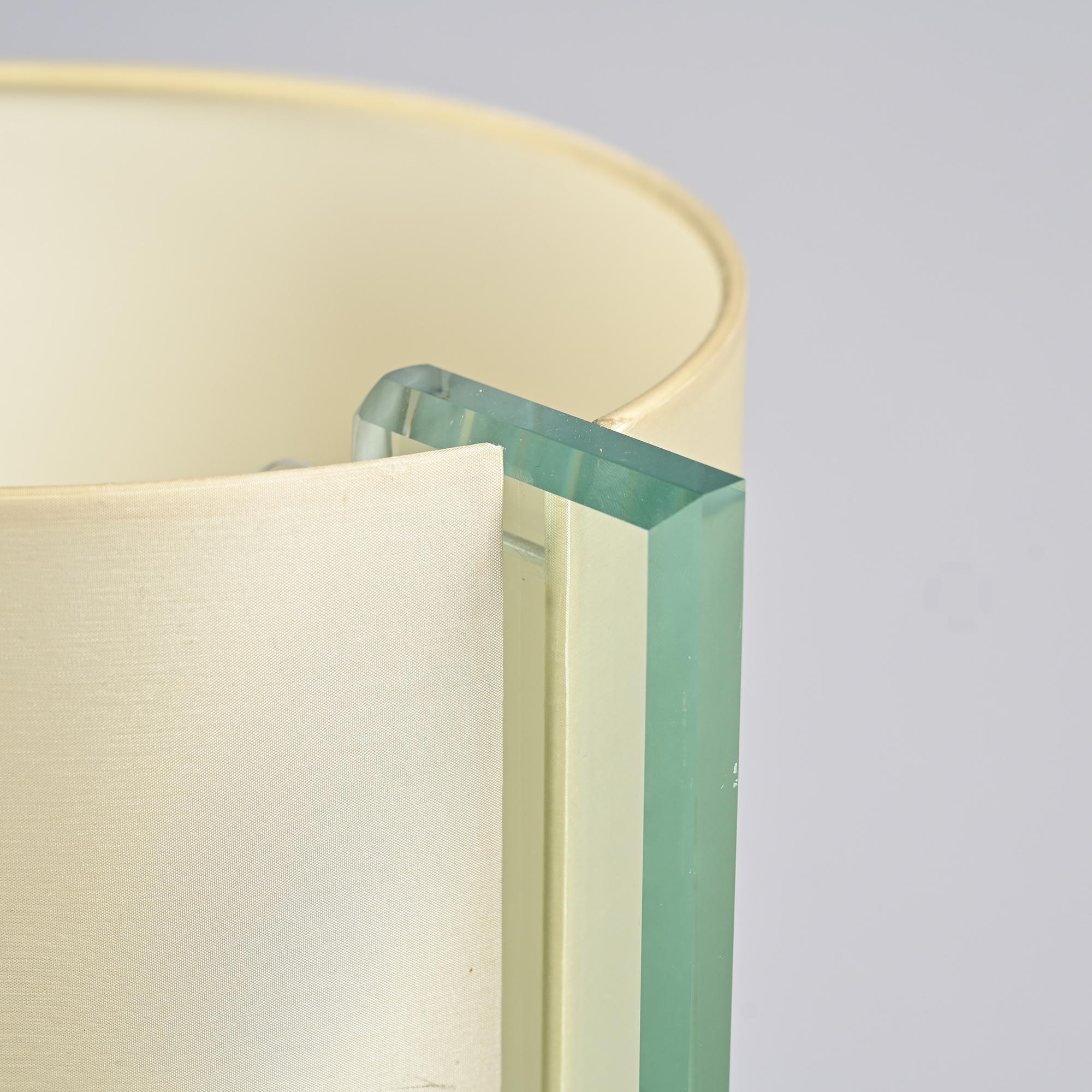La base circulaire en métal chromé supporte un fût cylindrique élancé. L'abat-jour cylindrique en tissu clair est encadré par deux plaques verticales en verre épais transparent, fixées par des supports métalliques discrets. L'ensemble joue sur la superposition des matériaux, entre transparence du verre, réflexion du chrome et douceur textile.