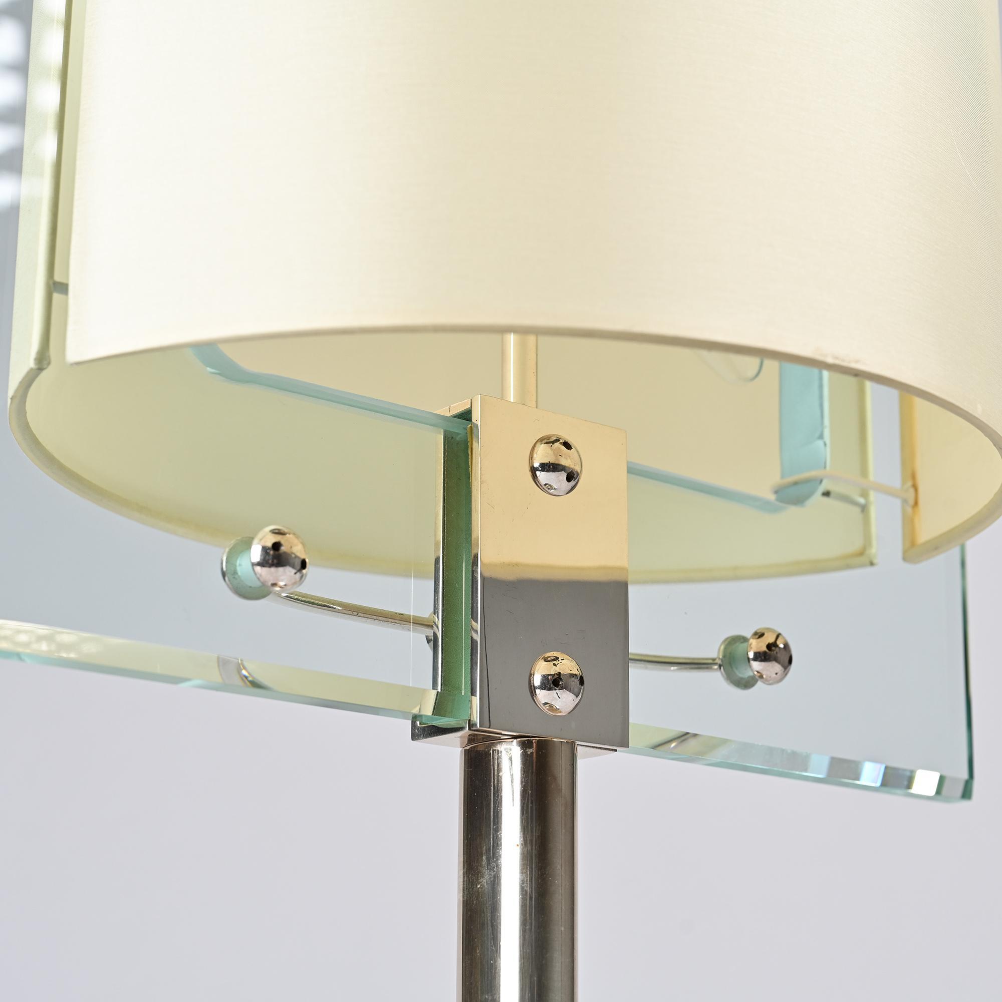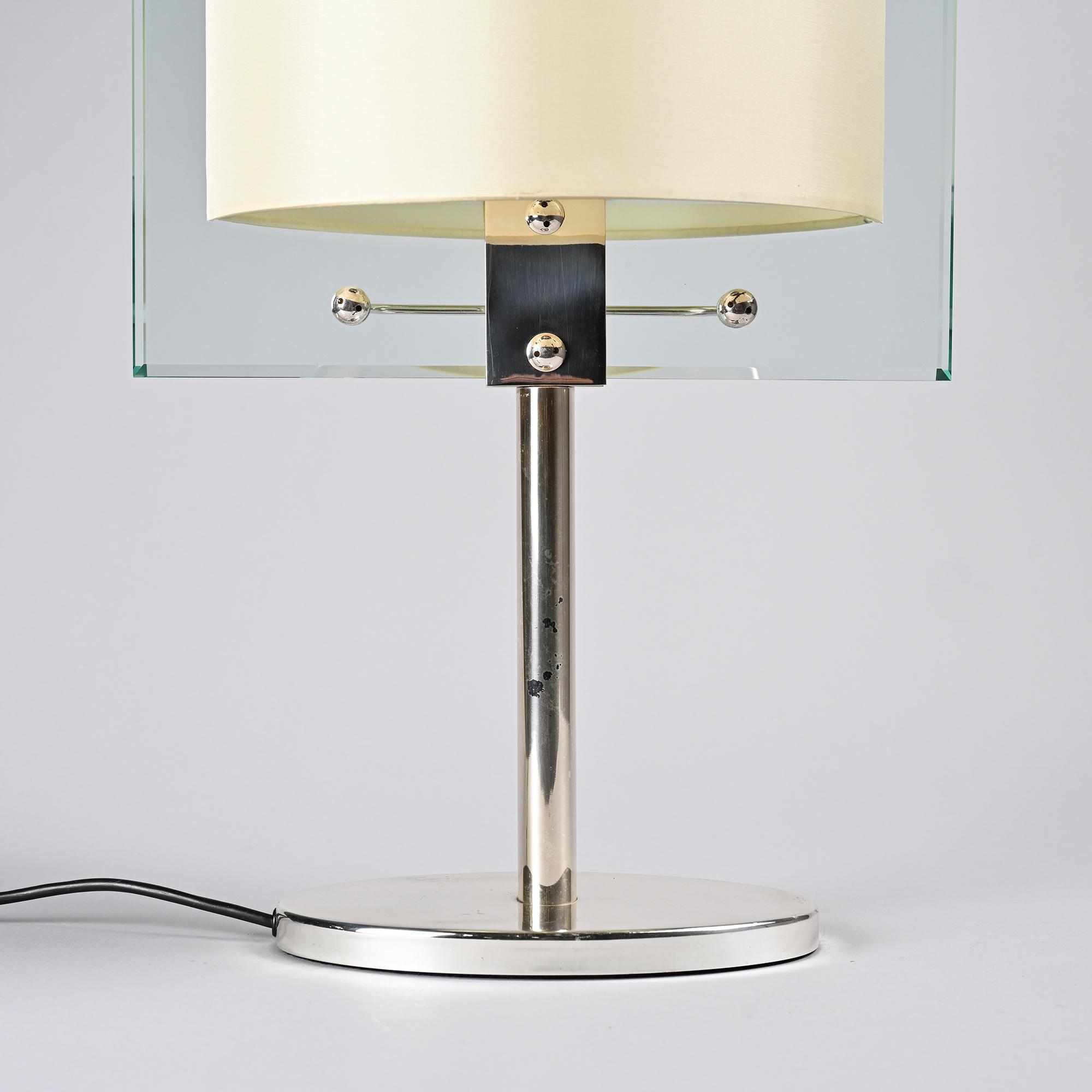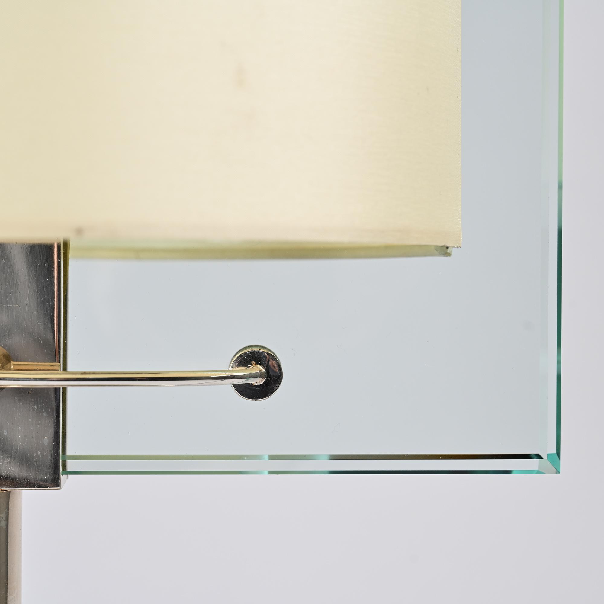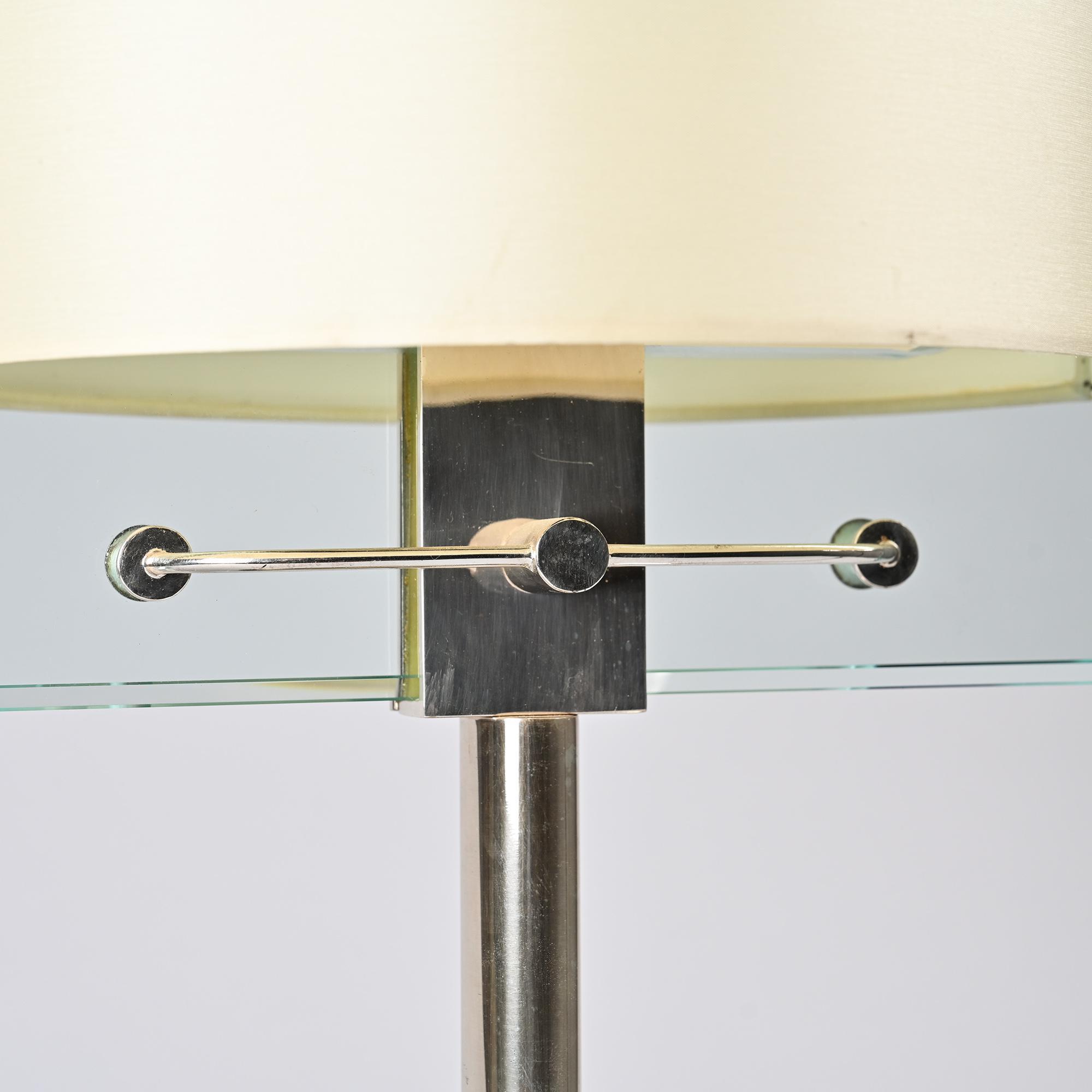 La base circulaire en métal chromé supporte un fût cylindrique élancé. L'abat-jour cylindrique en tissu clair est encadré par deux plaques verticales en verre épais transparent, fixées par des supports métalliques discrets. L'ensemble joue sur la superposition des matériaux, entre transparence du verre, réflexion du chrome et douceur textile.