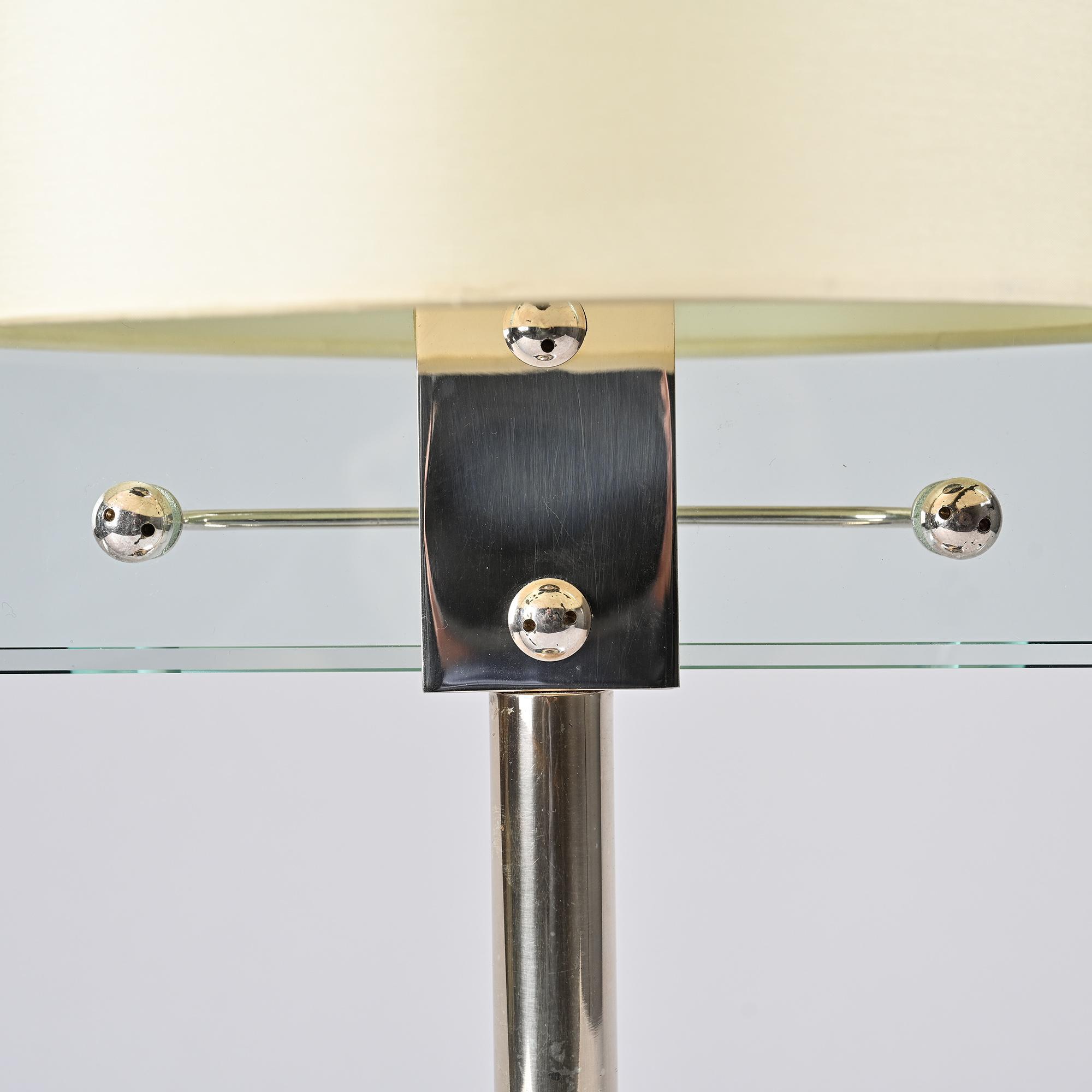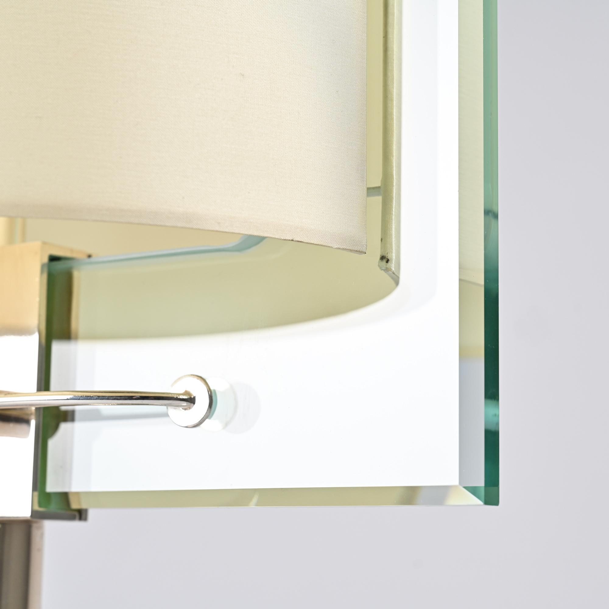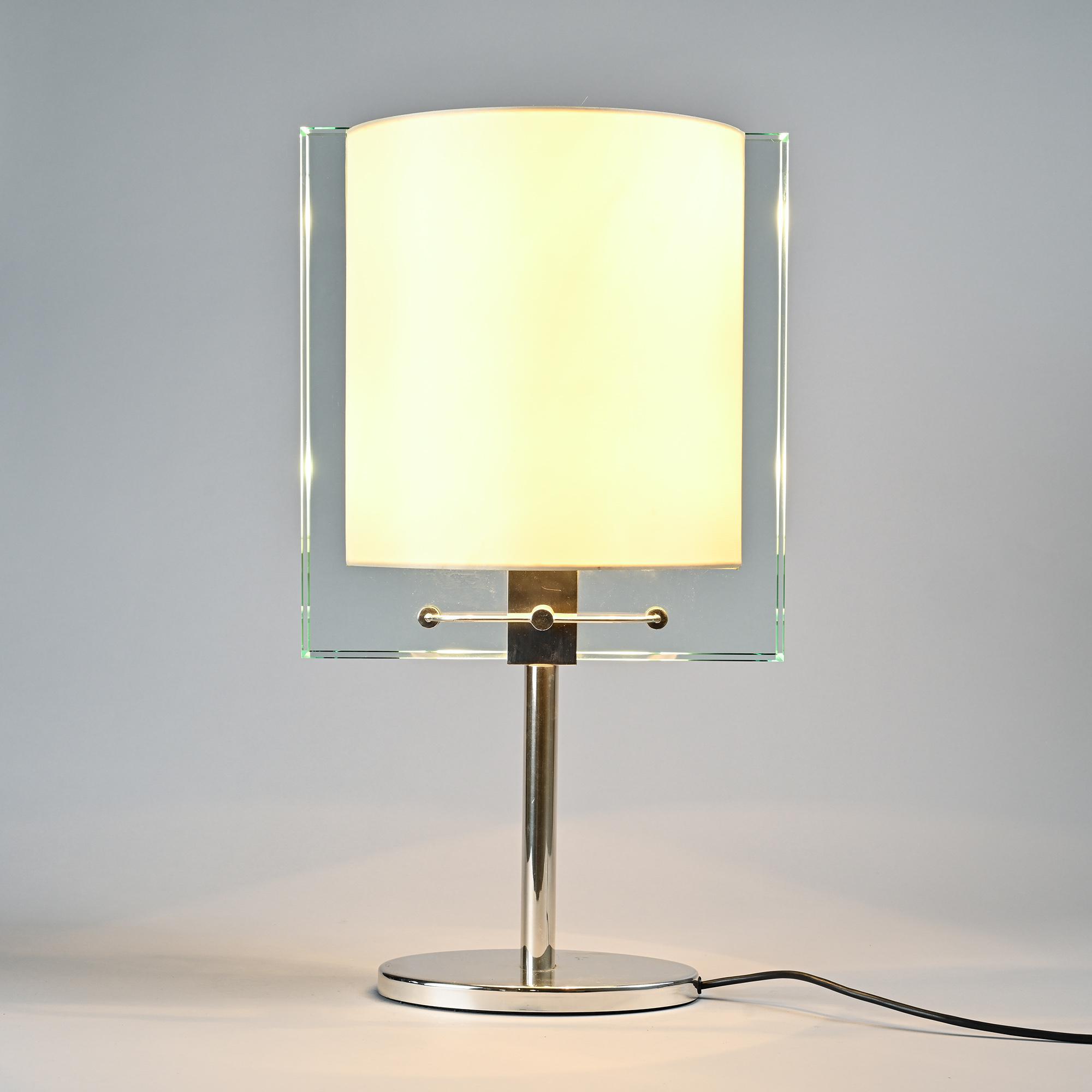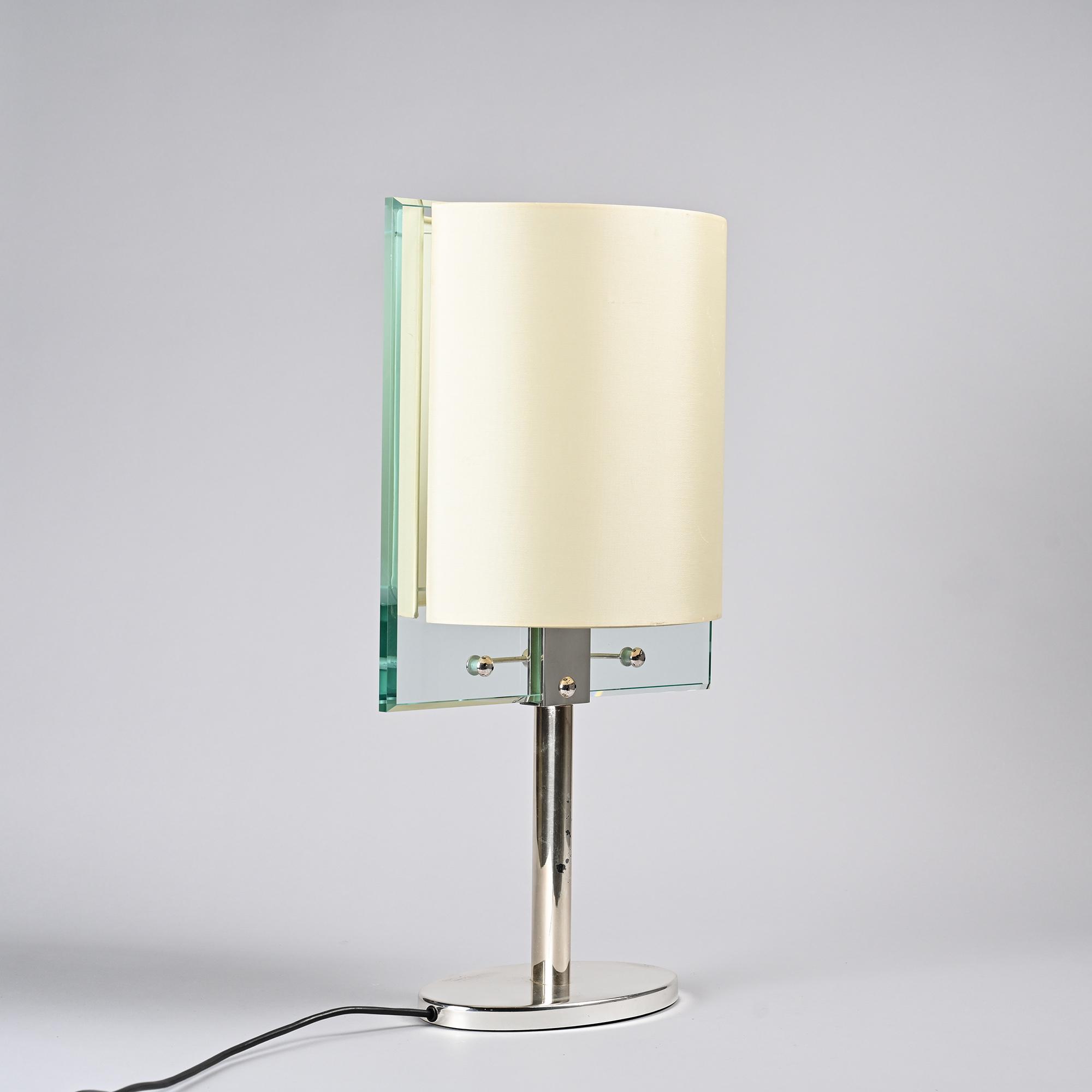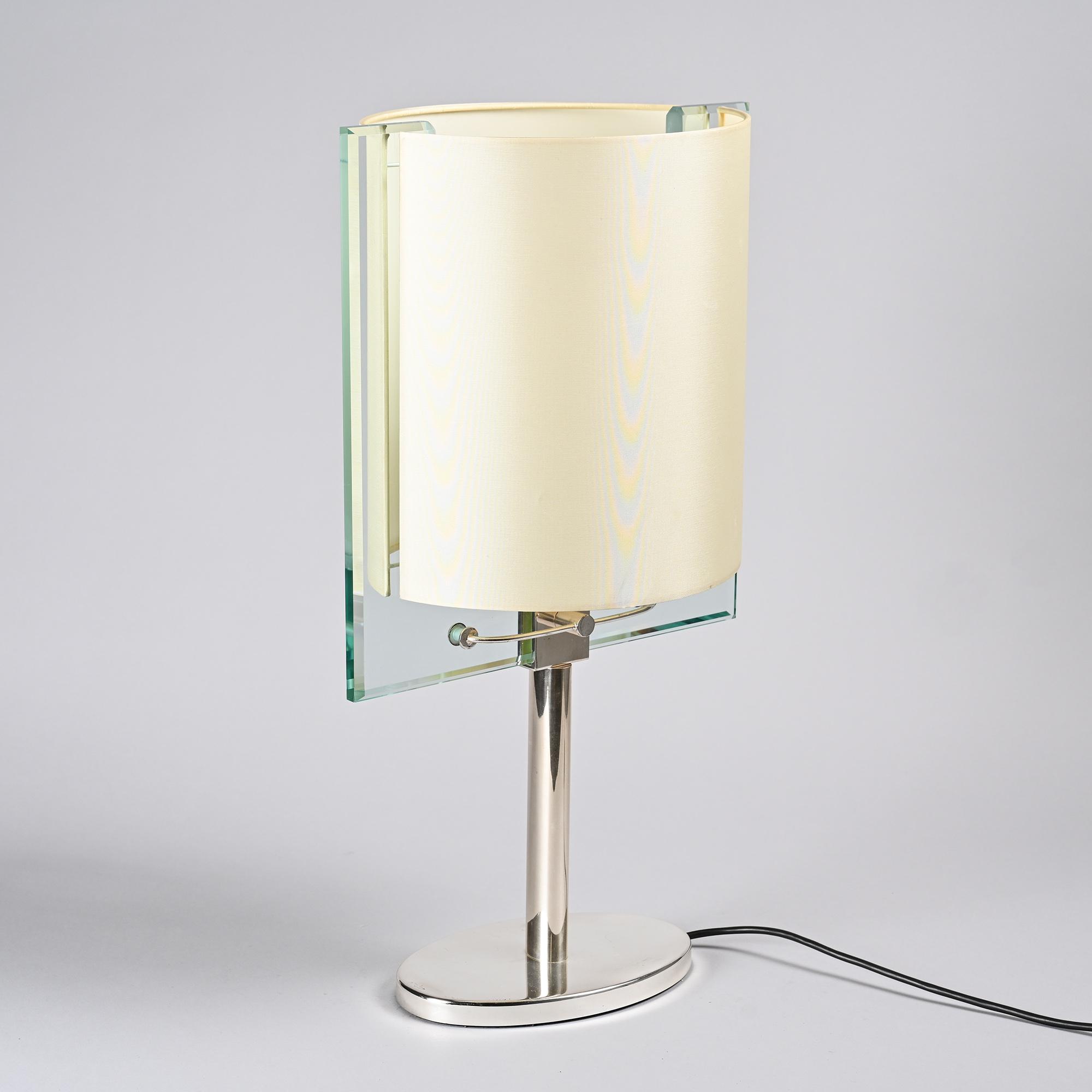 La base circulaire en métal chromé supporte un fût cylindrique élancé. L'abat-jour cylindrique en tissu clair est encadré par deux plaques verticales en verre épais transparent, fixées par des supports métalliques discrets. L'ensemble joue sur la superposition des matériaux, entre transparence du verre, réflexion du chrome et douceur textile.